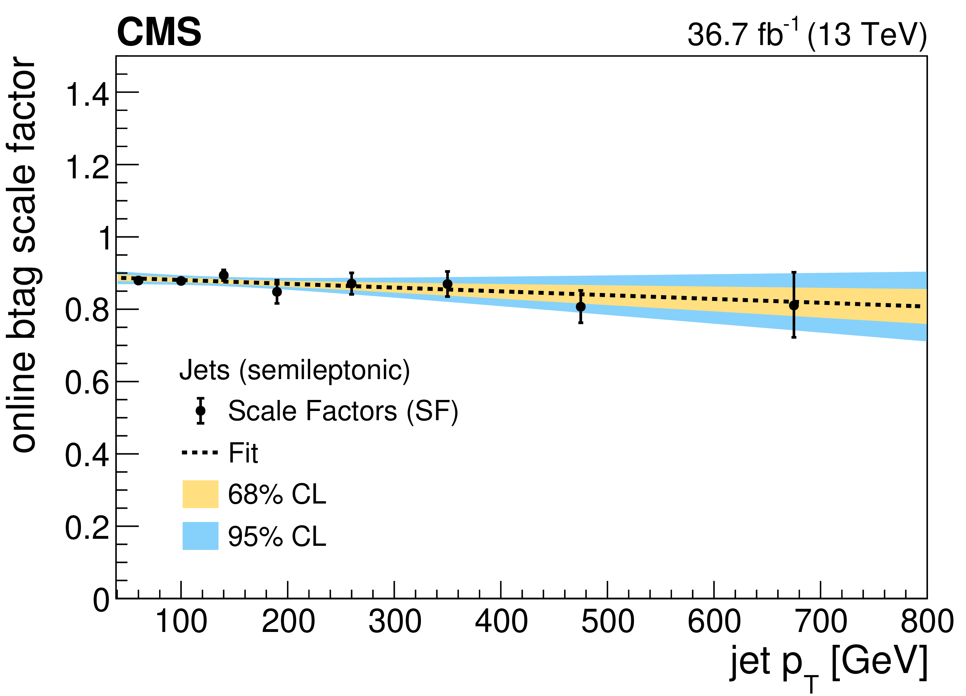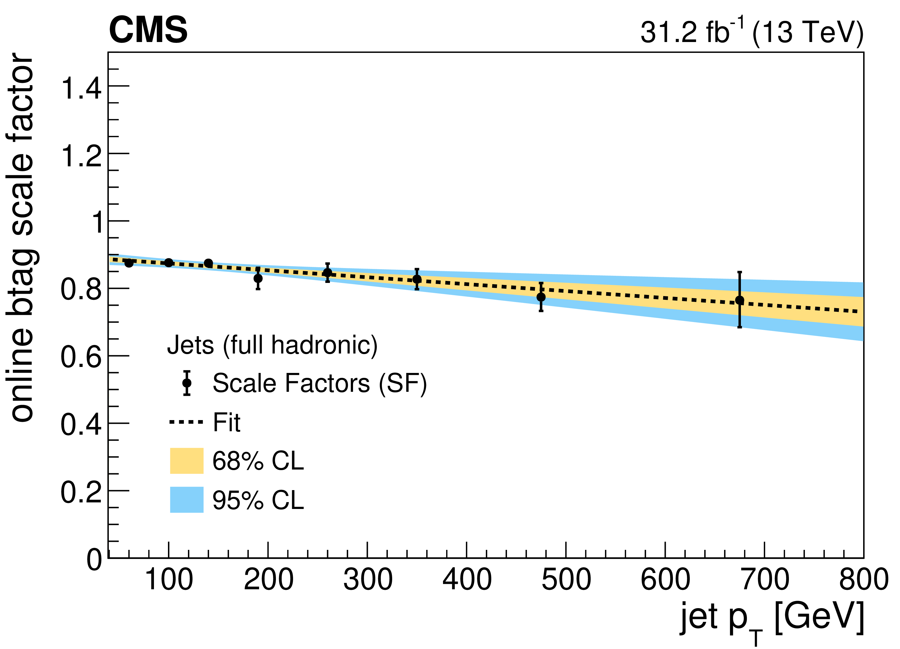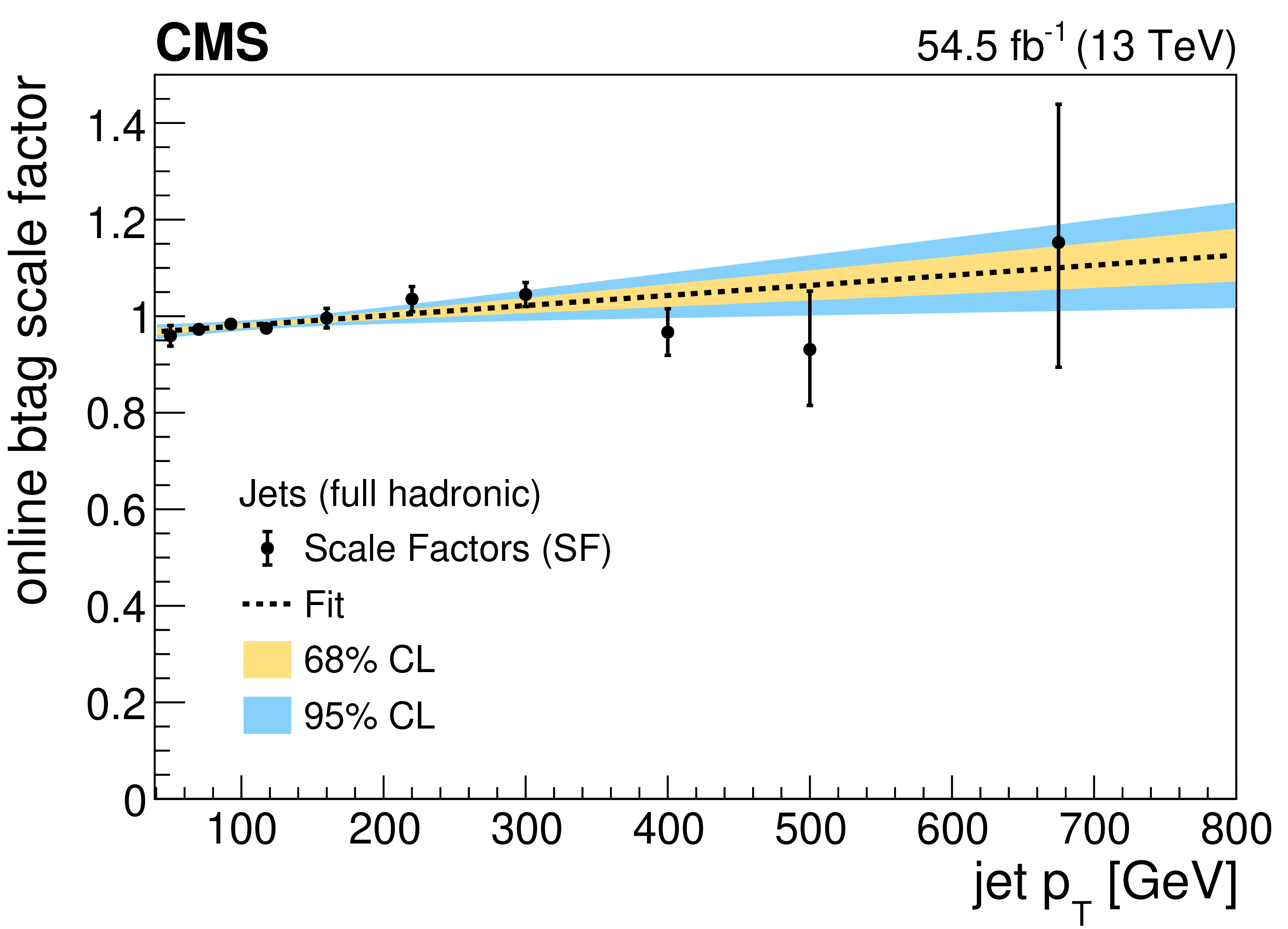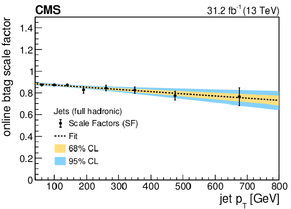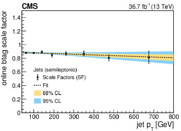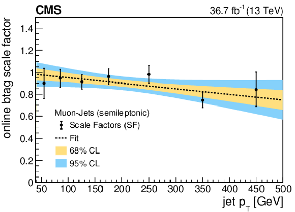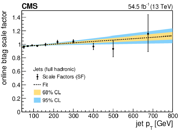 Online b tagging scale factors for b jets in the 2017 SL (upper left), 2017 FH (upper right) and 2018 FH (lower left) analyses, and for b jets with muons in the 2017 SL analysis (lower right). The results of linear fits are also shown, together with $ {\pm}1\sigma $ and $ {\pm}2\sigma $ uncertainty bands. |