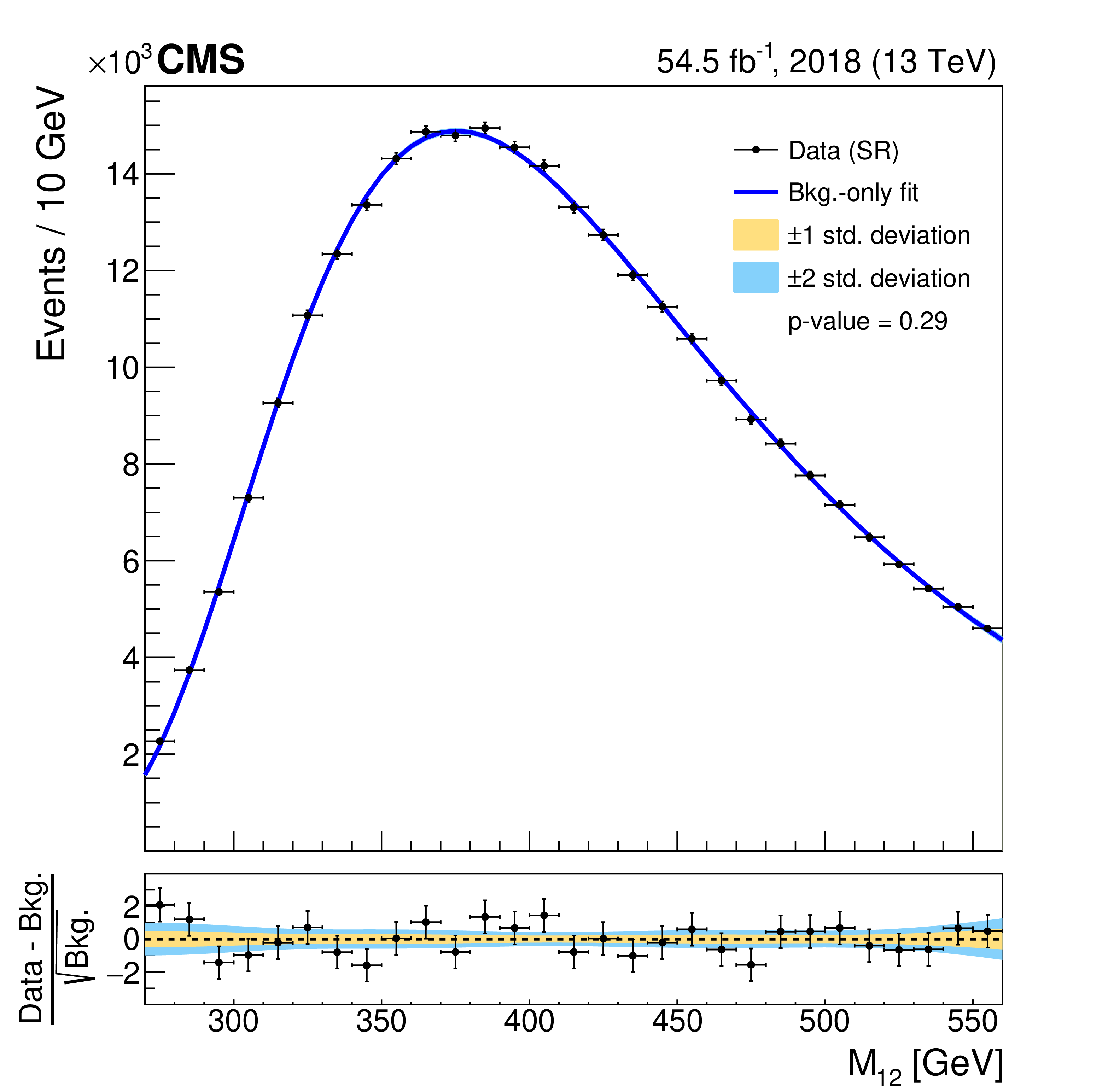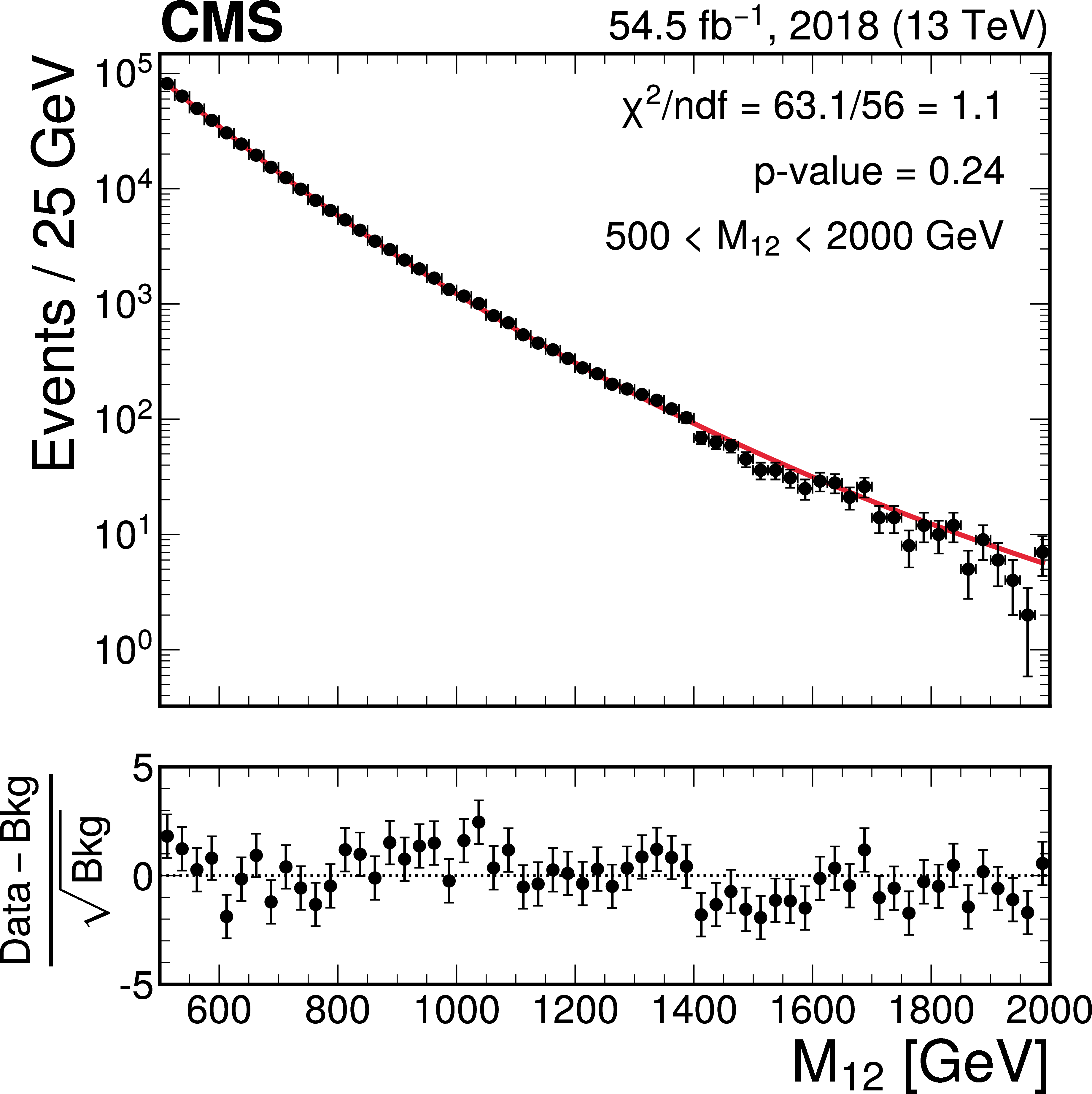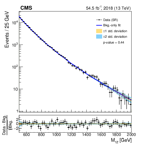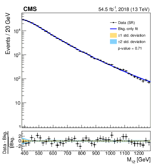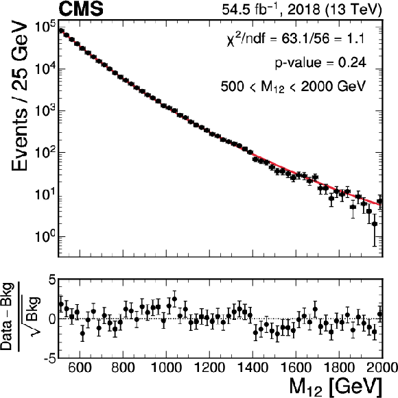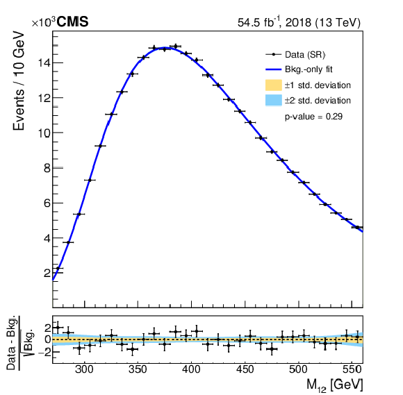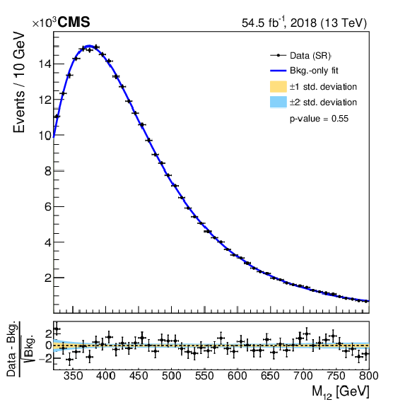 Invariant mass distributions of the four fit ranges in the b tag veto CR for the 2018 FH channel, overlaid with the fitted functions. The distributions are fitted in the $ M_{12} $ ranges of 270-560 GeV (upper left), 320-800 GeV (upper right), 390-1270 GeV (lower left), and 500-2000 GeV (lower right). The $ \chi^2 $ goodness-of-fit test and corresponding p-value are indicated in each plot. The lower panels show the difference between the data and the fitted function, divided by the estimated statistical uncertainty for each bin. Good agreement between the fitted functions and the data is achieved. |