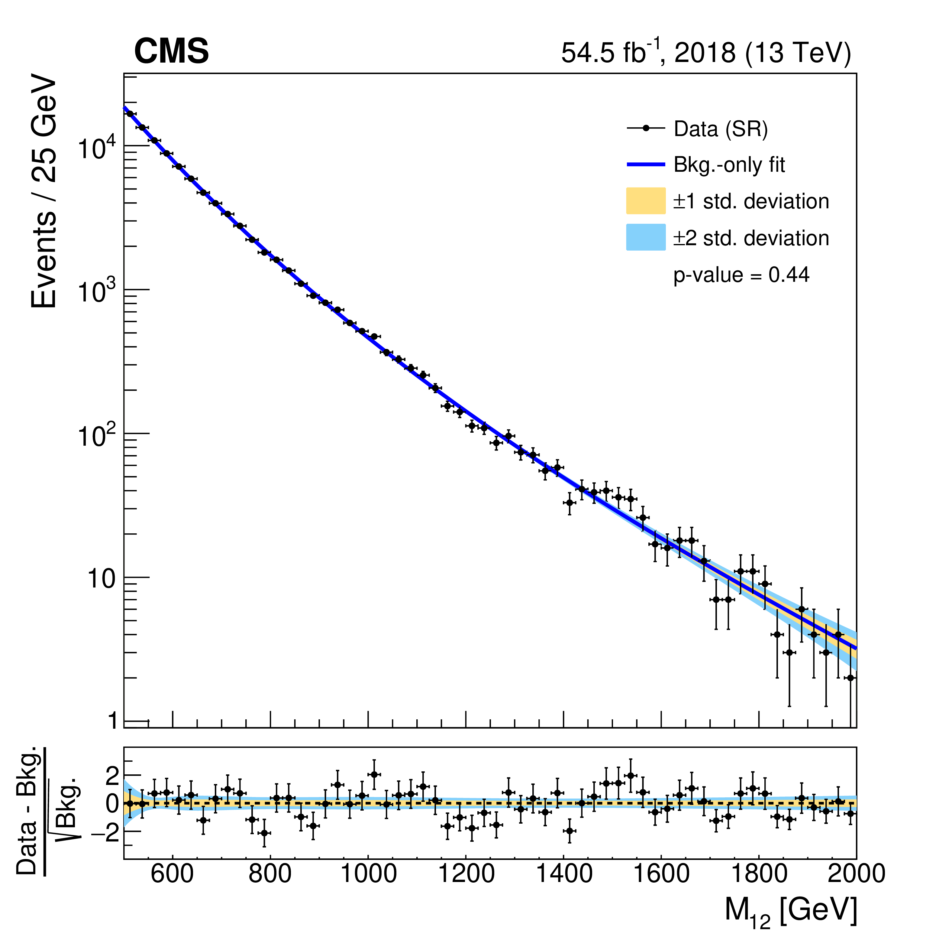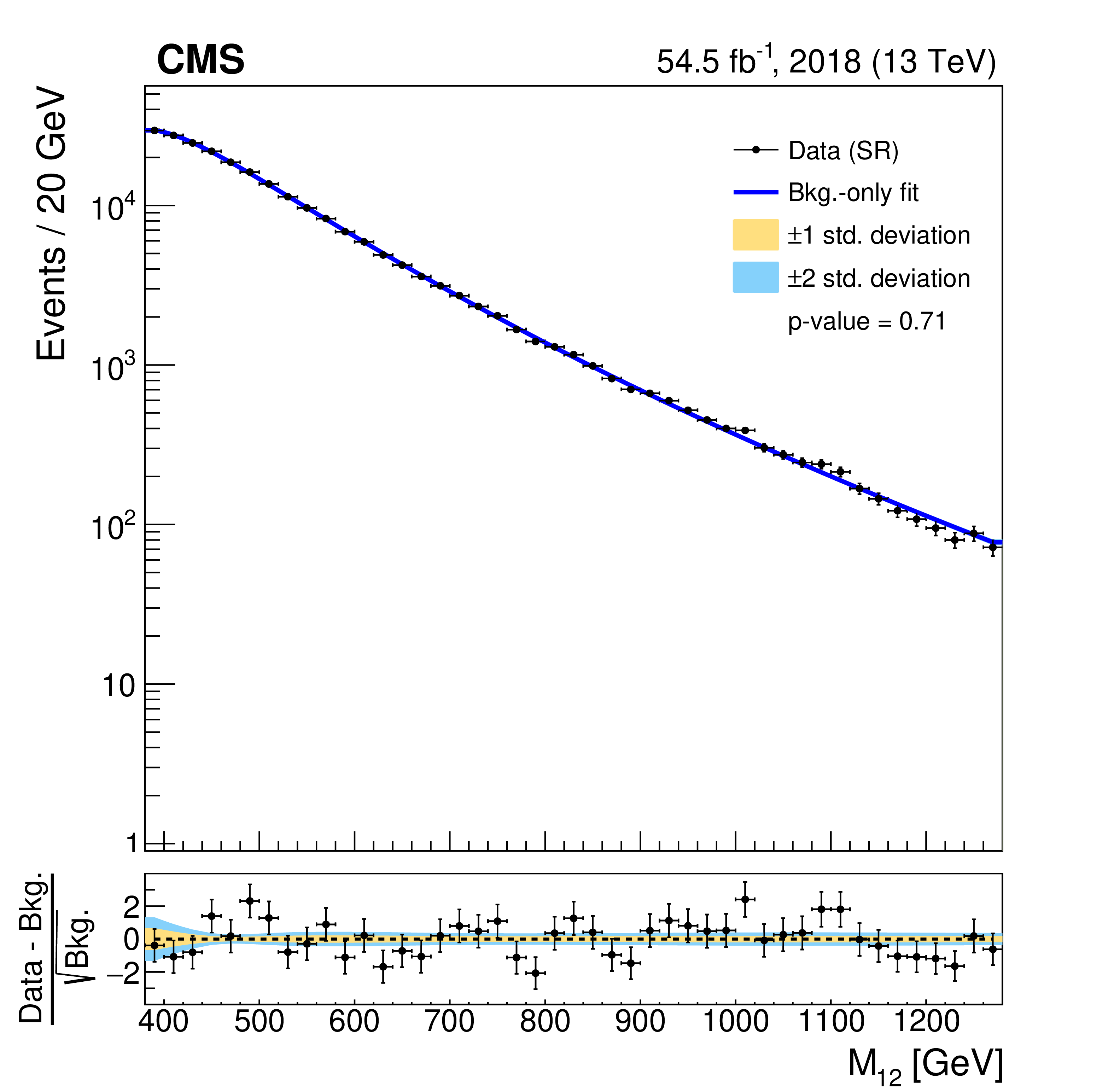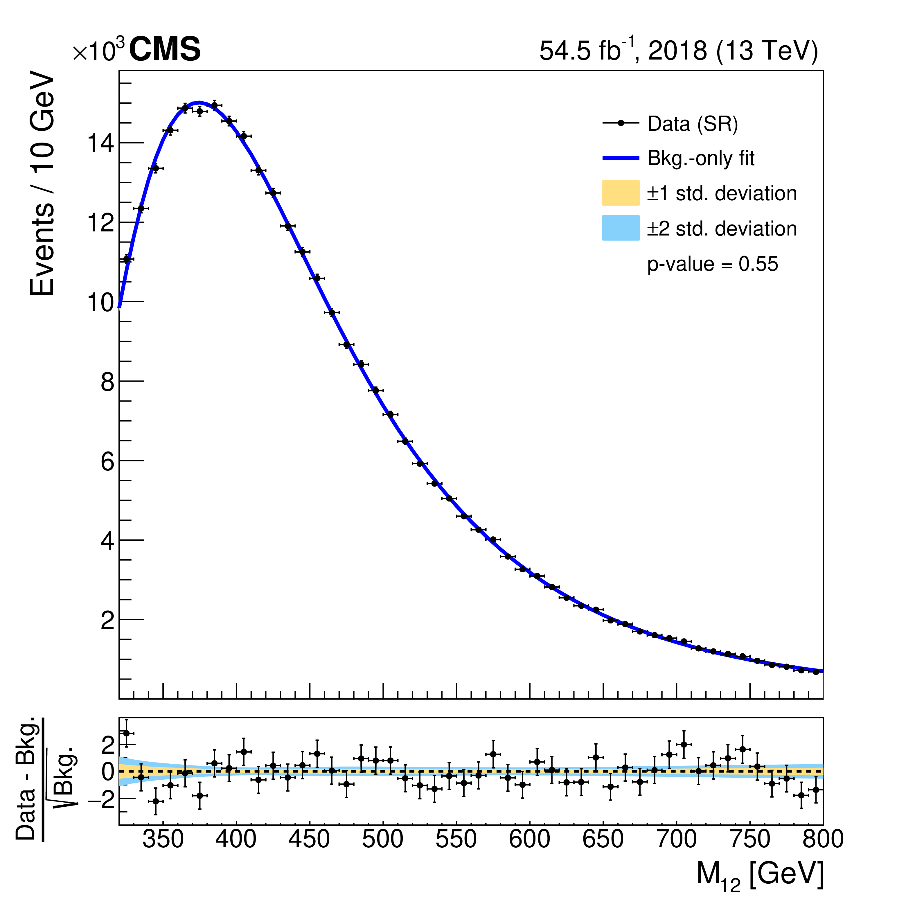 Invariant mass distributions of the four fit ranges in the b tag veto CR for the 2018 FH channel, overlaid with the fitted functions. The distributions are fitted in the $ M_{12} $ ranges of 270-560 GeV (upper left), 320-800 GeV (upper right), 390-1270 GeV (lower left), and 500-2000 GeV (lower right). The $ \chi^2 $ goodness-of-fit test and corresponding p-value are indicated in each plot. The lower panels show the difference between the data and the fitted function, divided by the estimated statistical uncertainty for each bin. Good agreement between the fitted functions and the data is achieved. |