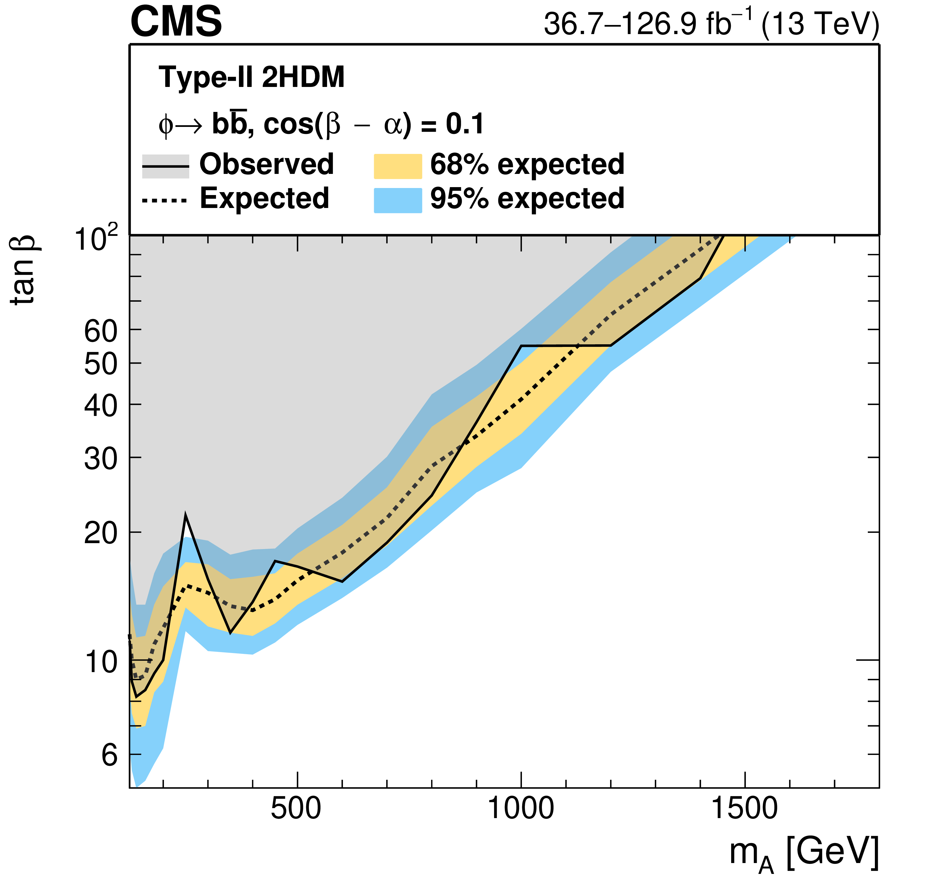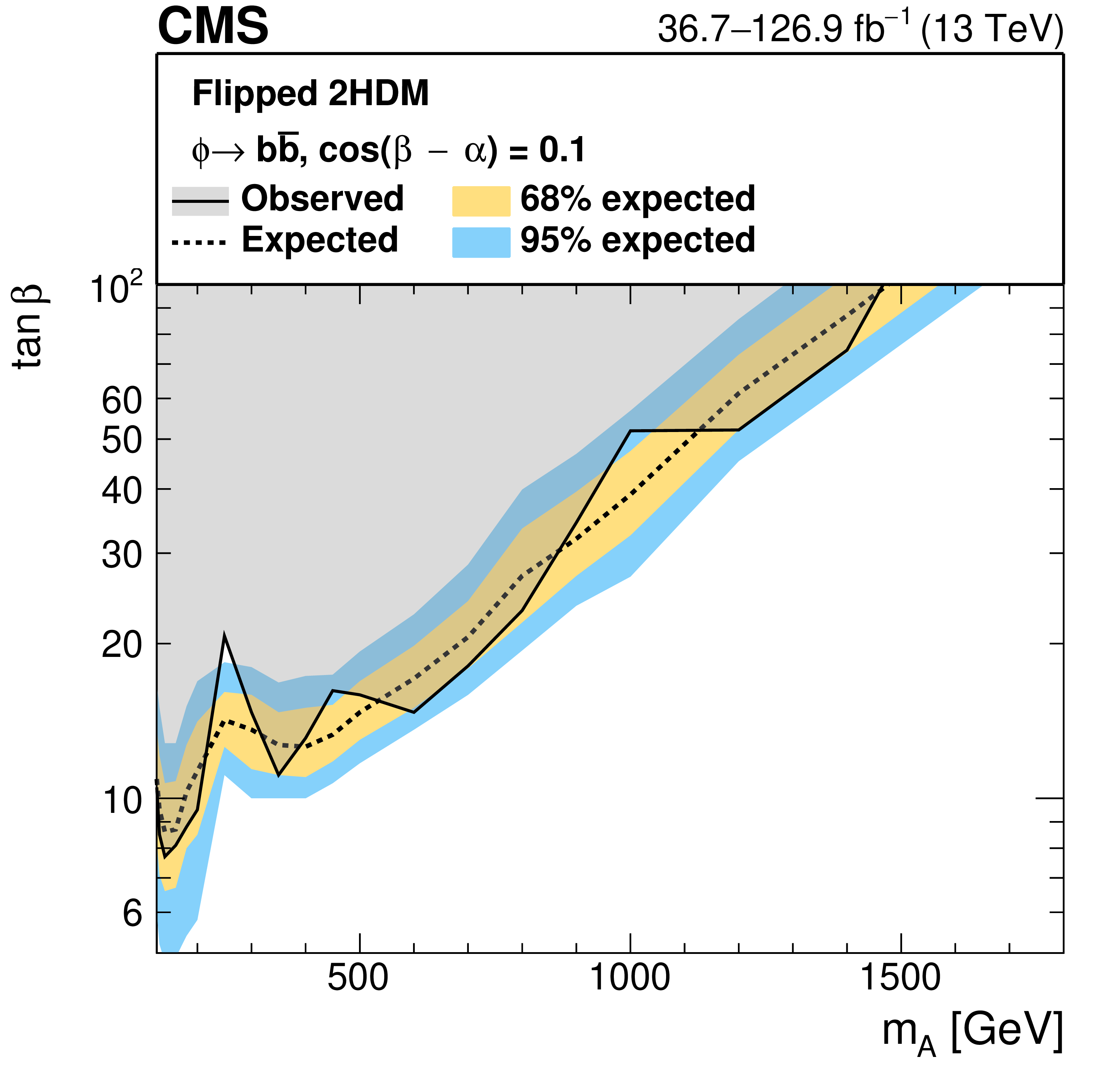 Interpretation in the $ M_{\mathrm{h}}^{125} $ scenario of the MSSM: observed and expected upper limits at 95% CL on the parameter $ \tan\beta $ as functions of the mass $ m_{\mathrm{A}} $ of the $ CP $-odd Higgs boson. The higgsino mass parameter has been set to $ \mu = + $1 TeV. The hashed area indicates the parameter region in which the mass of the lightest MSSM Higgs boson does not coincide with 125 GeV within a margin of 3 GeV. |