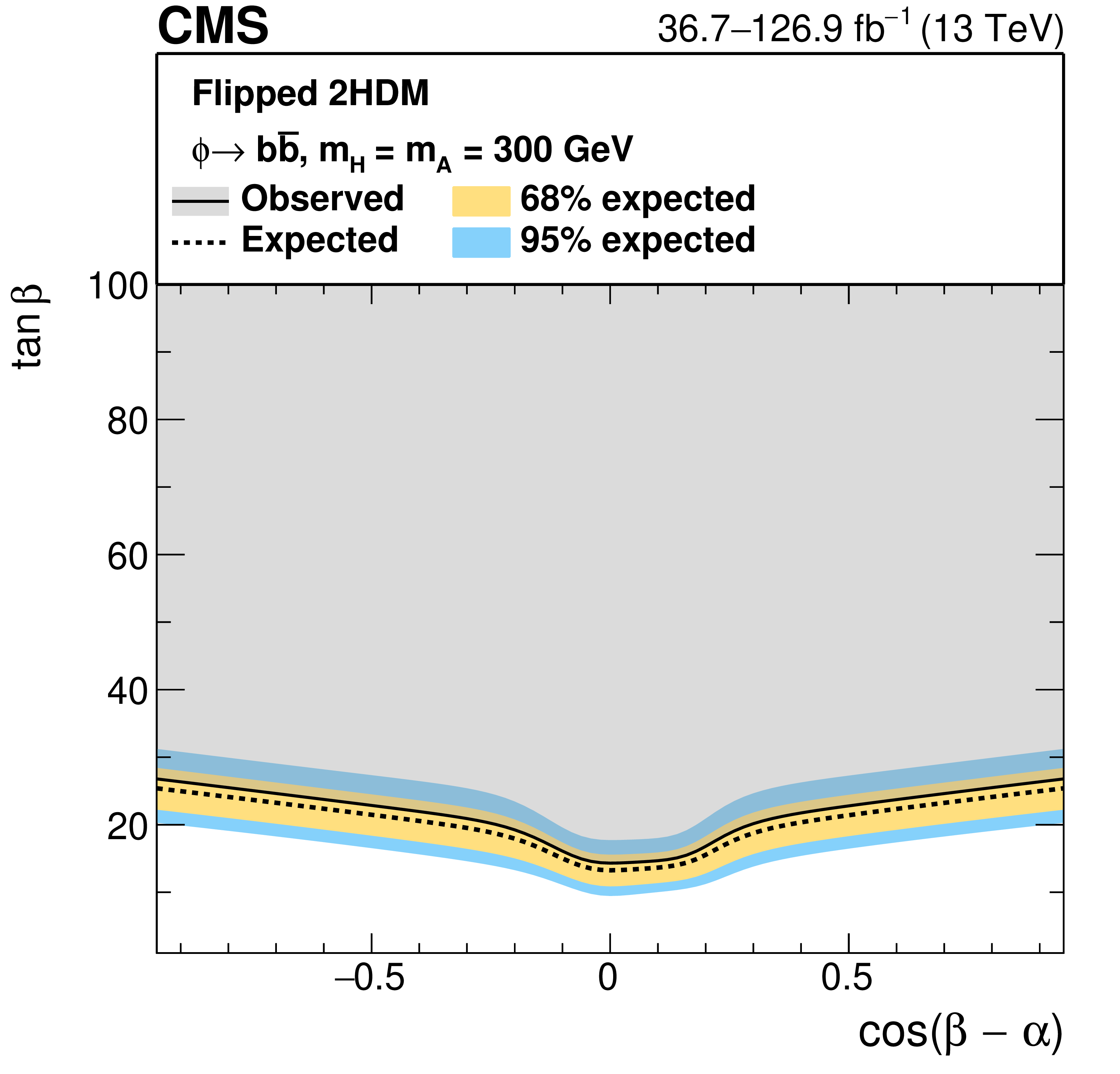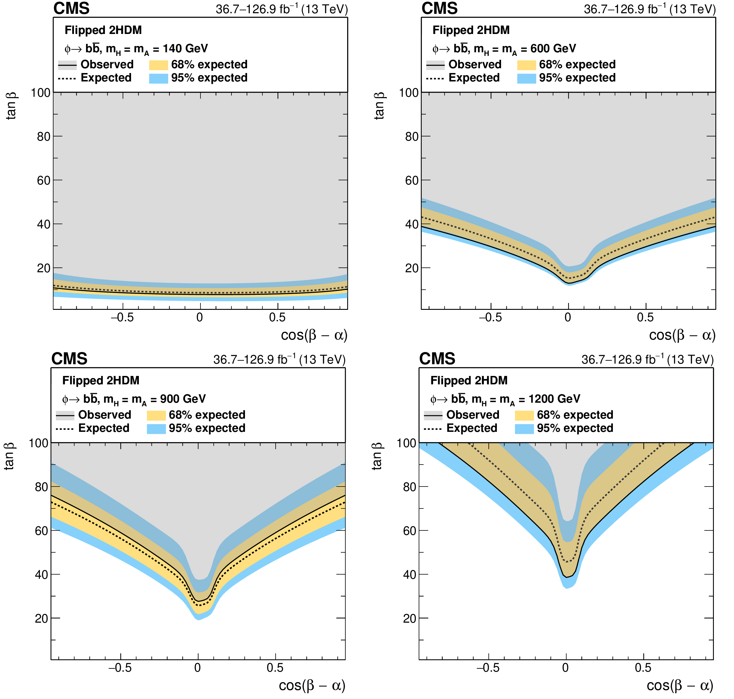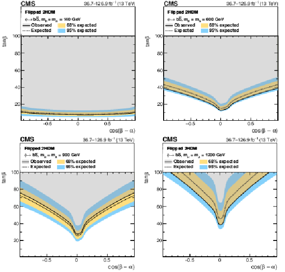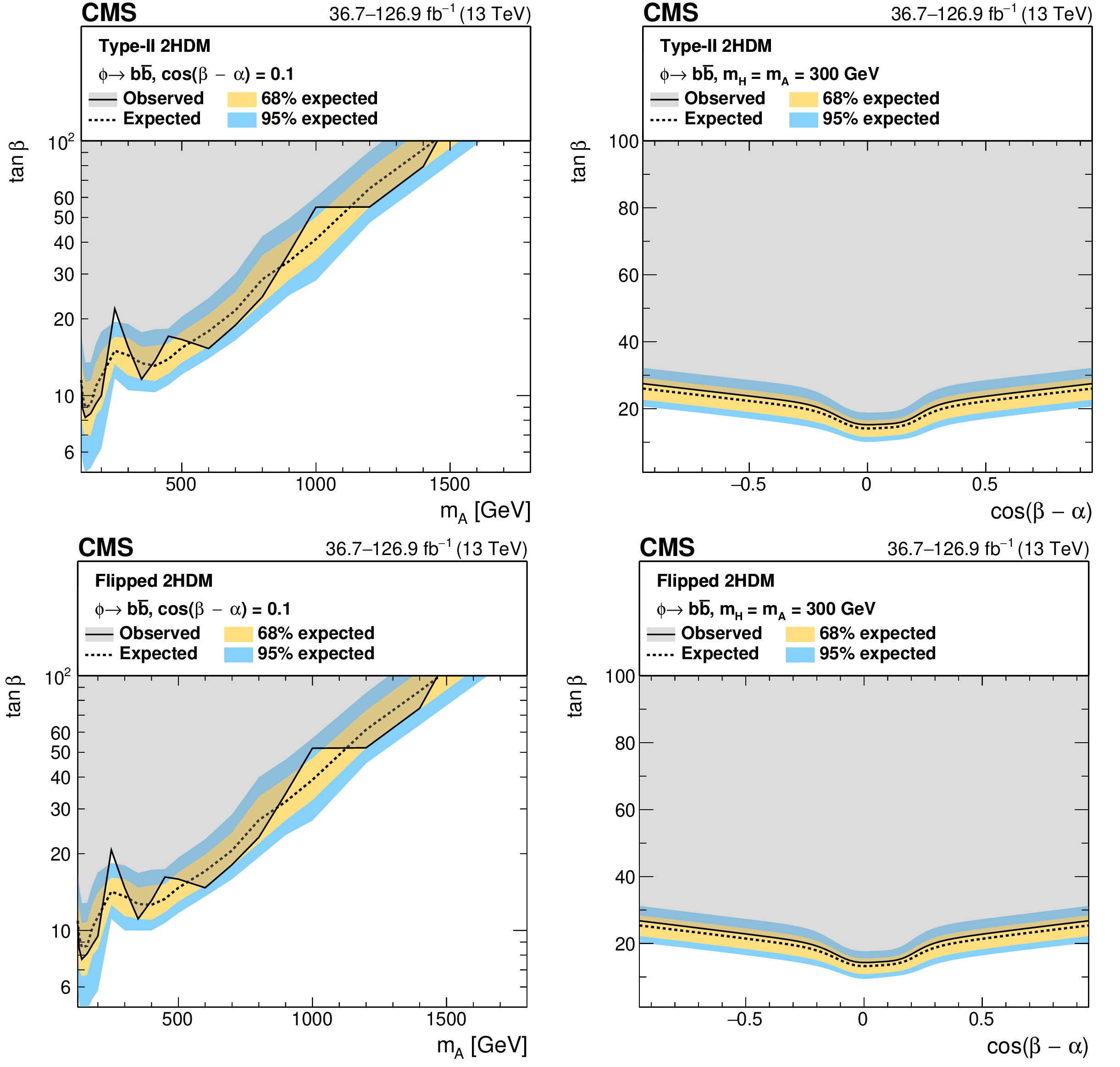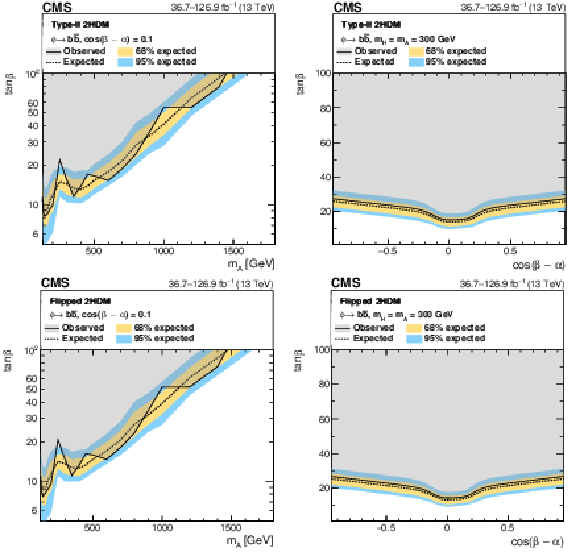 Interpretation in 2HDM scenarios: observed and expected upper limits at 95% CL on the parameter $ \tan\beta $ as a function of $ m_{\mathrm{A},\mathrm{H}} $ for $ \cos(\beta-\alpha)= $ 0.1 (left), and as functions of $ \cos(\beta-\alpha) $ for masses of $ m_{\mathrm{A}} = m_{\mathrm{H}} = $ 300 GeV (right), for the 2HDM Type-II scenario (upper), and the 2HDM Flipped scenario (lower). |
