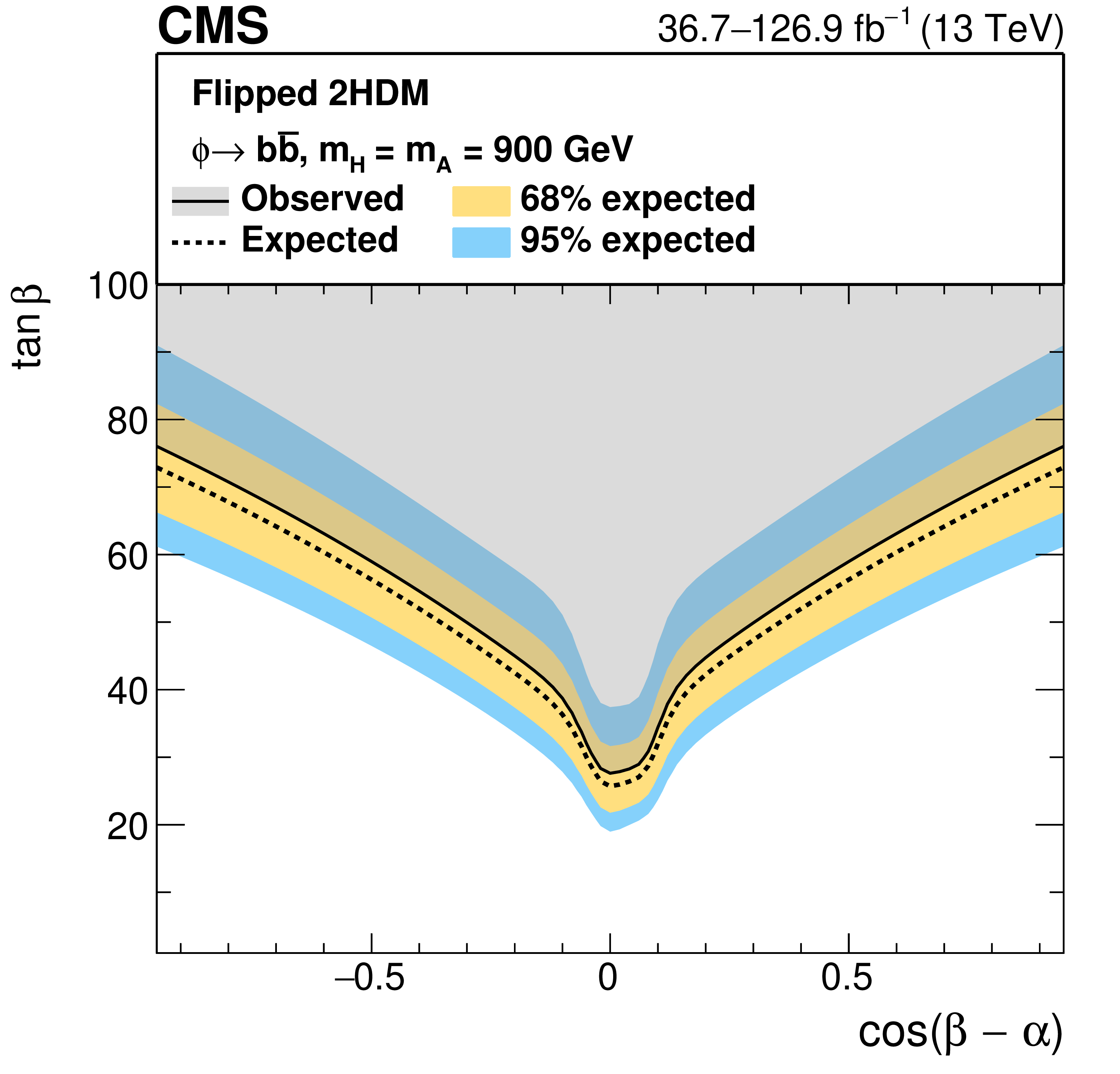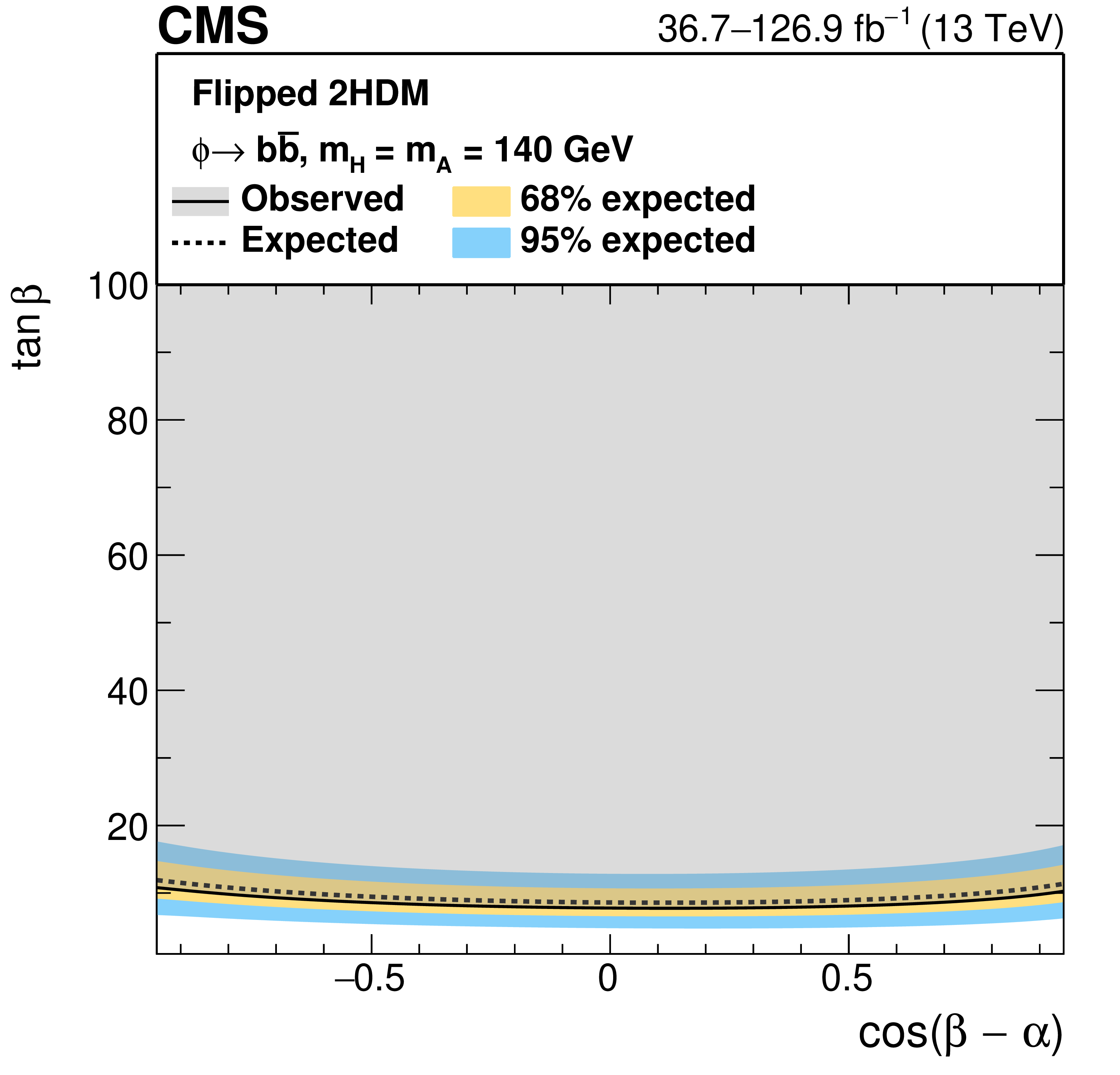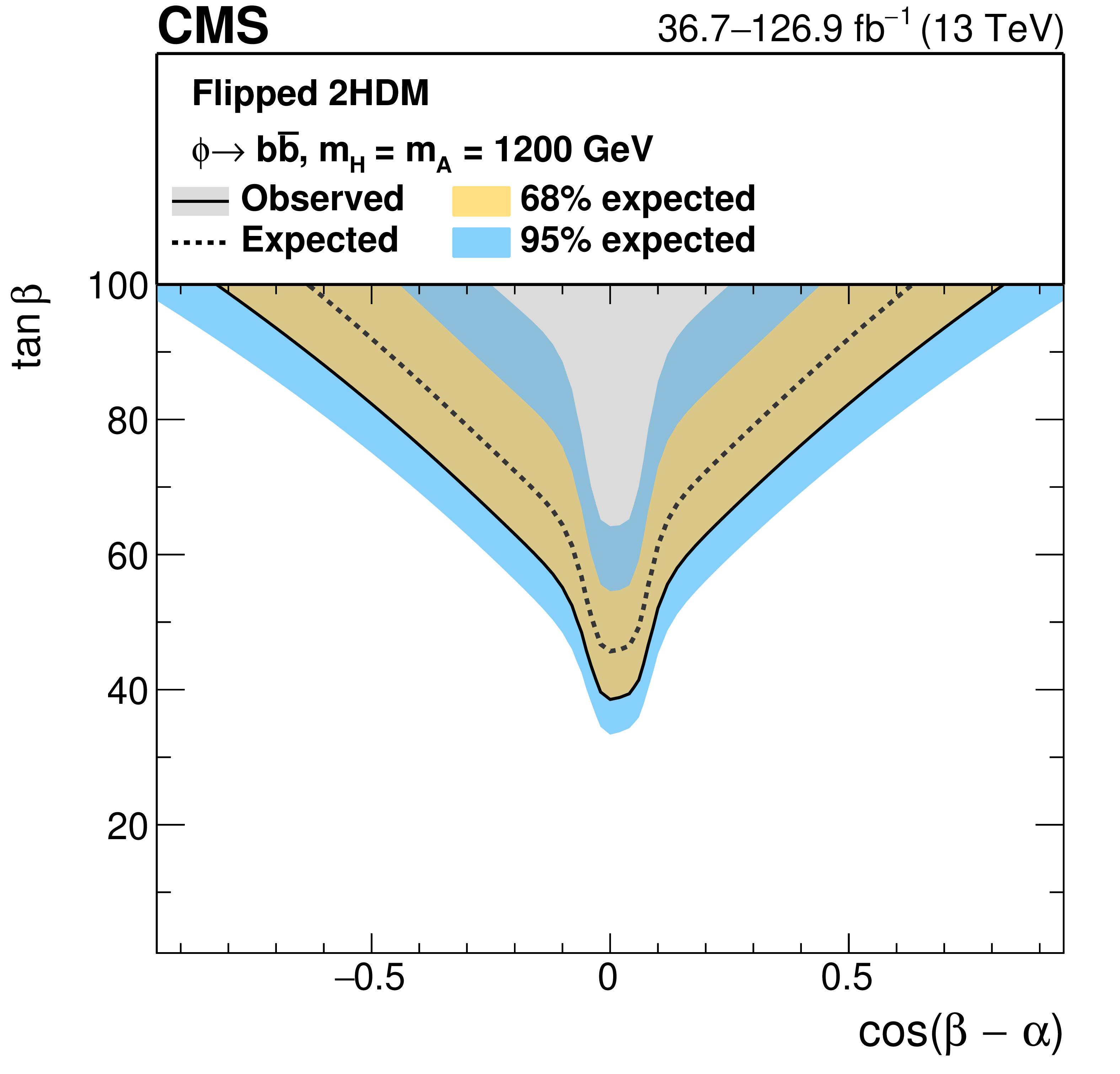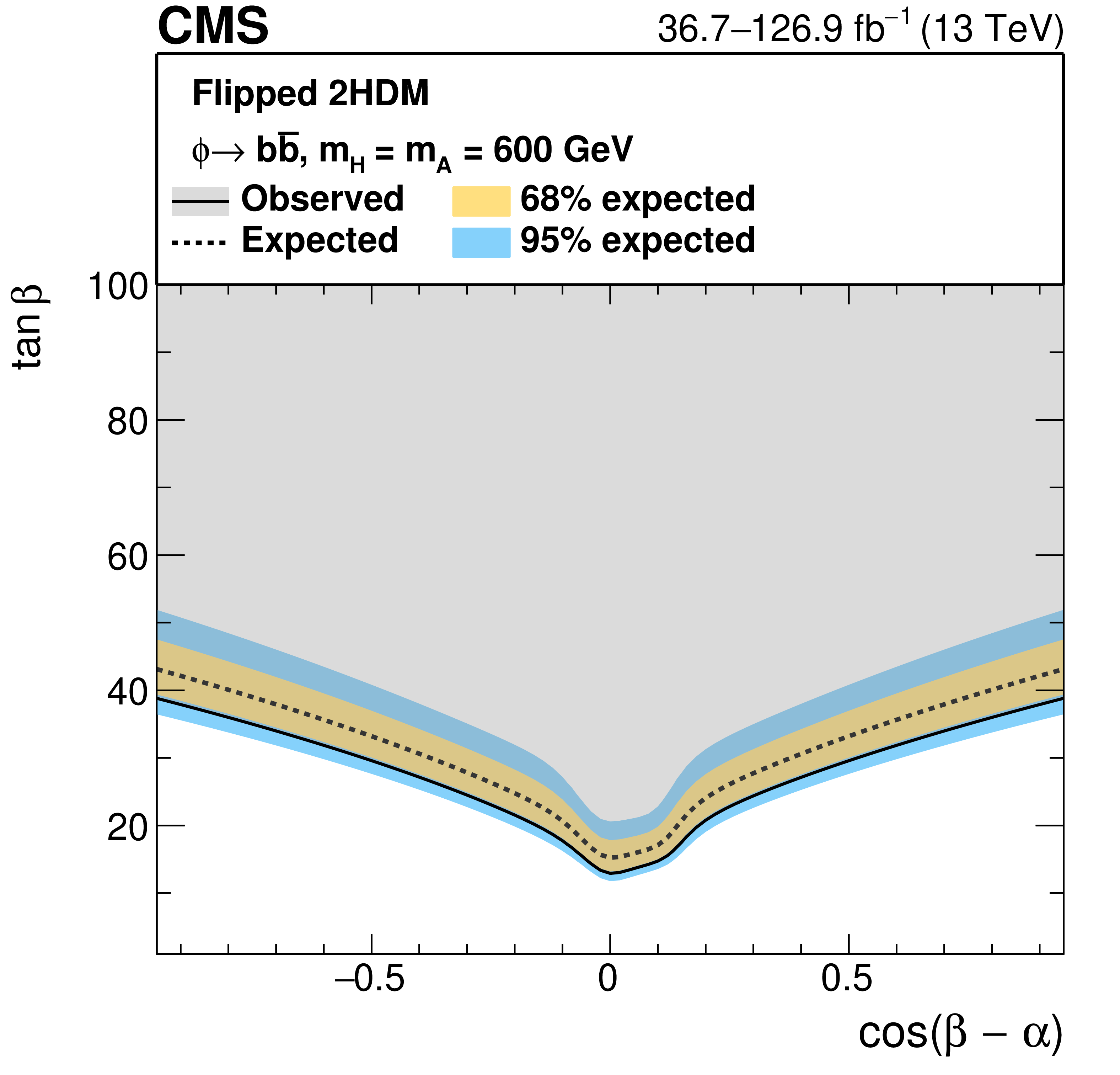 Interpretation in 2HDM scenarios: observed and expected upper limits at 95% CL on the parameter $ \tan\beta $ as a function of $ m_{\mathrm{A},\mathrm{H}} $ for $ \cos(\beta-\alpha)= $ 0.1 (left), and as functions of $ \cos(\beta-\alpha) $ for masses of $ m_{\mathrm{A}} = m_{\mathrm{H}} = $ 300 GeV (right), for the 2HDM Type-II scenario (upper), and the 2HDM Flipped scenario (lower). |