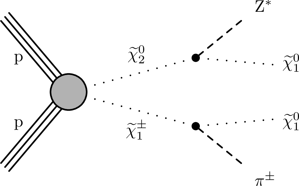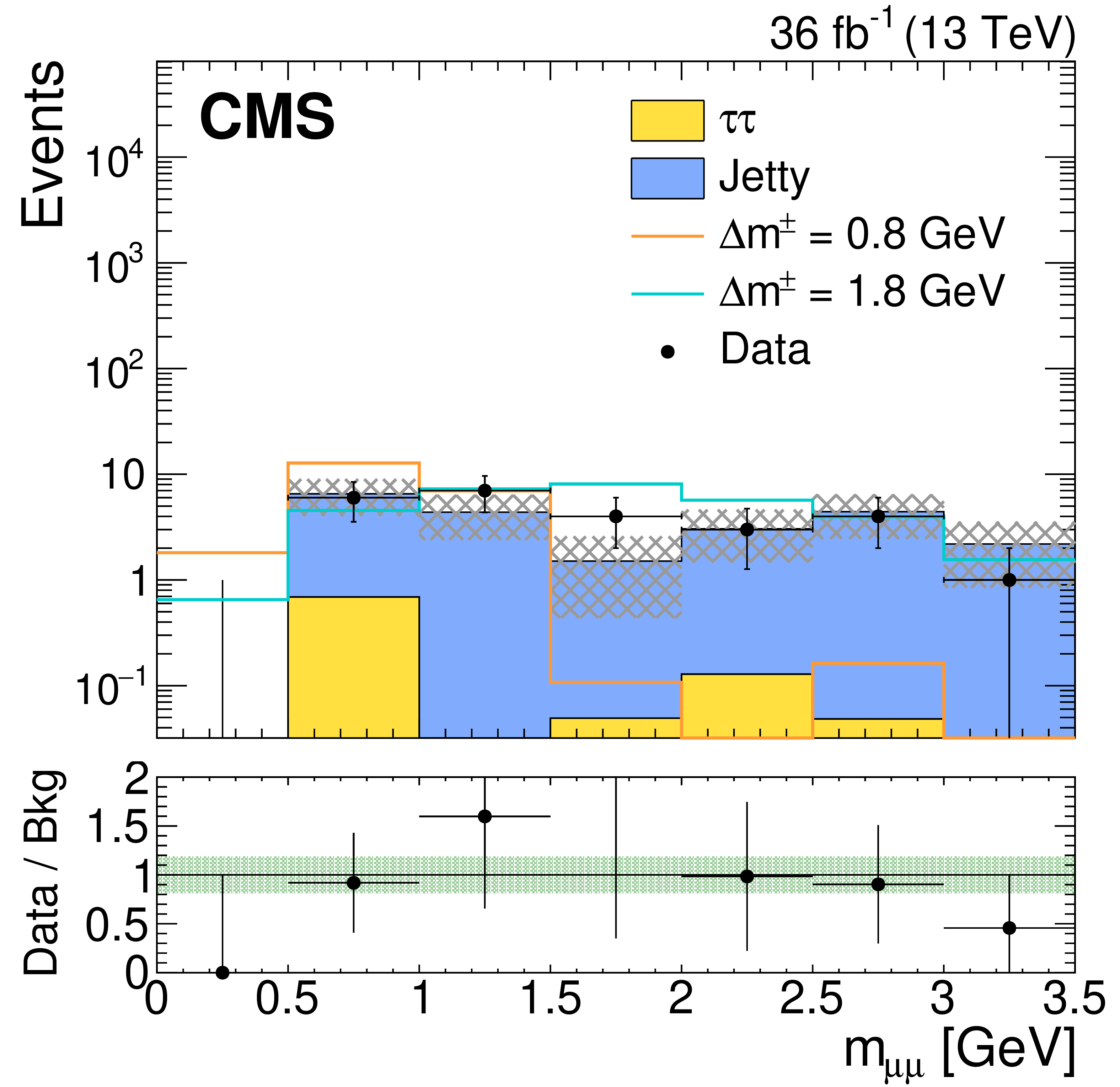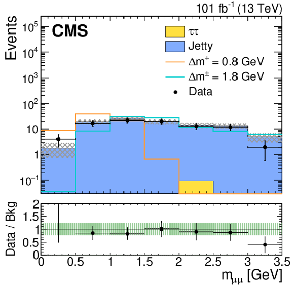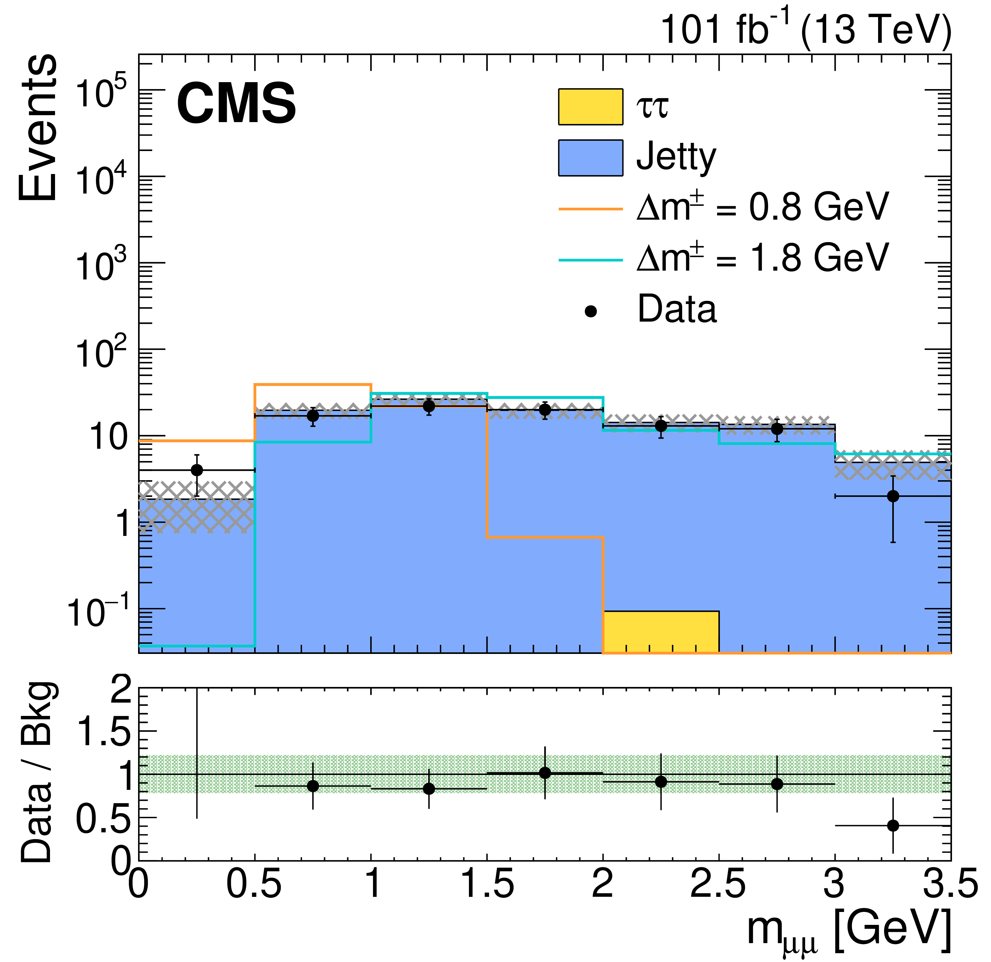 | Abstract: We present a search for the pair production of Higgsinos in final states with large missing transverse momentum and either two reconstructed muons or a reconstructed lepton (muon or electron) and an isolated track. The analyzed data correspond to proton-proton collisions with an integrated luminosity of 137 fb$ ^{-1} $, collected by the CMS experiment at $ \sqrt{s}= $ 13 TeV in 2016, 2017, and 2018. The signal scenario assumes two neutralino states, $ \tilde{\chi}_{2}^{0} $ and $ \tilde{\chi}_{1}^{0} $, with a small mass difference in the range 1-10 GeV and a chargino $ \tilde{\chi}_{1}^{\pm} $ with an intermediate mass. The analysis focuses on the decay of the heavier neutralino into the lighter one and a virtual Z boson, which decays into two same-flavor leptons. The leptons have small transverse momentum and/or a small opening angle between the identified muons. An isolated track is used to recover events in which only one of the two leptons is identified. Multivariate discriminants are used to enhance the sensitivity by efficiently rejecting backgrounds from SM processes or misreconstructed tracks and/or leptons. The search explores a unique phase space and probes a previously unexplored region of the signal model parameter space. Mass differences between the two neutralinos are probed down to 1.5 GeV, assuming a Higgsino mass of 100 GeV. The maximum excluded Higgsino mass is 115 GeV. | ||
