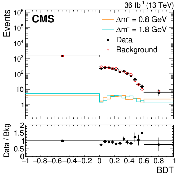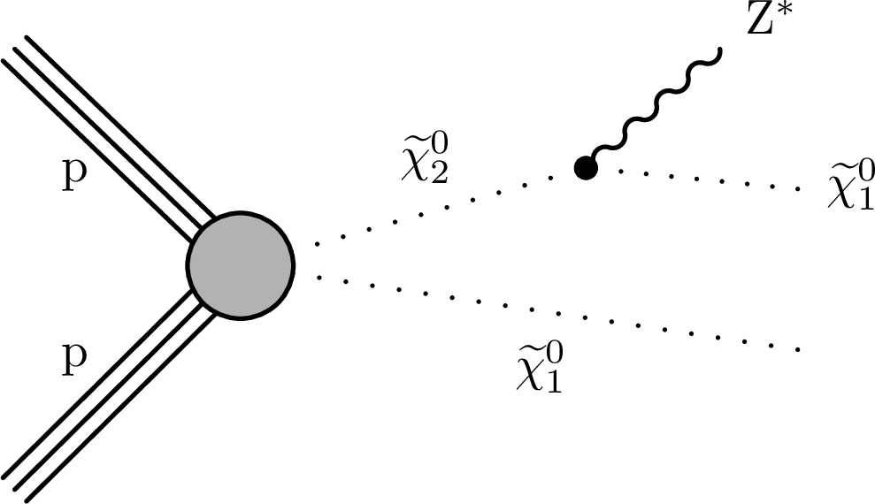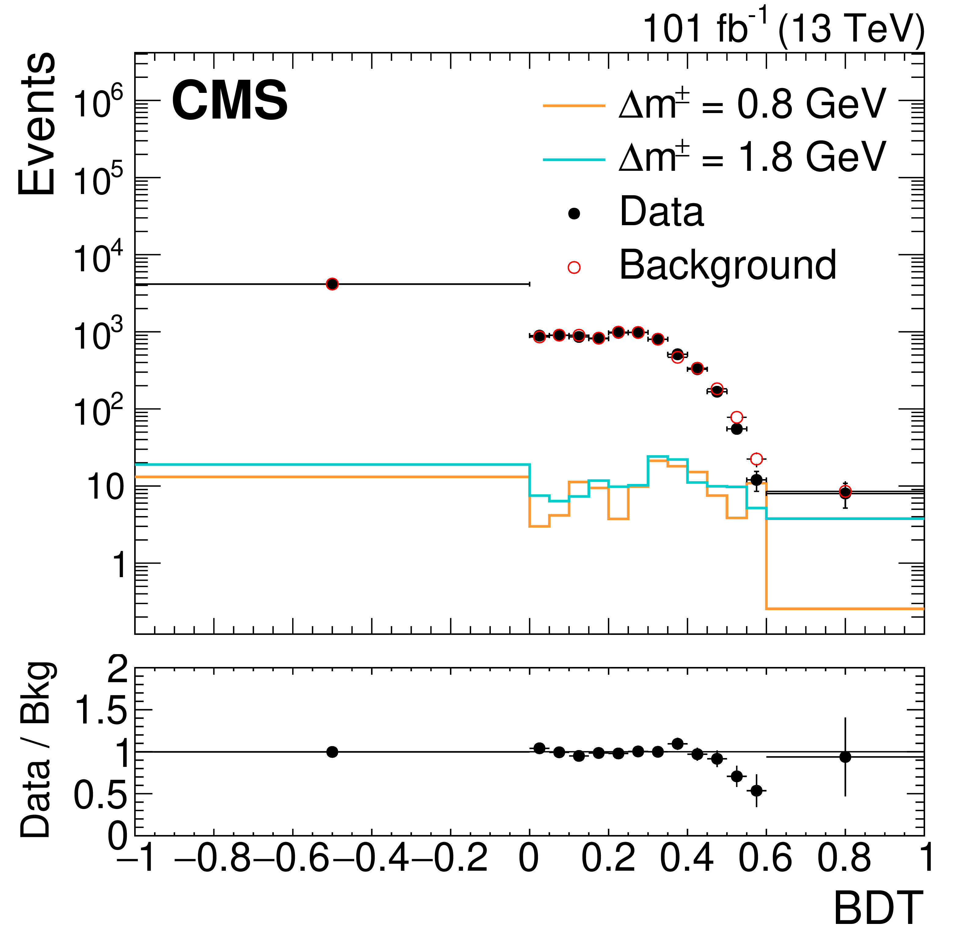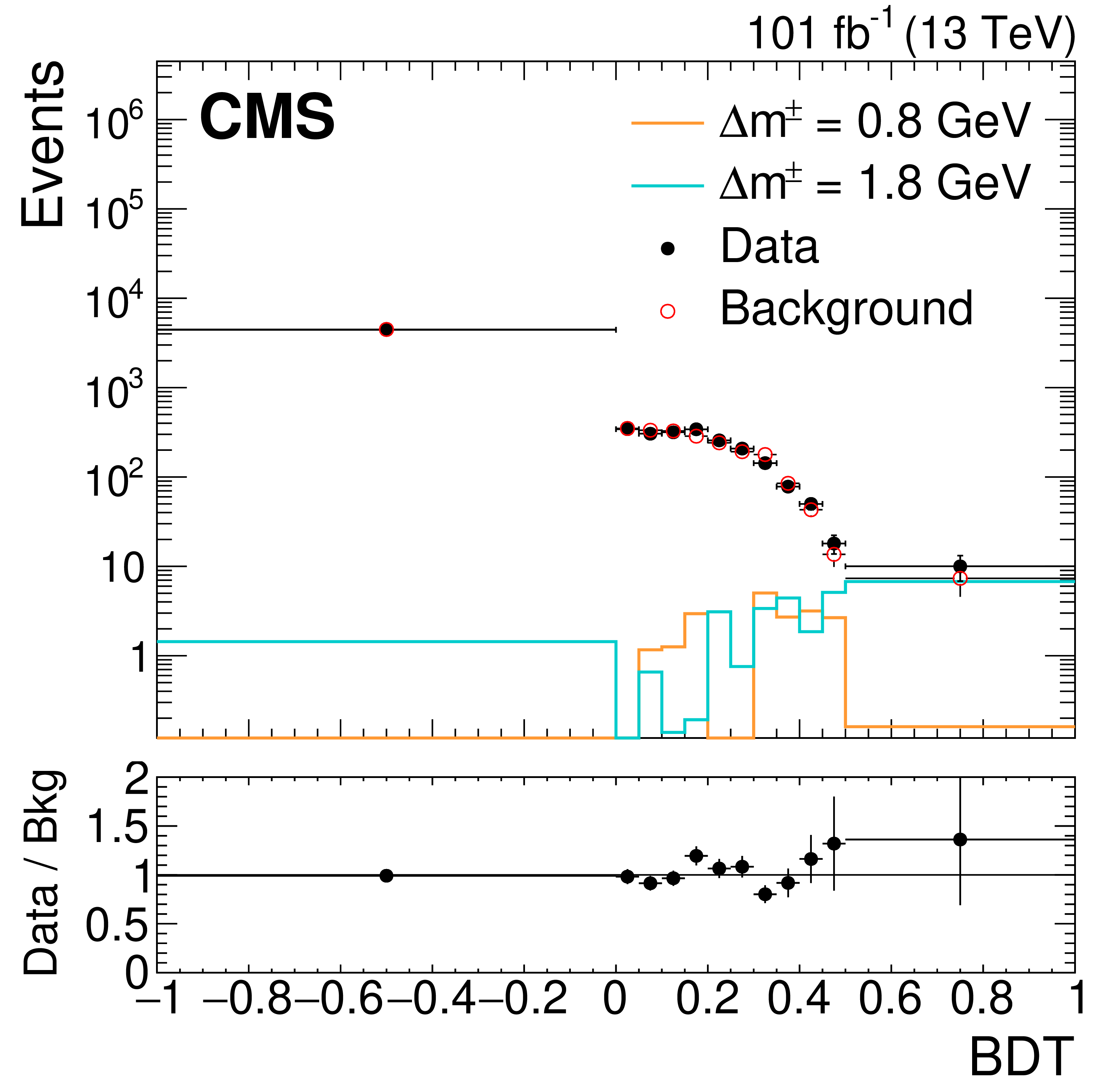 | Abstract: We present a search for the pair production of Higgsinos in final states with large missing transverse momentum and either two reconstructed muons or a reconstructed lepton (muon or electron) and an isolated track. The analyzed data correspond to proton-proton collisions with an integrated luminosity of 137 fb$ ^{-1} $, collected by the CMS experiment at $ \sqrt{s}= $ 13 TeV in 2016, 2017, and 2018. The signal scenario assumes two neutralino states, $ \tilde{\chi}_{2}^{0} $ and $ \tilde{\chi}_{1}^{0} $, with a small mass difference in the range 1-10 GeV and a chargino $ \tilde{\chi}_{1}^{\pm} $ with an intermediate mass. The analysis focuses on the decay of the heavier neutralino into the lighter one and a virtual Z boson, which decays into two same-flavor leptons. The leptons have small transverse momentum and/or a small opening angle between the identified muons. An isolated track is used to recover events in which only one of the two leptons is identified. Multivariate discriminants are used to enhance the sensitivity by efficiently rejecting backgrounds from SM processes or misreconstructed tracks and/or leptons. The search explores a unique phase space and probes a previously unexplored region of the signal model parameter space. Mass differences between the two neutralinos are probed down to 1.5 GeV, assuming a Higgsino mass of 100 GeV. The maximum excluded Higgsino mass is 115 GeV. | ||