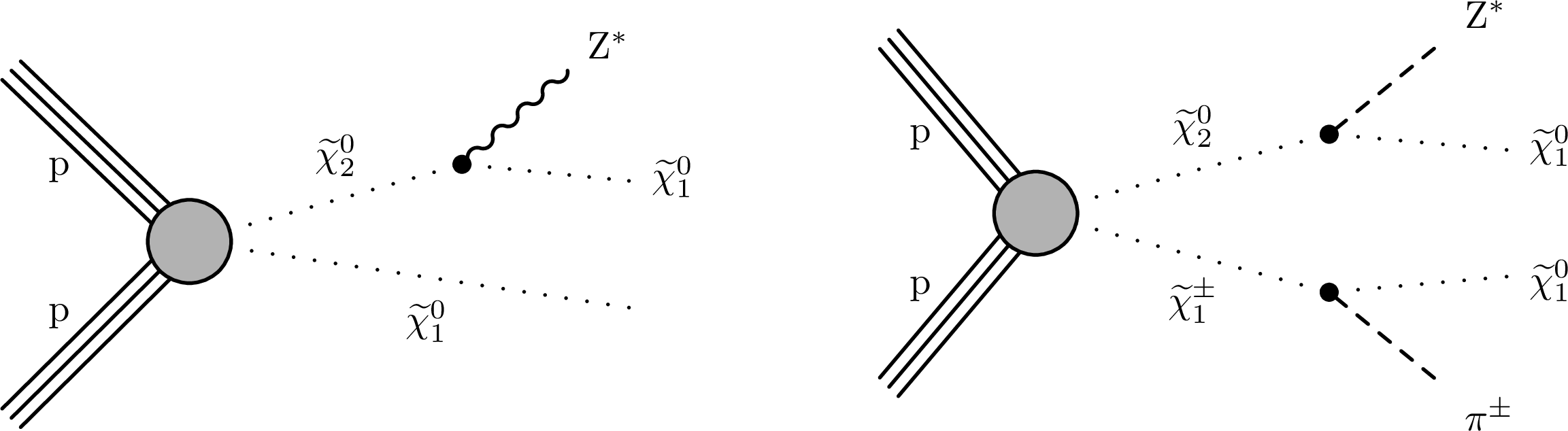 Diagrams illustrating the production and decay of electroweakinos in the Higgsino simplified model via the $ \tilde{\chi}_{2}^{0}\tilde{\chi}_{1}^{0} $ (left) and $ \tilde{\chi}_{2}^{0}\tilde{\chi}_{1}^{\pm} $ (right) processes. |