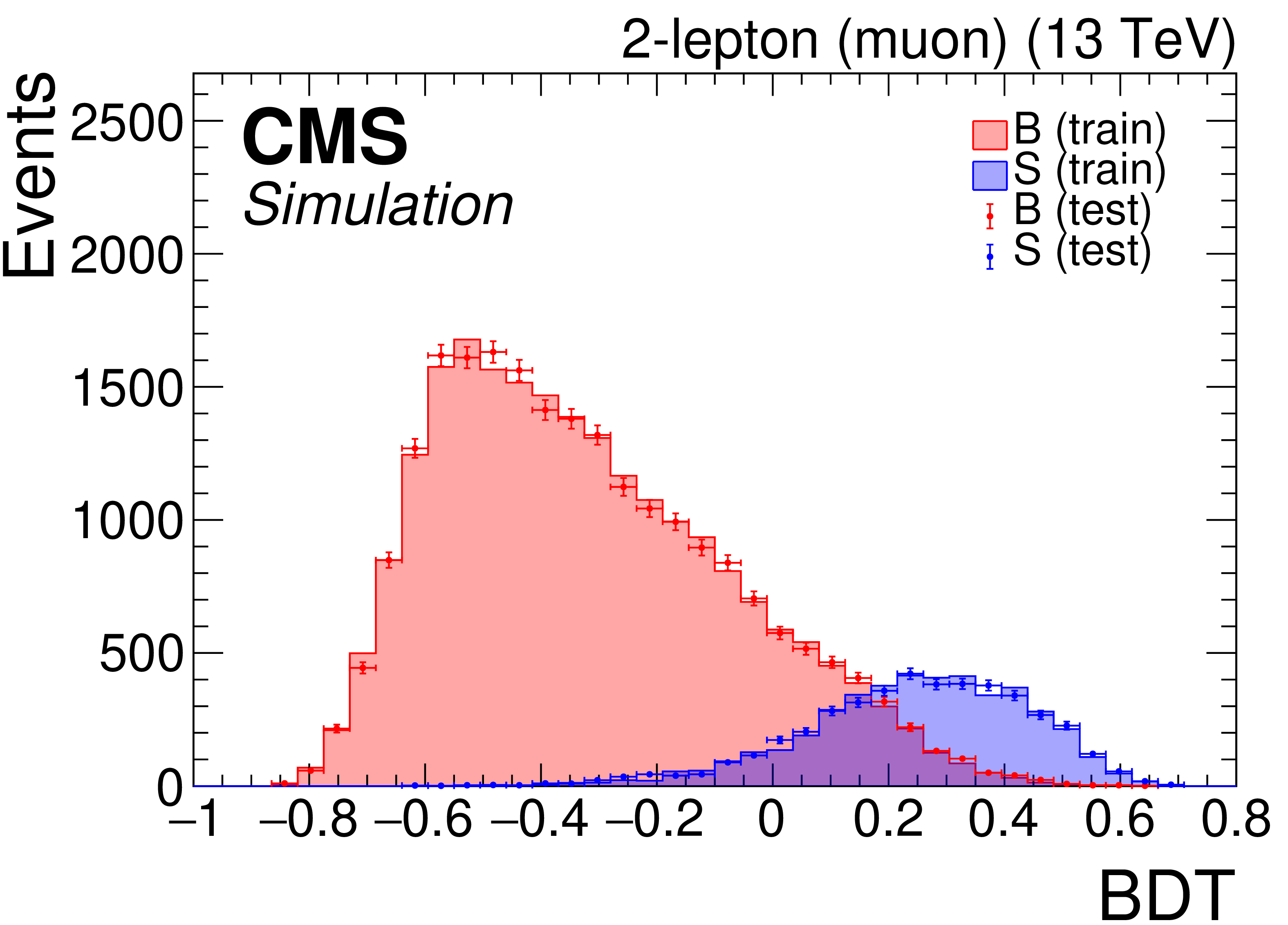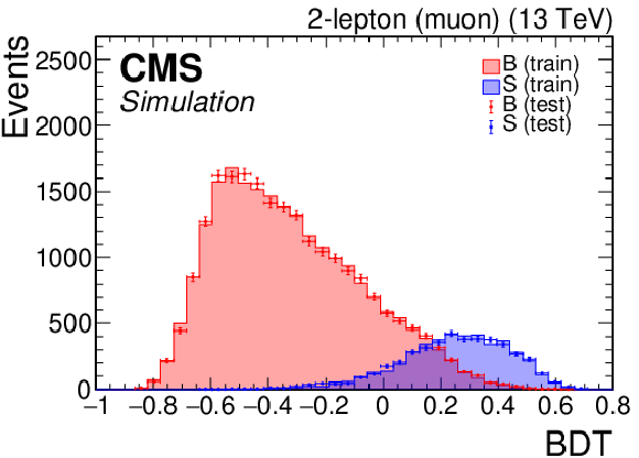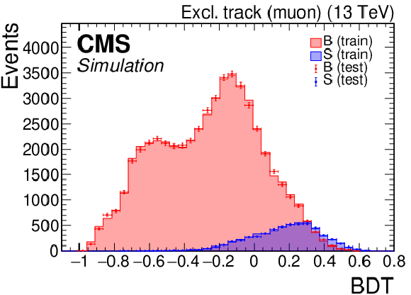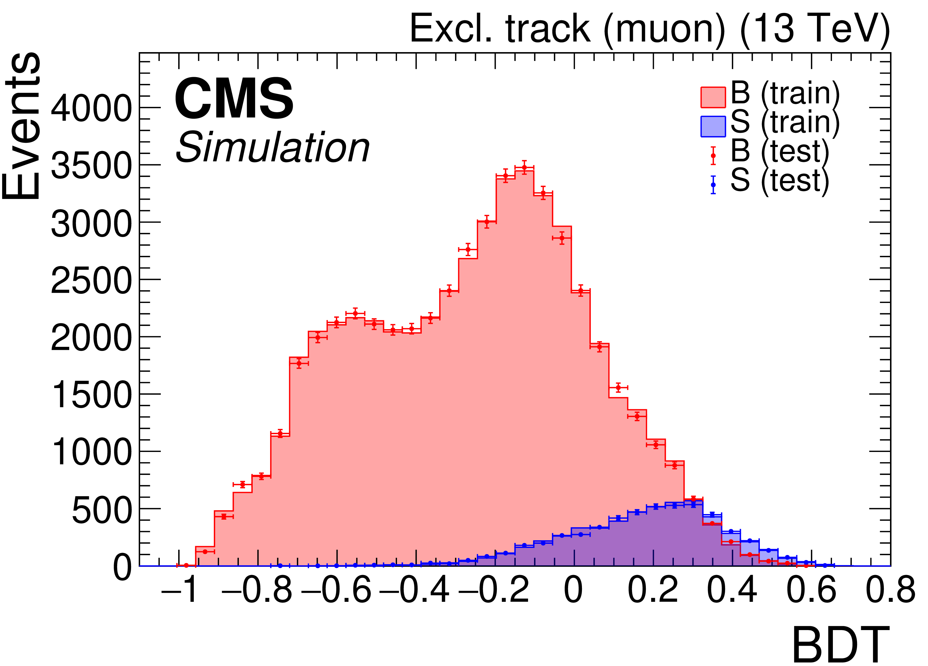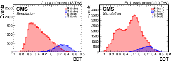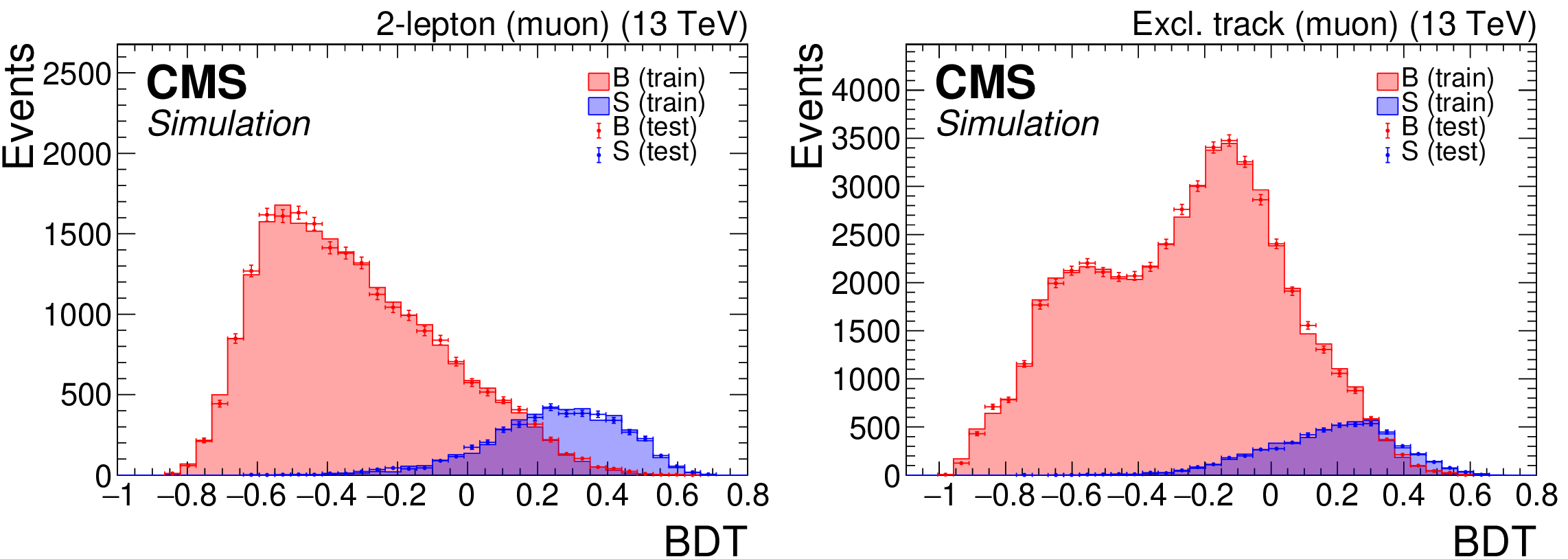 Unweighted distributions of the event-level BDT scores for events from the signal and background training samples in the dimuon category (left) and the muon+track category (right), based on the Phase1 detector configuration. |