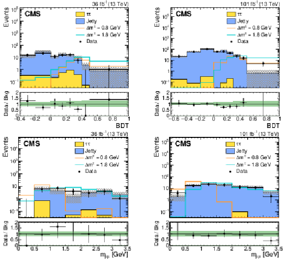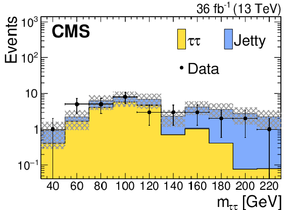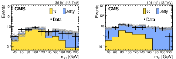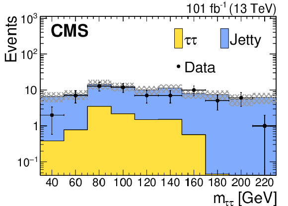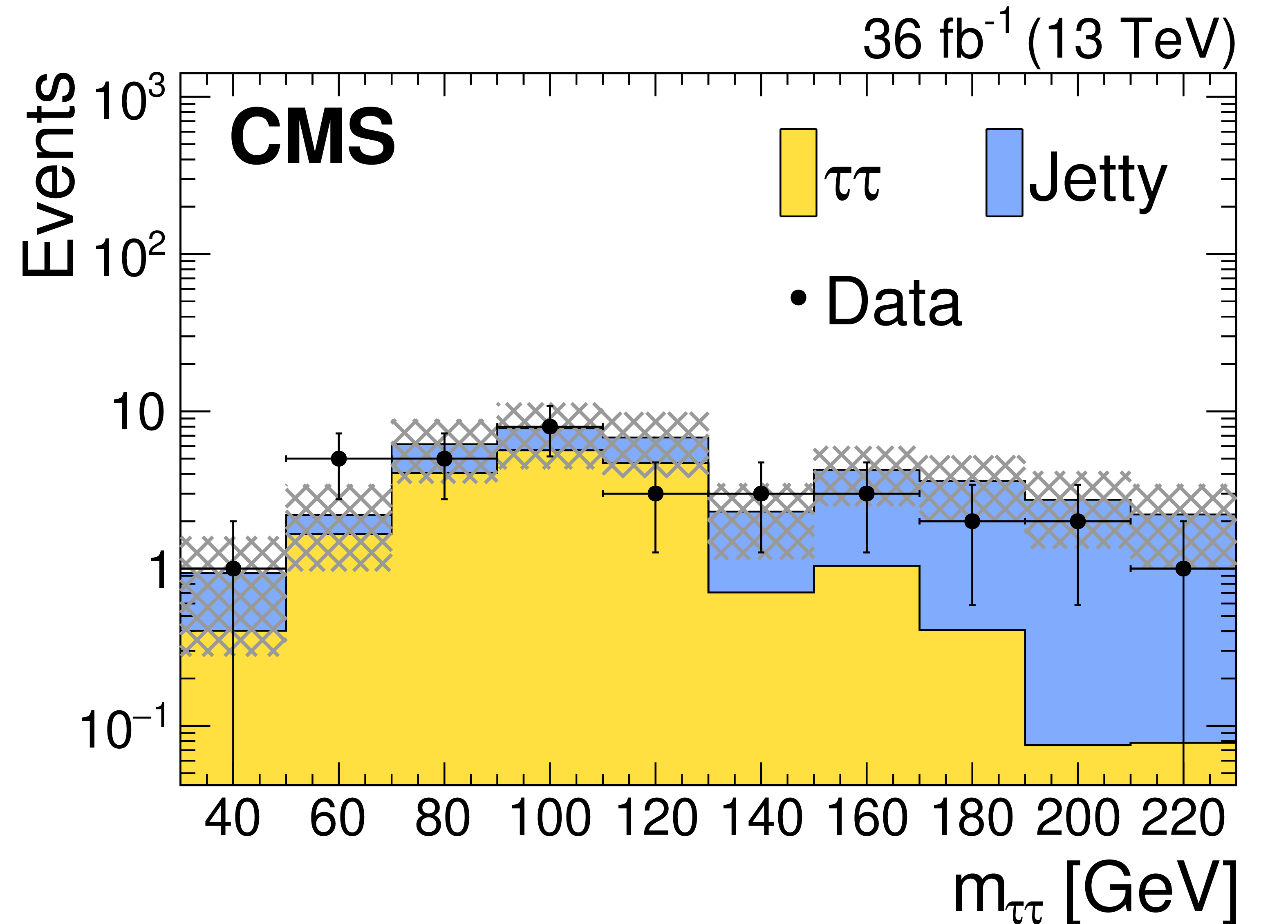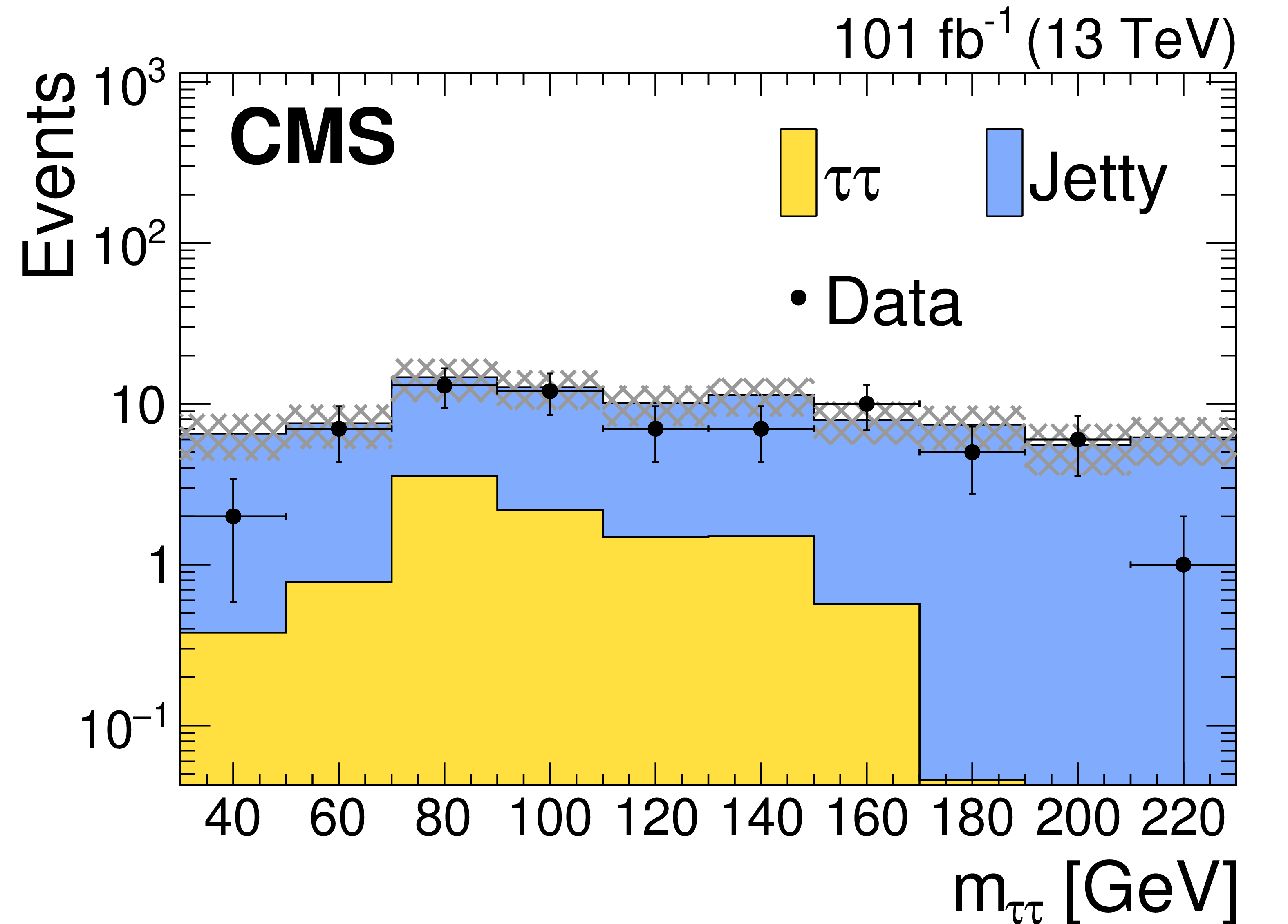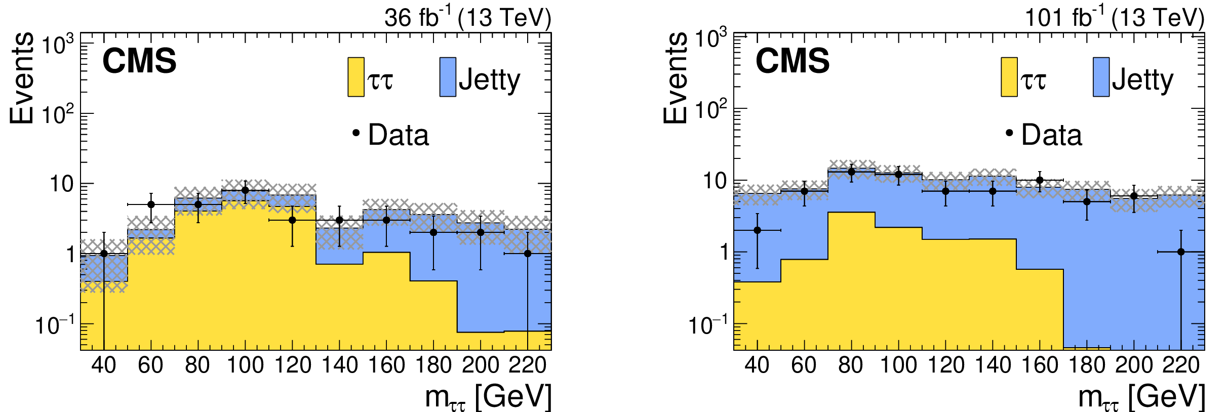 Distributions of the reconstructed ditau invariant mass ($ m_{\tau\tau} $) in the BDT sideband CR, shown for Phase0 (left) and Phase1 (right) detector configurations. The non-$ \tau\tau $ background is estimated using the data-driven Jetty background method described in the text. The gray hatching shows the statistical uncertainty in the background prediction. |