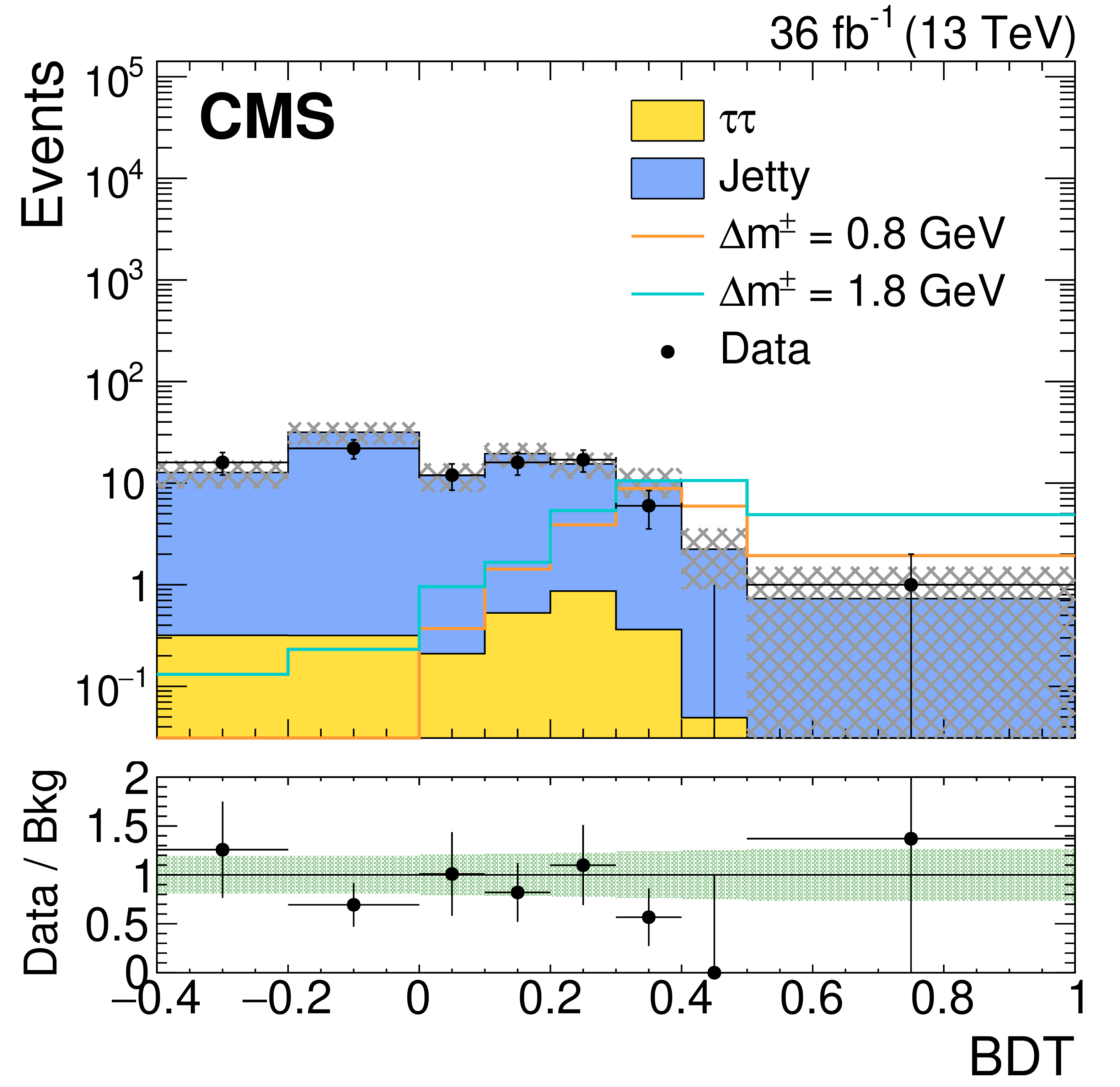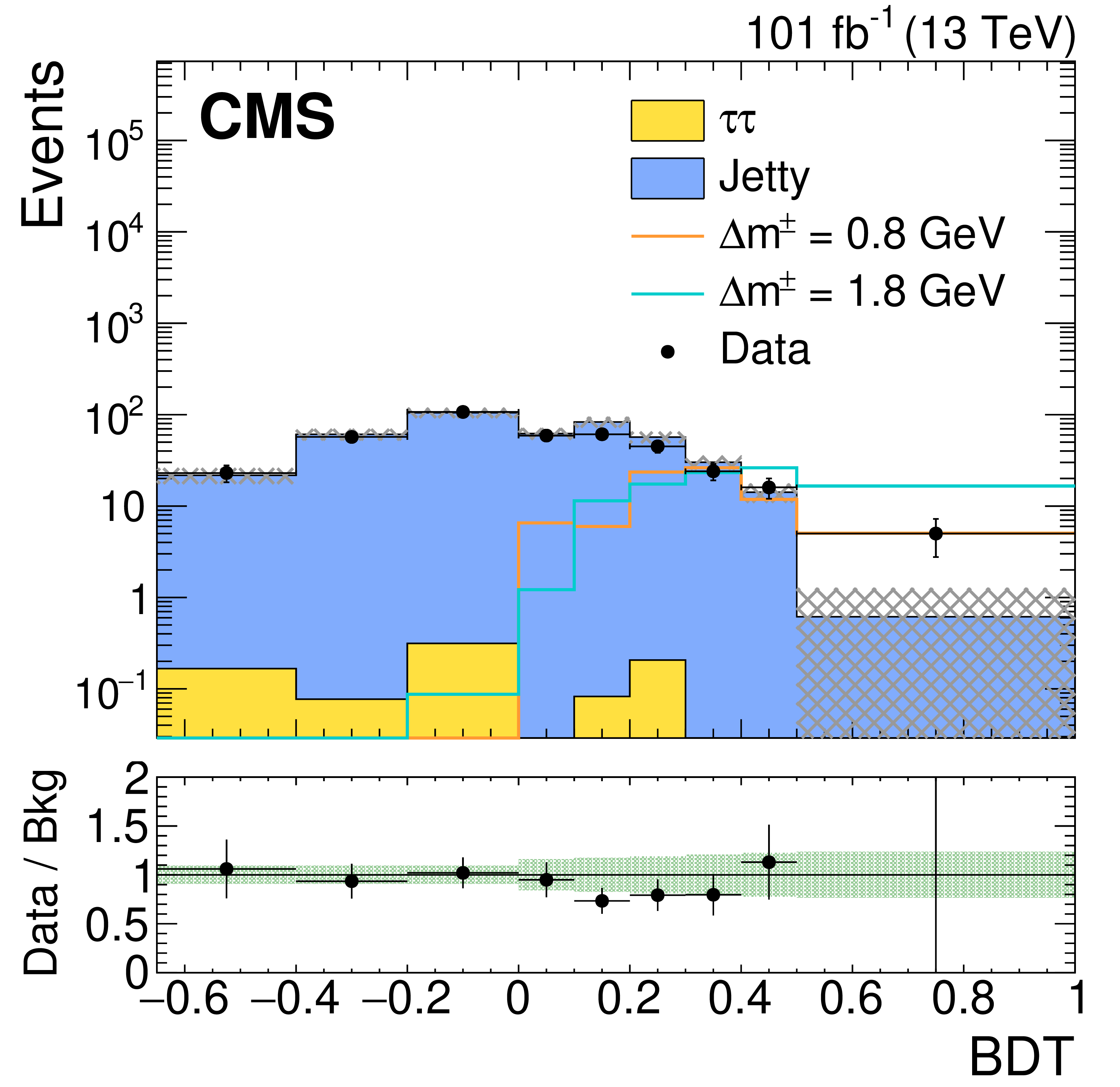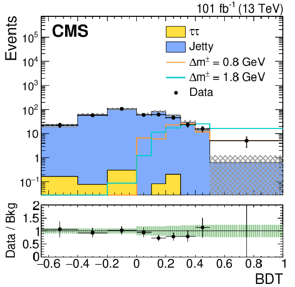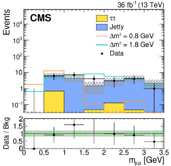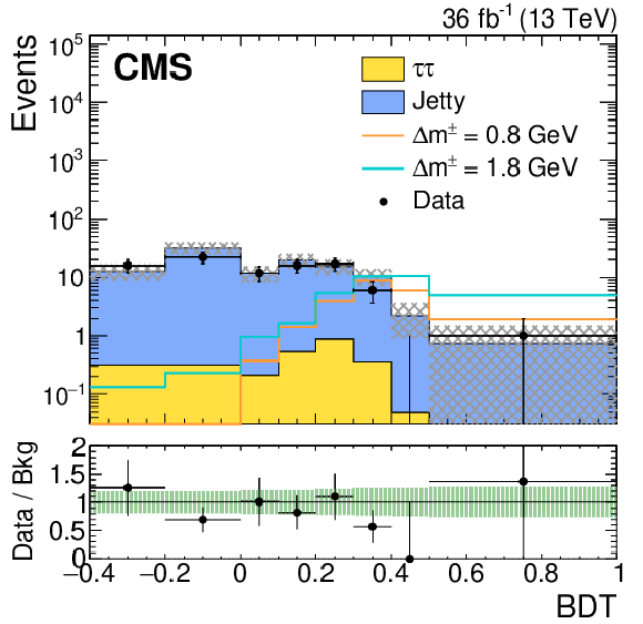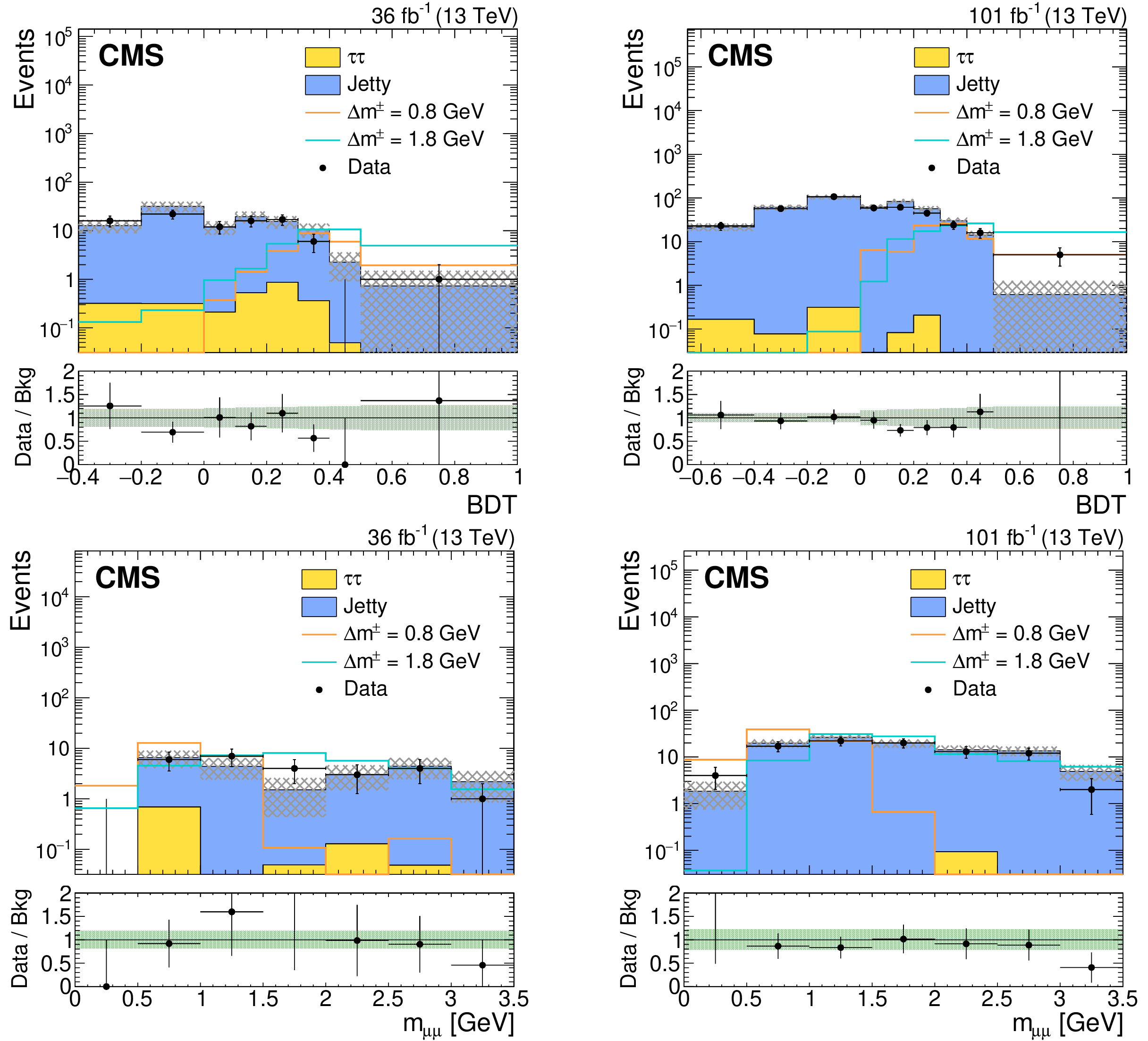 Distributions of the reconstructed ditau invariant mass ($ m_{\tau\tau} $) in the BDT sideband CR, shown for Phase0 (left) and Phase1 (right) detector configurations. The non-$ \tau\tau $ background is estimated using the data-driven Jetty background method described in the text. The gray hatching shows the statistical uncertainty in the background prediction. |