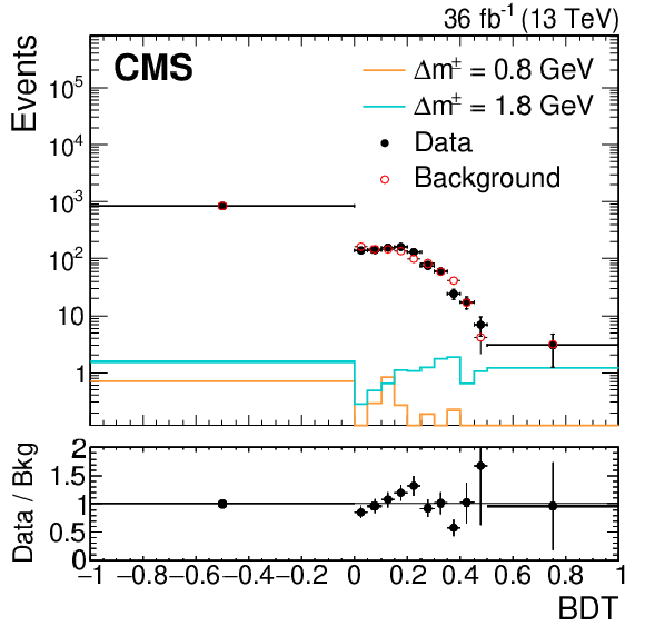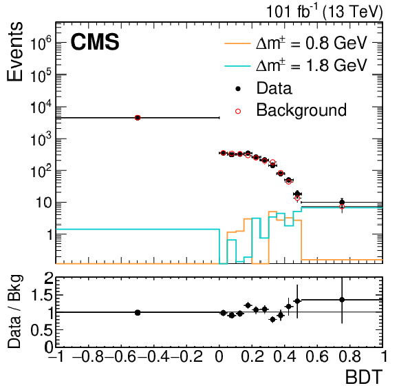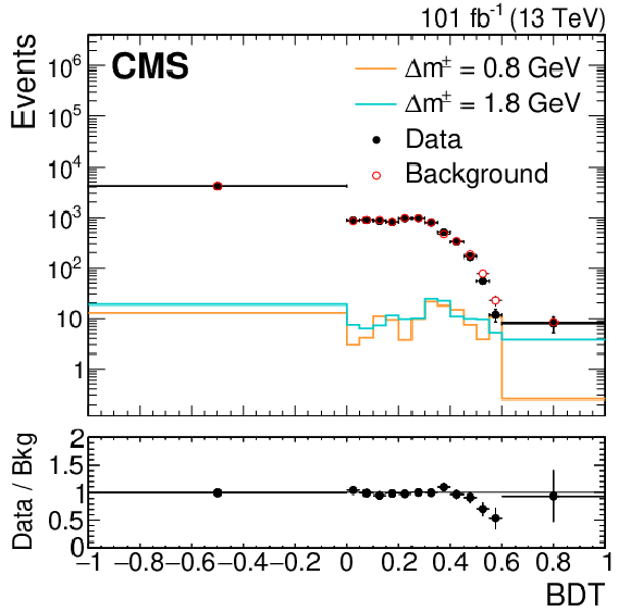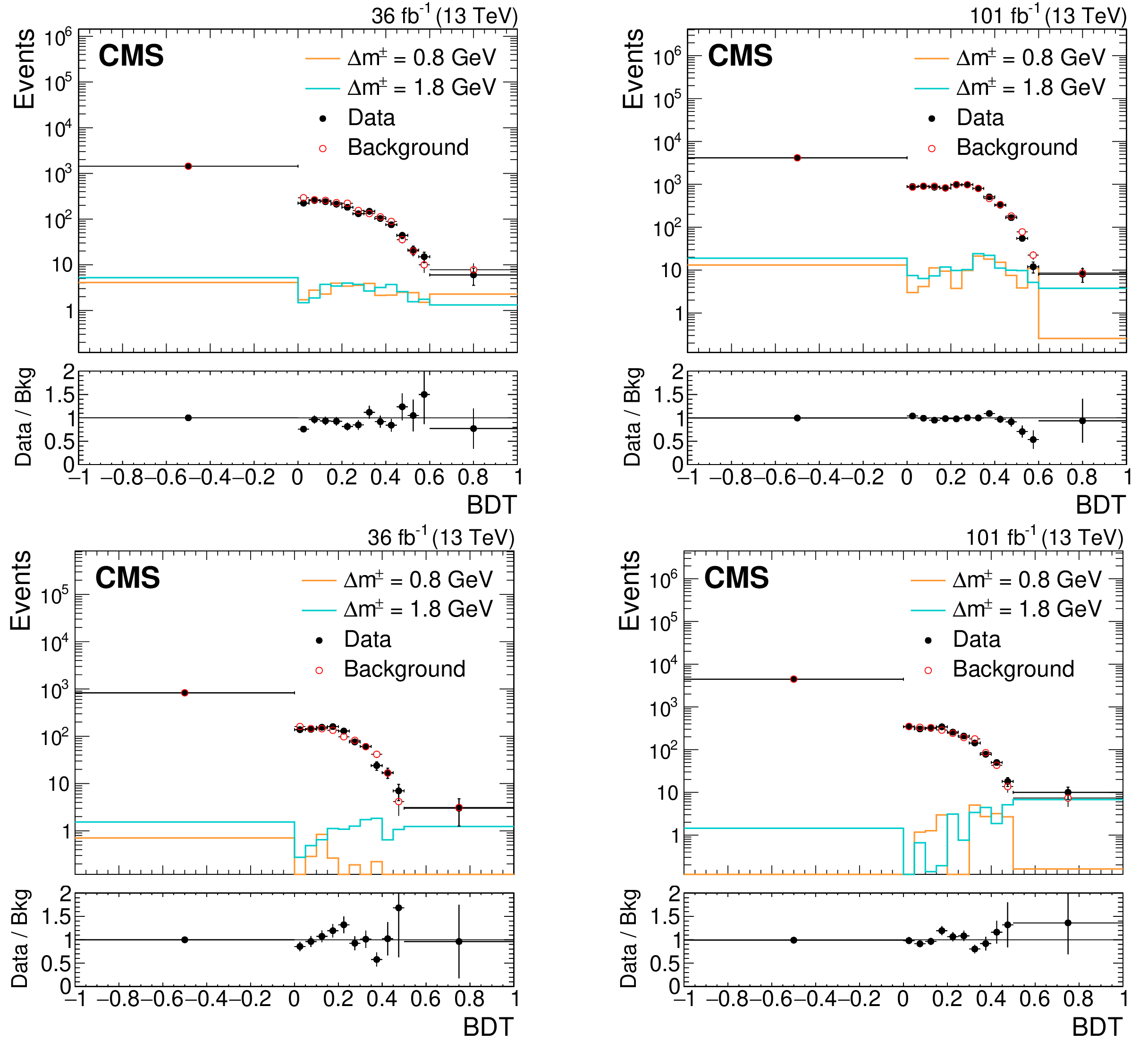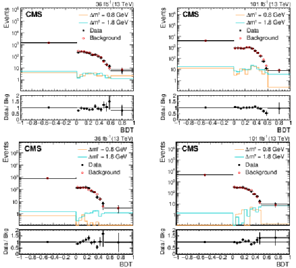 Prefit expected and observed distributions of the event BDT output score in the SRs for the muon + exclusive track category (upper), and the electron + exclusive track category (lower), shown separately for Phase0 (left) and Phase1 (right). In the lower panel, the vertical black bars represent the total uncertainty, including both statistical and systematic components. Example signal benchmark scenarios are also shown as colored lines. |