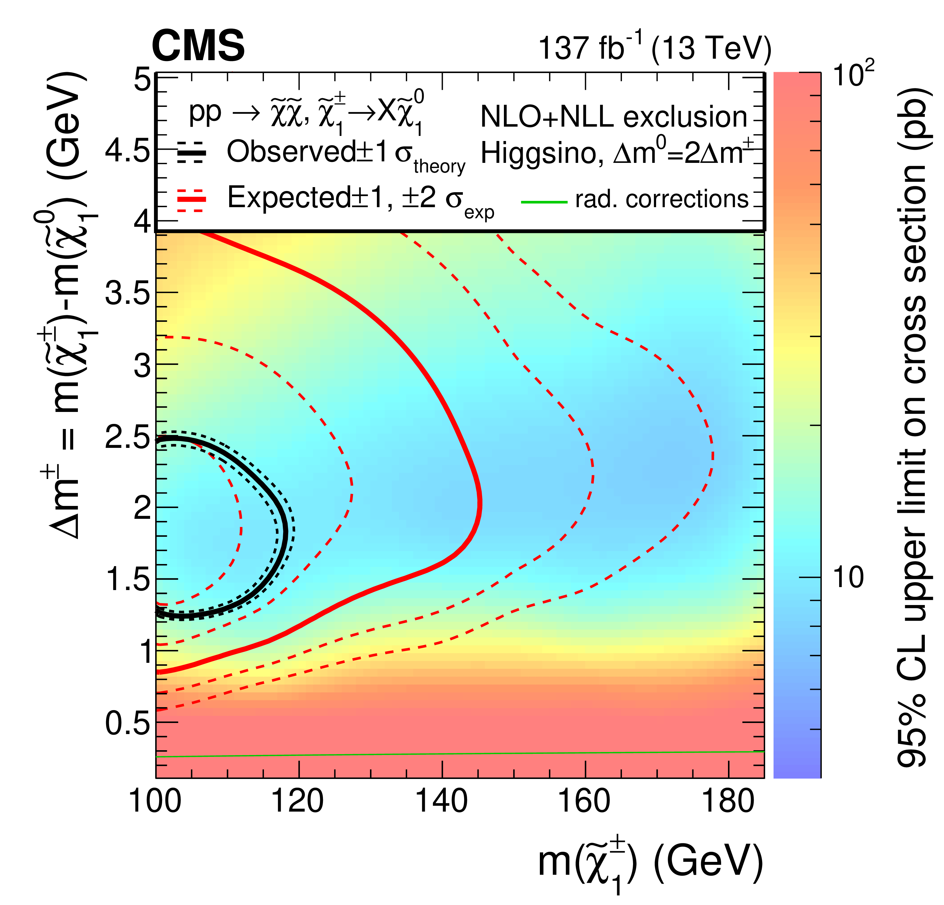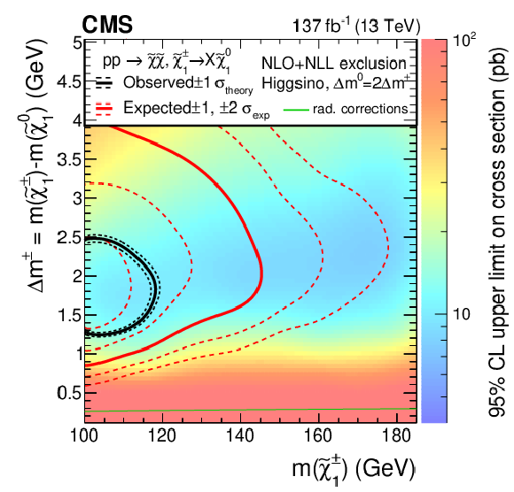 The 95% CL upper limits on the fully degenerate Higgsino production cross section, calculated at NLO+NLL precision [80,81], based on all analysis channels studied in this paper. All relevant production modes are simulated at LO, and the Z* boson is set to decay into either two electrons or two muons with a branching fraction of 5%. The expected (red) and observed (black) exclusion contours are shown assuming the theoretical cross section. Dashed red lines indicate the expected limits with $ \pm $1 and $ \pm $2 standard deviation experimental uncertainties. Dashed black lines indicate the observed limit when varying the theoretical cross section by its uncertainty. The green line represents the minimum $ \Delta m^\pm $ allowed by the theoretical calculation accounting for radiative corrections, as described in Ref. [24]. |