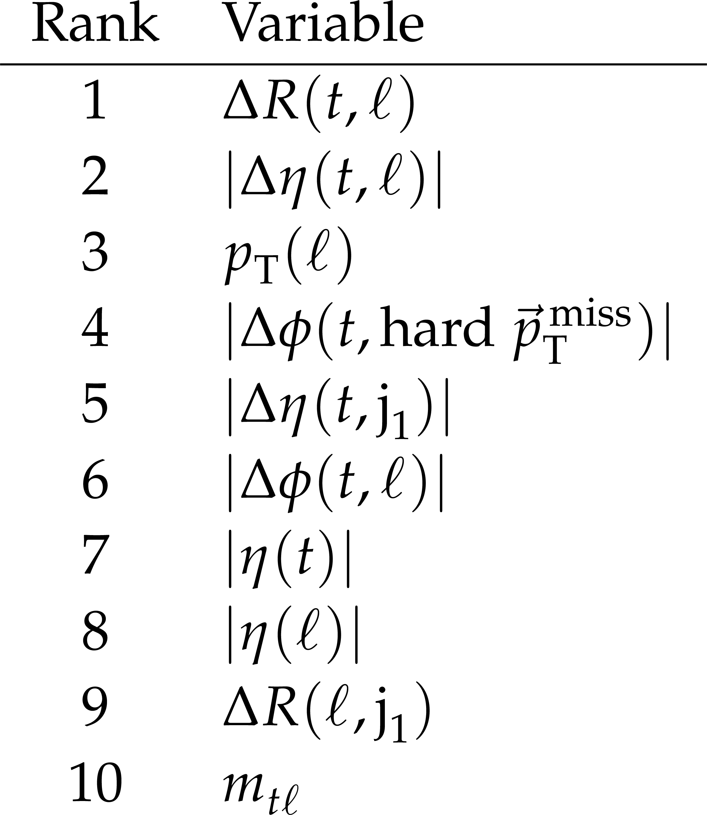 Input variables to the BDT used for selecting signal tracks in events in the exclusive track category, ranked by their importance in descending order. The symbol \ell refers to a candidate lepton while $ t $ refers to an exclusive track, with their invariant mass denoted $ m_{t\ell} $. |