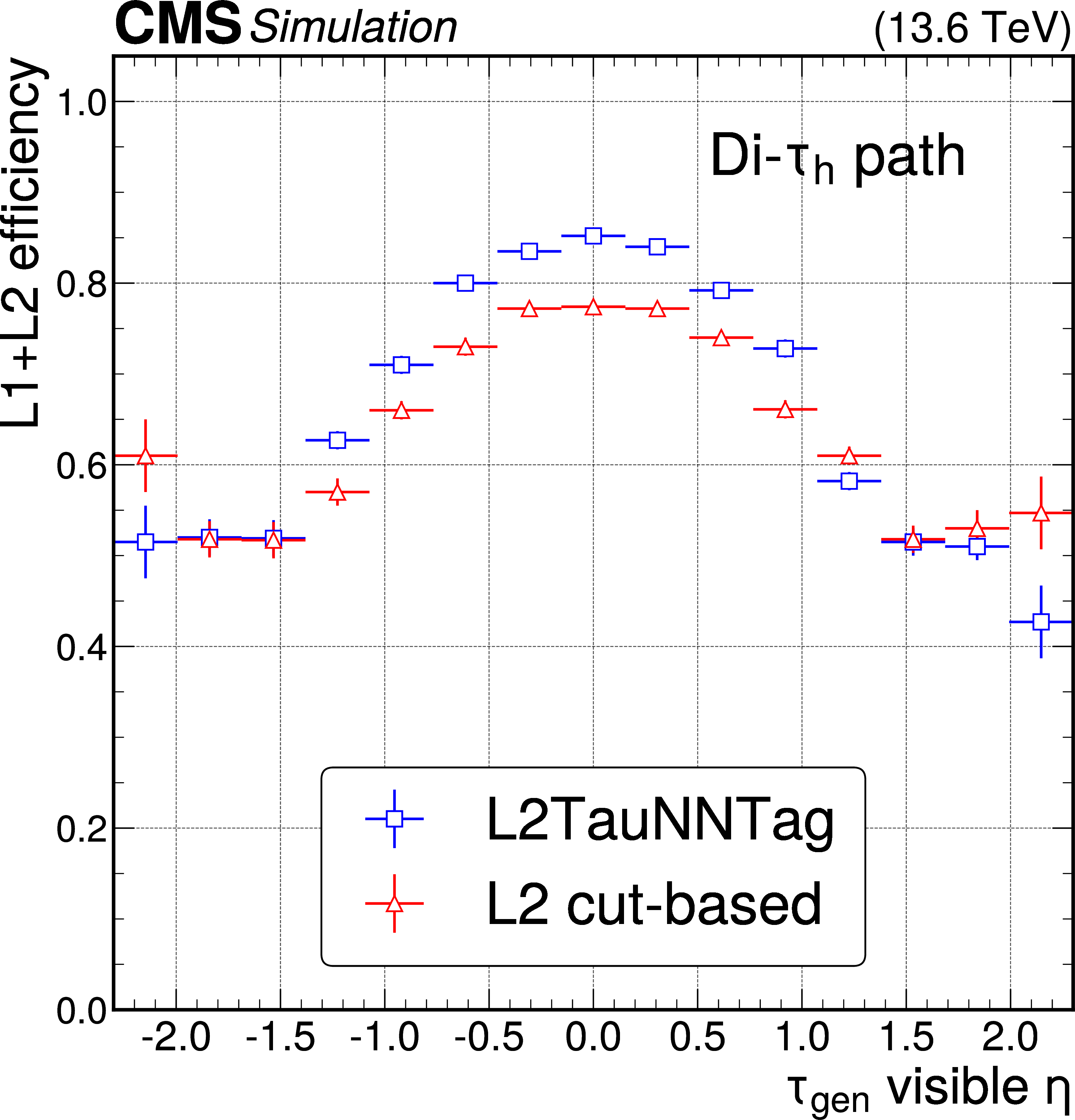 Performance of the L2TAUNNTAG in the di-$ \tau_\mathrm{h} $ HLT path, using simulated $ \mathrm{H}\to\tau\tau $ and BSM $ \mathrm{Z}^{'}\to\tau\tau $ events. The absolute efficiency of the reconstructed L2 $ \tau_\mathrm{h} $ candidates as a function of the visible generator-level $ \tau_\mathrm{h} p_{\mathrm{T}} $ (left) and $ \eta $ (right) are shown, where ``visible'' refers to the fact that the contribution of neutrinos is not taken into account. The uncertainties shown by the vertical bars are from the number of events available in the sample, while the horizontal bars show the bin width. Some of the vertical bars are smaller than the markers and are not shown. |