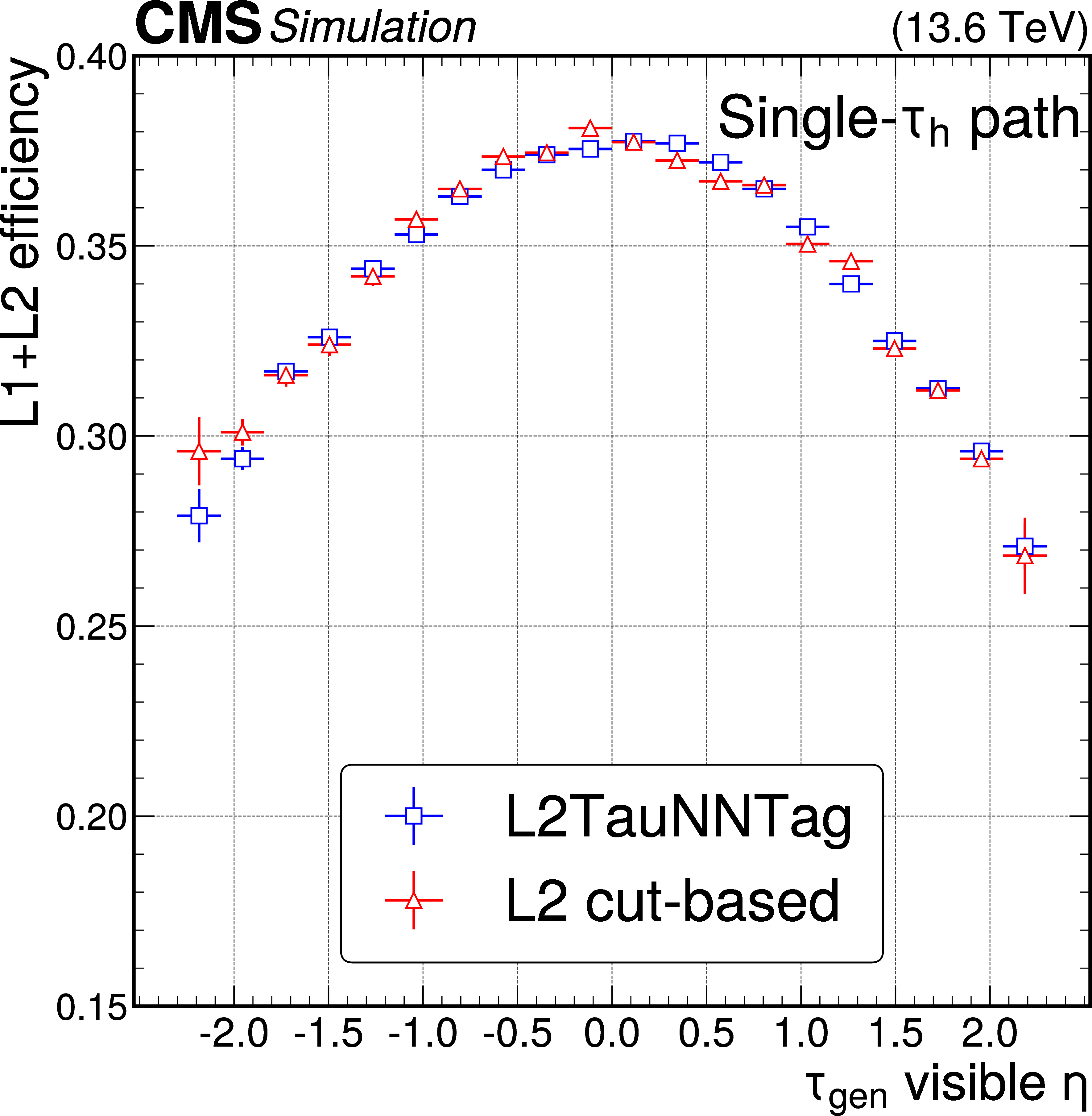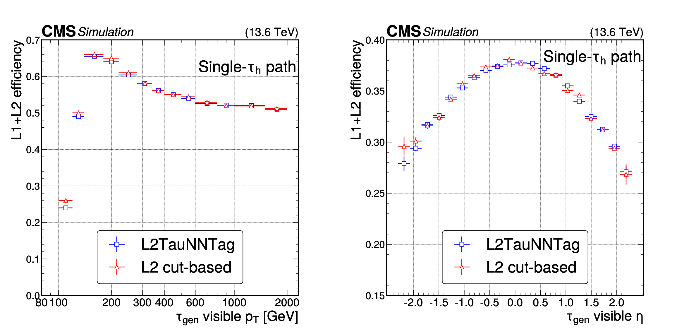 Performance of the L2TAUNNTAG in the single-$ \tau_\mathrm{h} $ HLT path, using simulated $ \mathrm{H}\to\tau\tau $ and BSM $ \mathrm{Z}^{'}\to\tau\tau $ events. The absolute efficiency of the reconstructed L2 $ \tau_\mathrm{h} $ candidates as a function of the visible generator-level $ \tau_\mathrm{h} p_{\mathrm{T}} $ (left) and $ \eta $ (right) are shown, where ``visible'' refers to the fact that the contribution of neutrinos is not taken into account. The uncertainties shown by the vertical bars are from the number of events available in the sample, while the horizontal bars show the bin width. Some of the vertical bars are smaller than the markers and are not shown. |