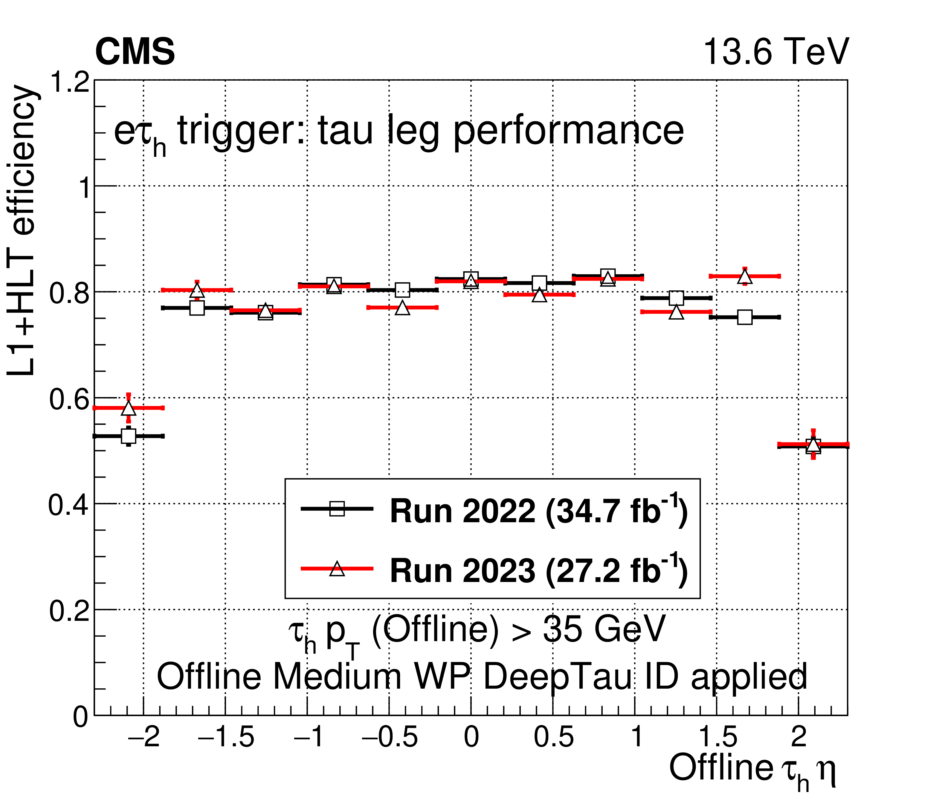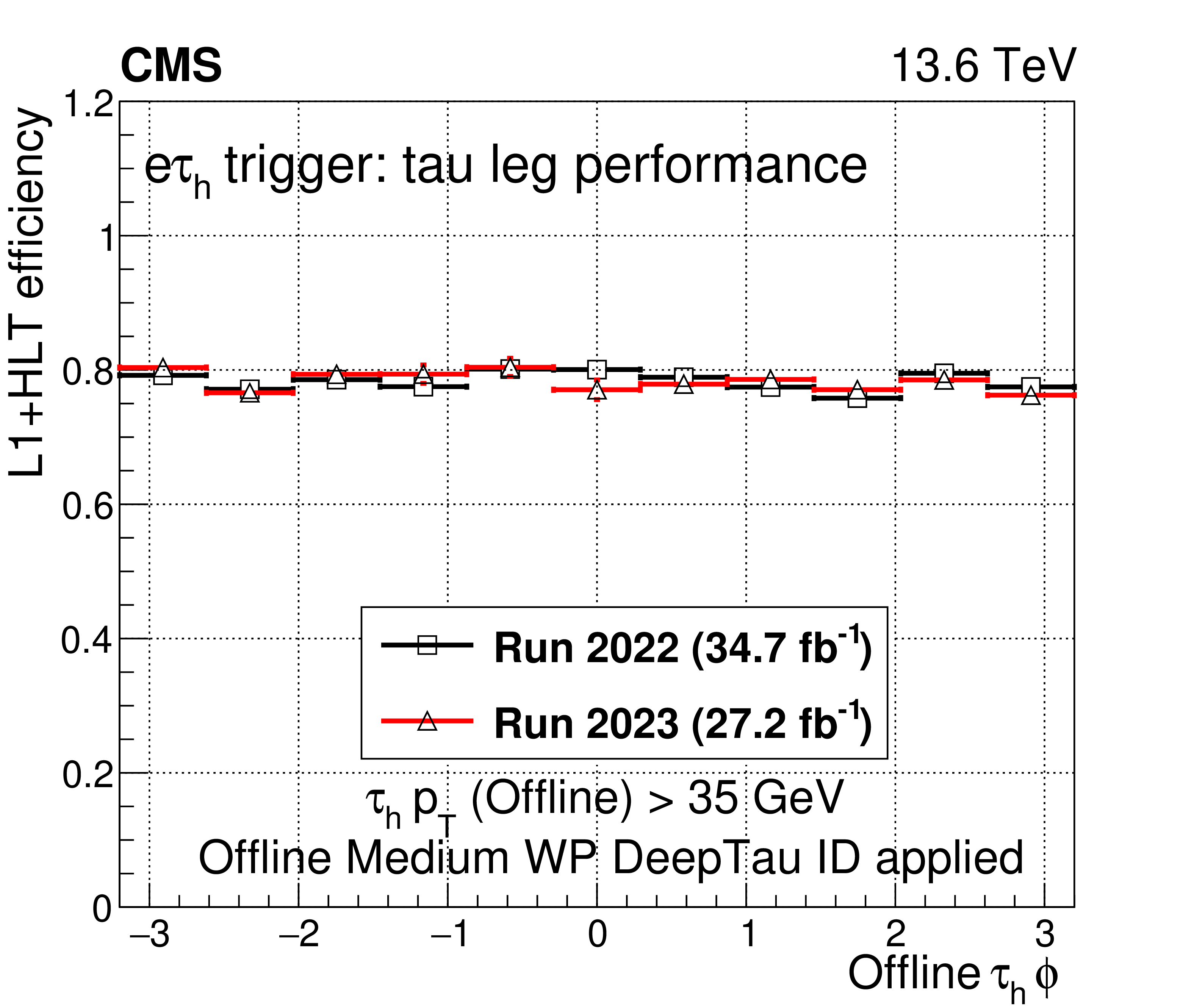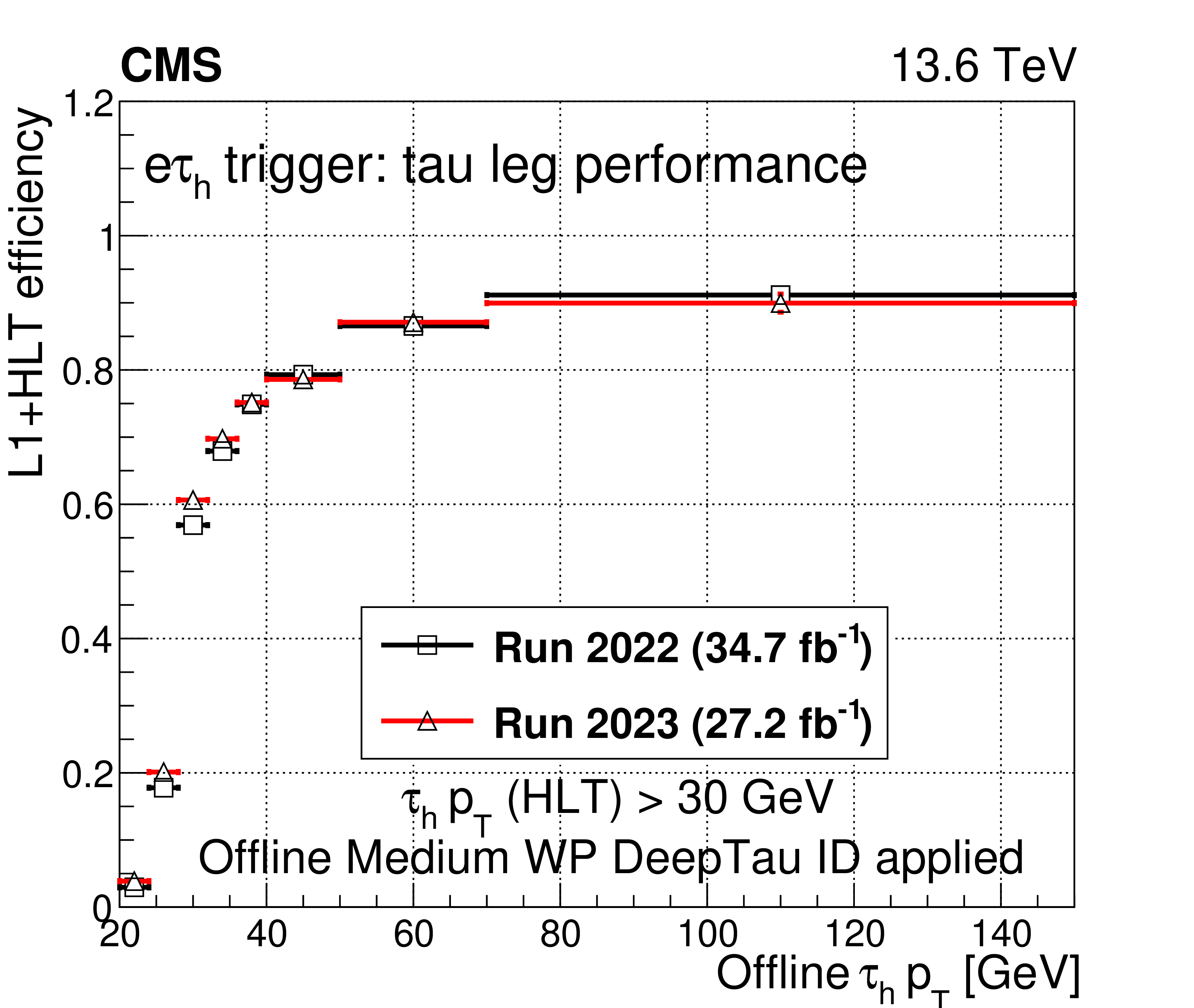 A comparison of the L1$ + $ HLT efficiency of the $ \mathrm{e}\tau_\mathrm{h} $ monitoring HLT path in 2022 and 2023 as a function of offline $ \tau_\mathrm{h} $ candidate $ p_{\mathrm{T}} $ (upper left), $ \eta $ (upper right), and $ \phi $ (lower left). The dependence on the $ N_{\text{PV}} $ is also shown (lower right). The uncertainties shown by the vertical bars are from the number of events available in the sample, while the horizontal bars show the bin width. Some of the vertical bars are smaller than the markers and are not shown. |