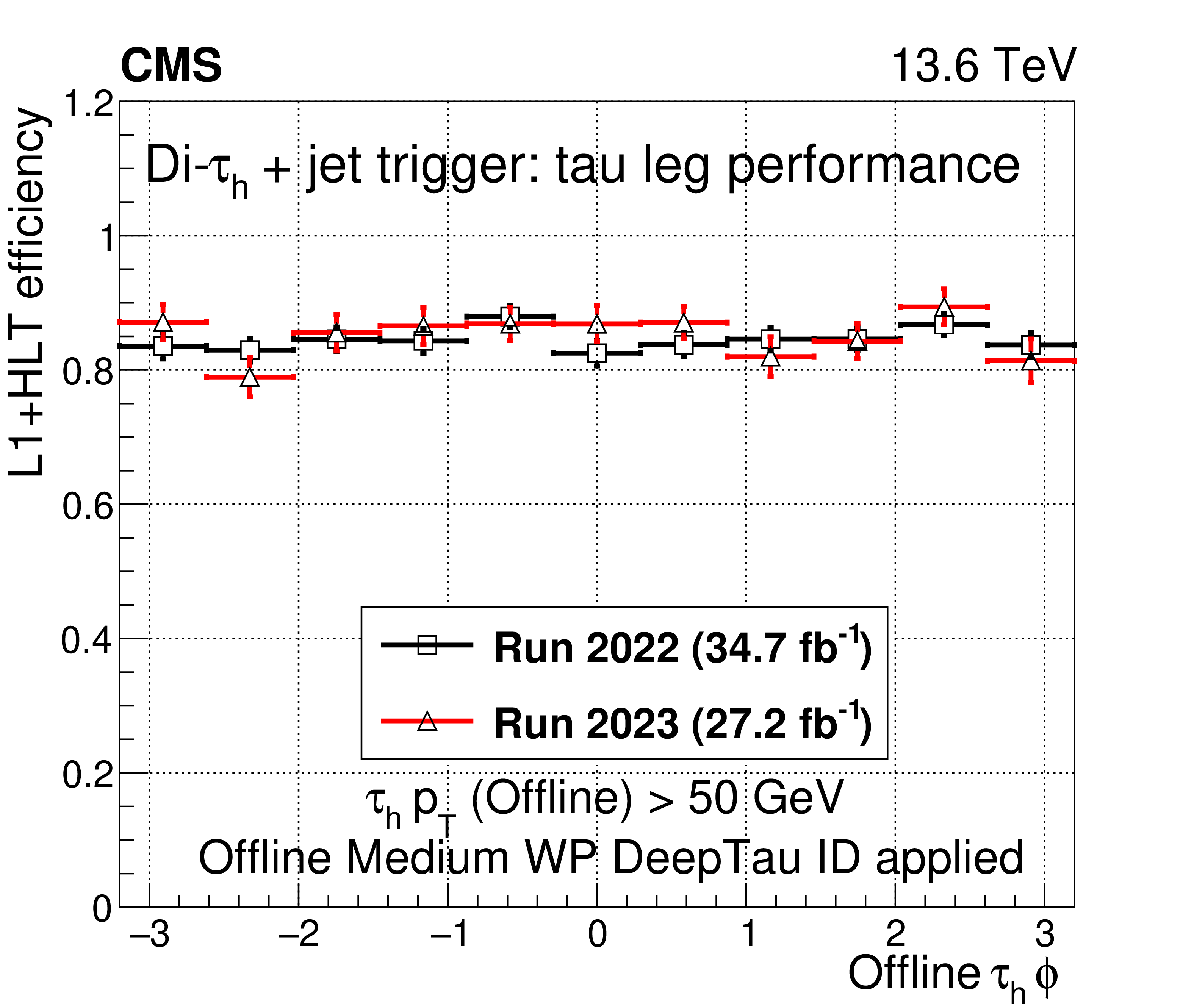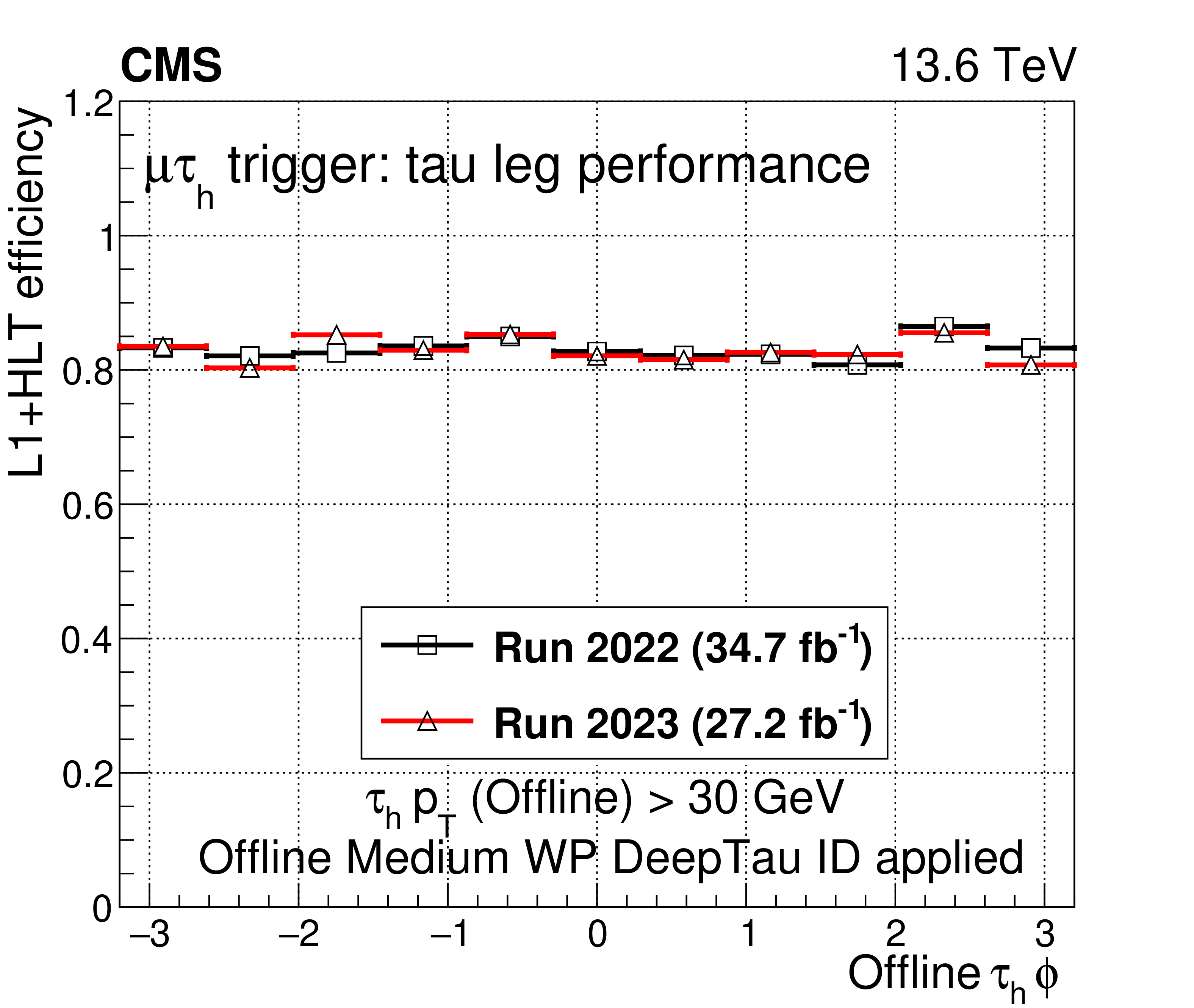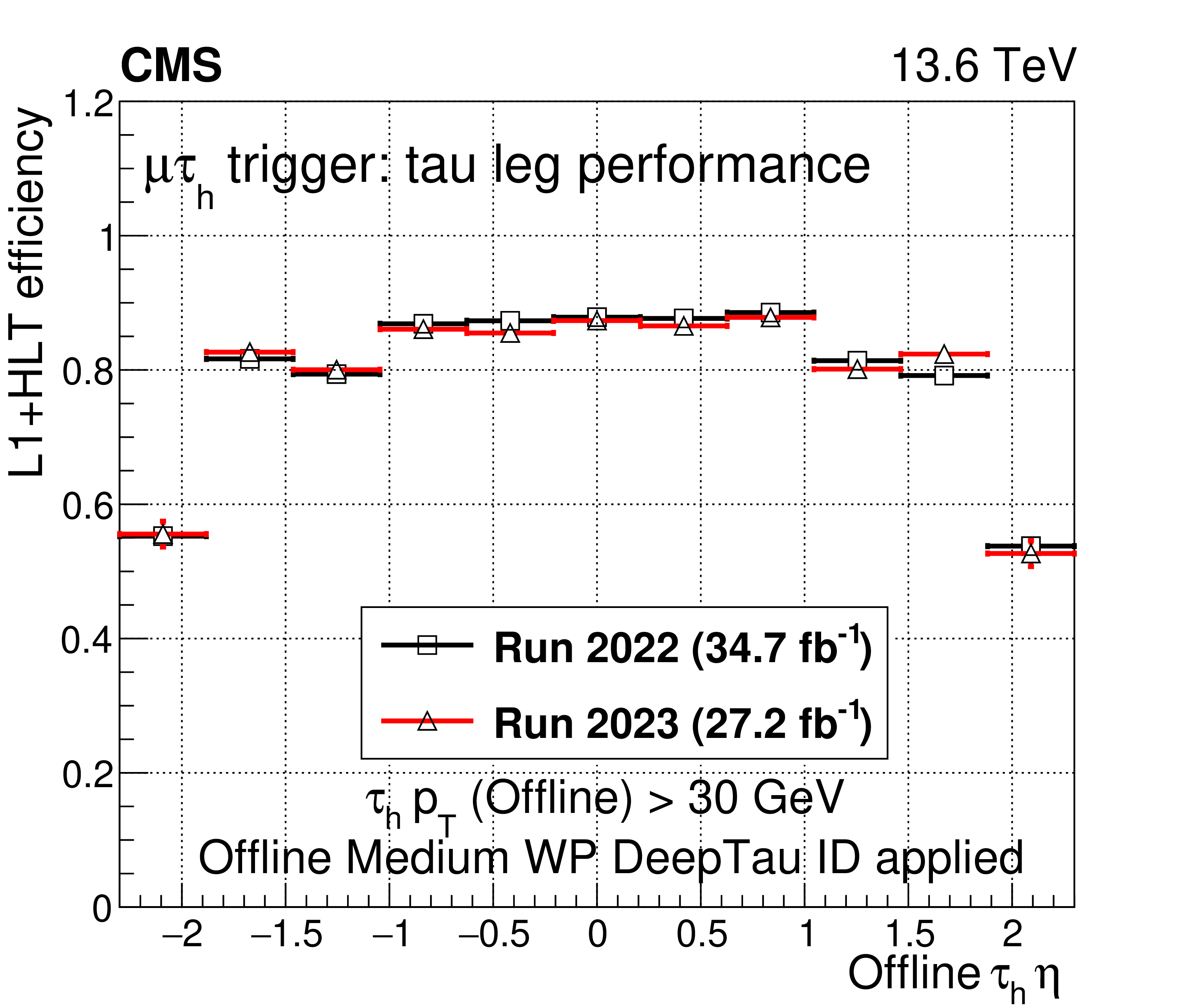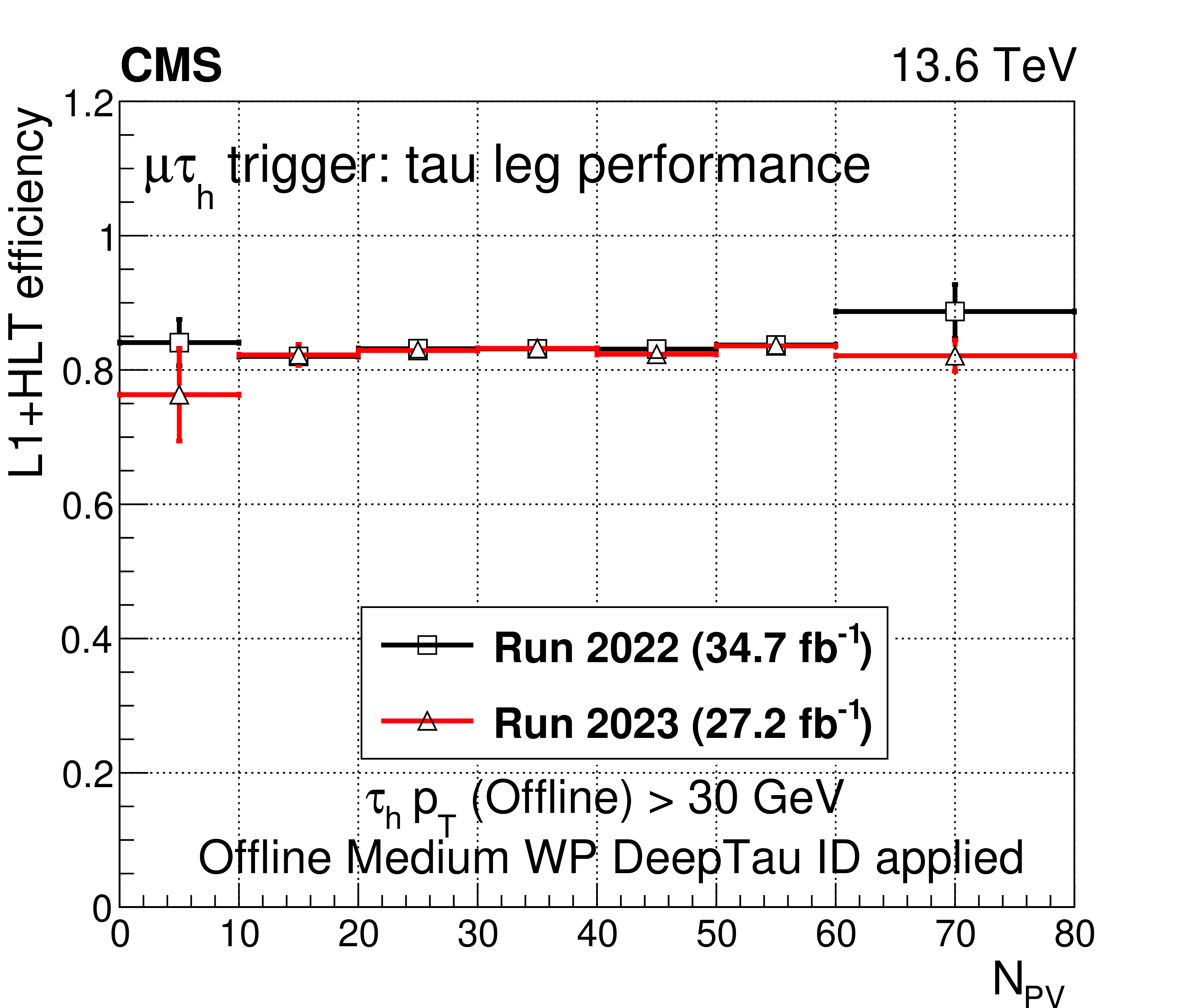 A comparison of the L1$ + $ HLT efficiency of the $ \mu\tau_\mathrm{h} $ HLT path in 2022 and 2023 as a function of offline $ \tau_\mathrm{h} $ candidate $ p_{\mathrm{T}} $ (upper left), $ \eta $ (upper right), and $ \phi $ (lower left). The dependence on the $ N_{\text{PV}} $ is also shown (lower right). The uncertainties shown by the vertical bars are from the number of events available in the sample, while the horizontal bars show the bin width. Some of the vertical bars are smaller than the markers and are not shown. |