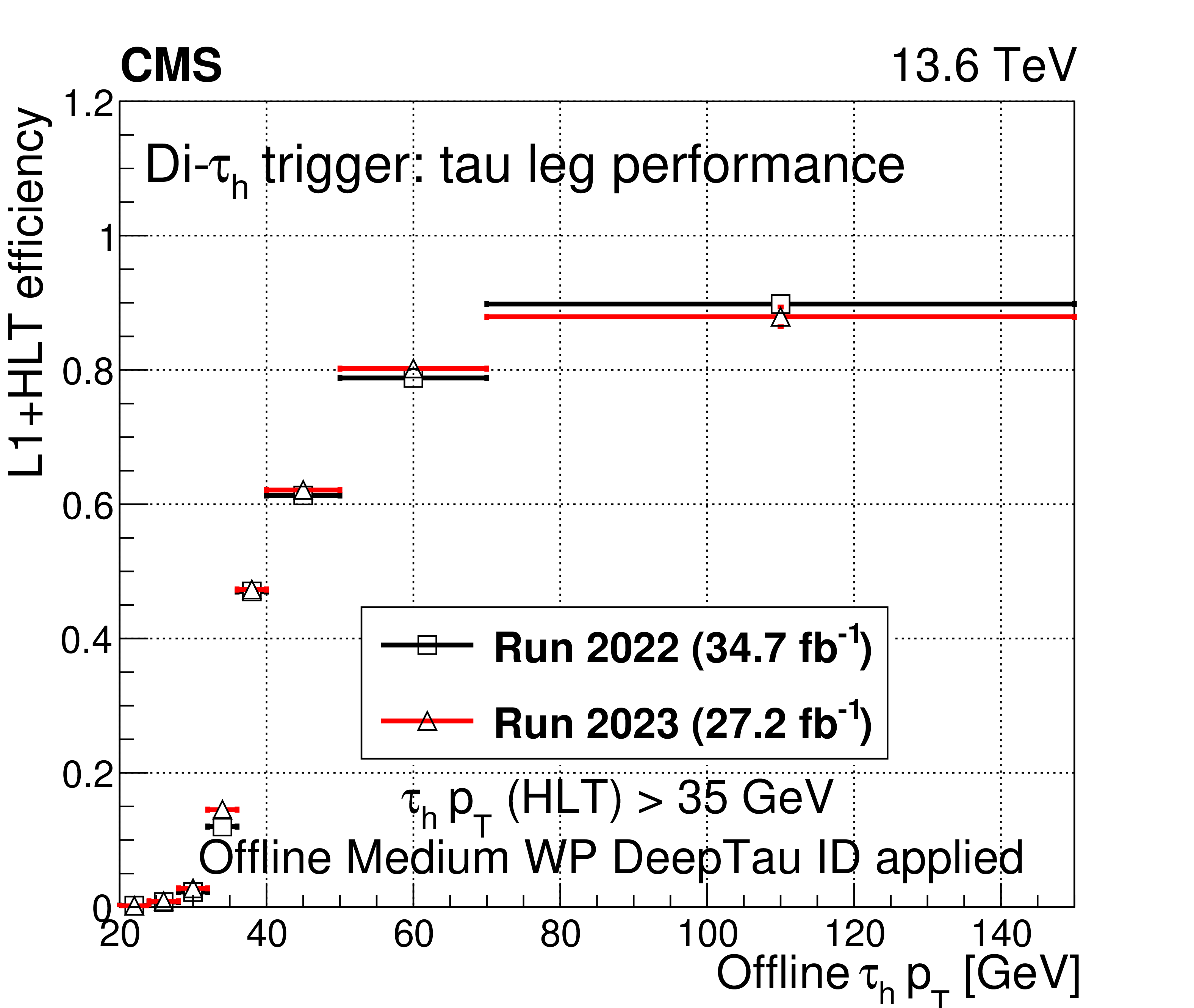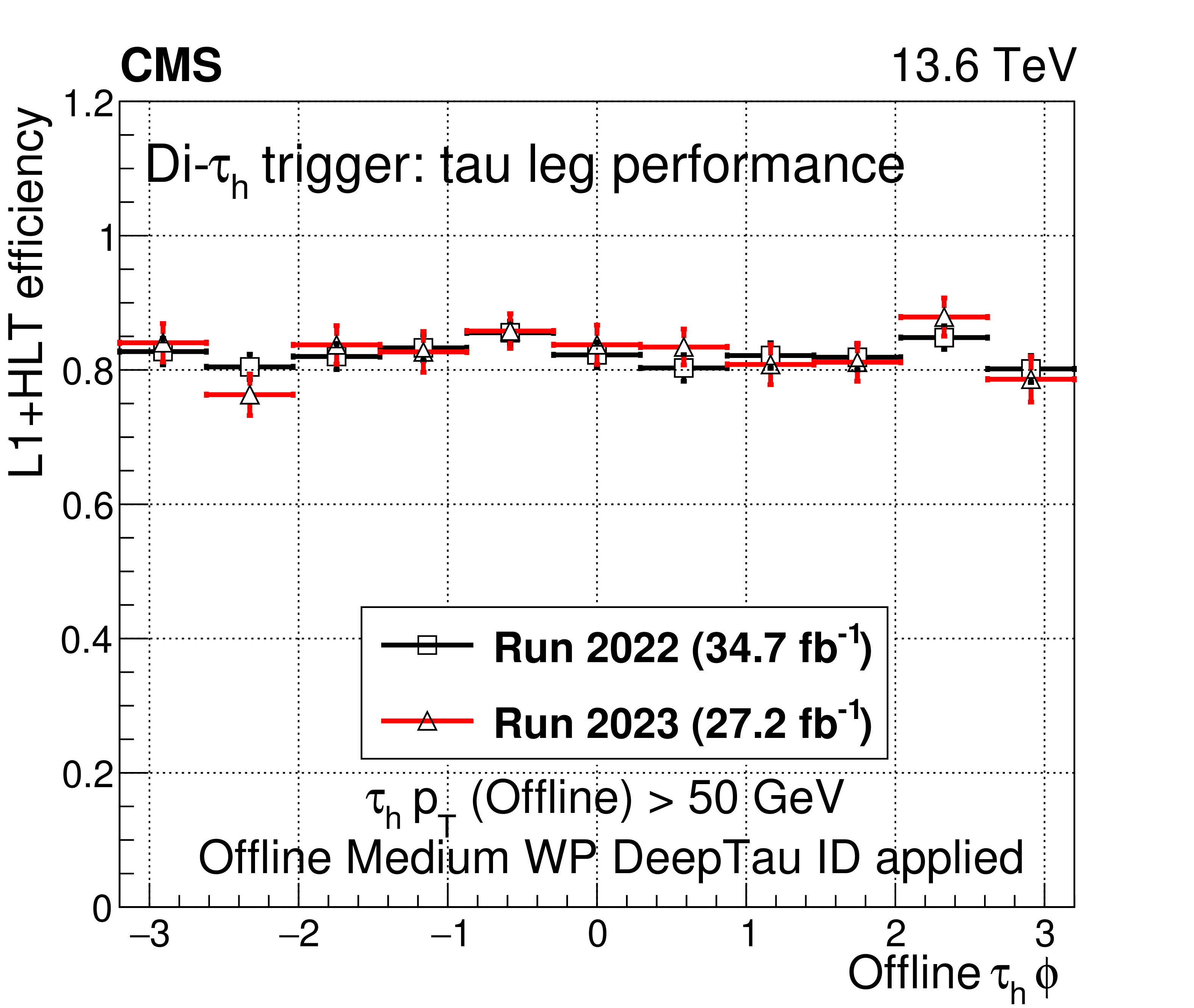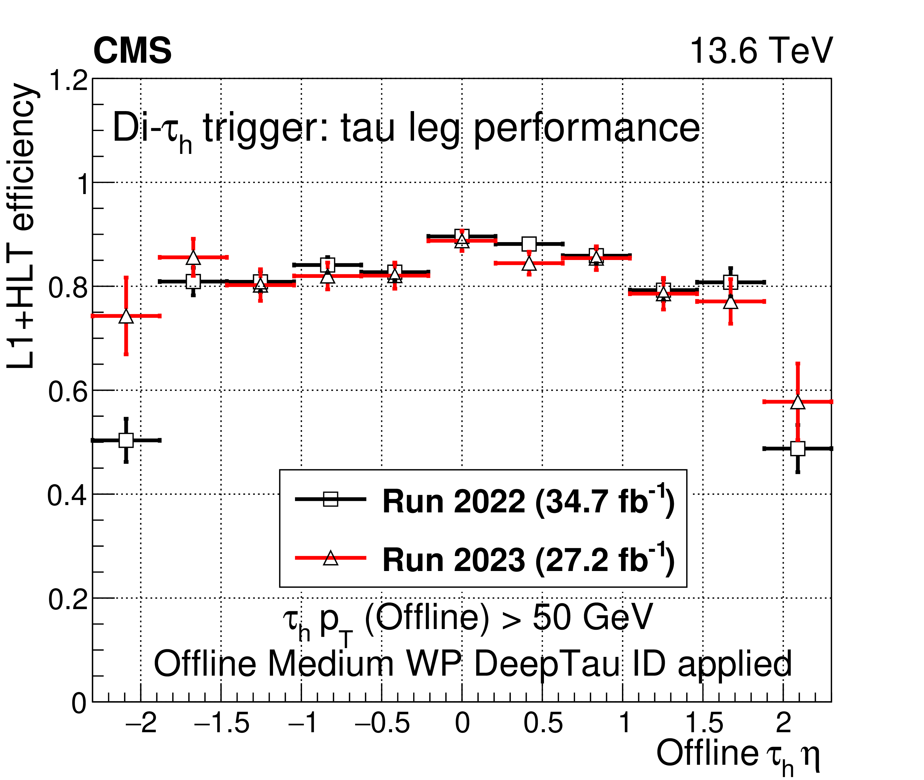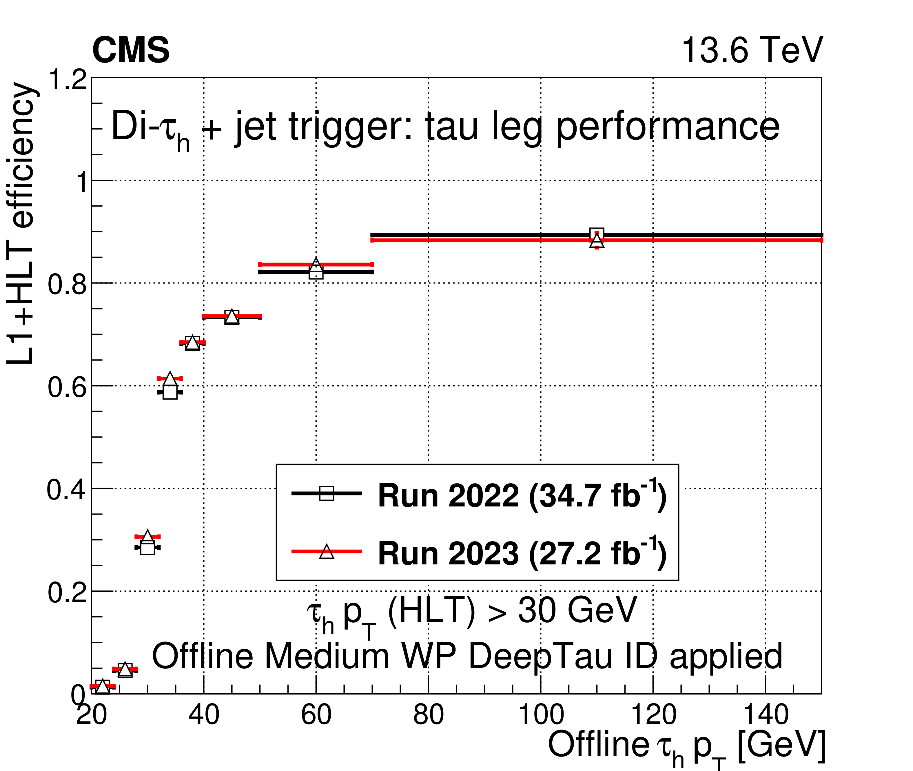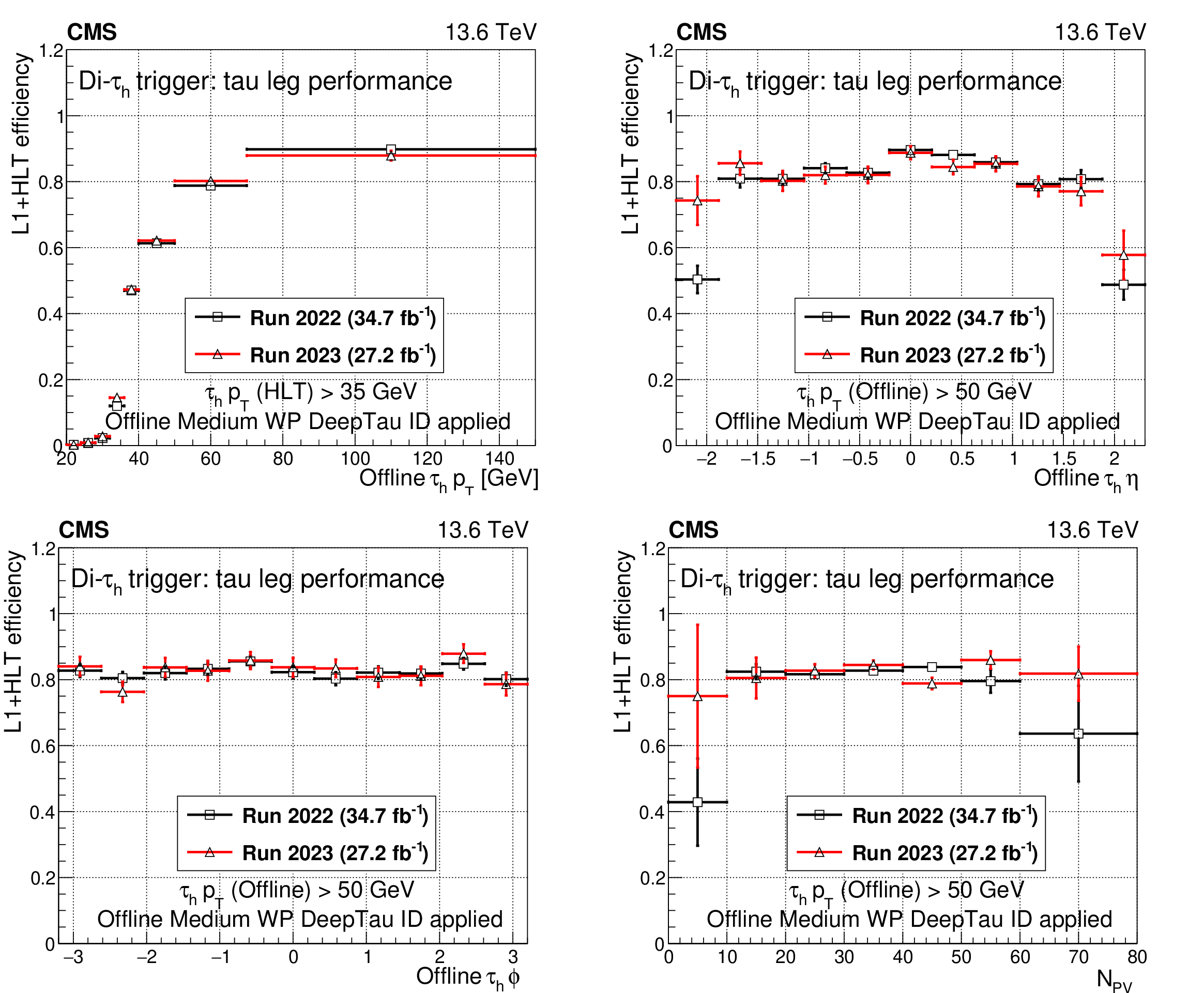 A comparison of the L1$ + $ HLT efficiency of the di-$ \tau_\mathrm{h} $ monitoring HLT path in 2022 and 2023 as a function of offline $ \tau_\mathrm{h} $ candidate $ p_{\mathrm{T}} $ (upper left), $ \eta $ (upper right), and $ \phi $ (lower left). The dependence on the $ N_{\text{PV}} $ is also shown (lower right). The uncertainties shown by the vertical bars are from the number of events available in the sample, while the horizontal bars show the bin width. Some of the vertical bars are smaller than the markers and are not shown. |