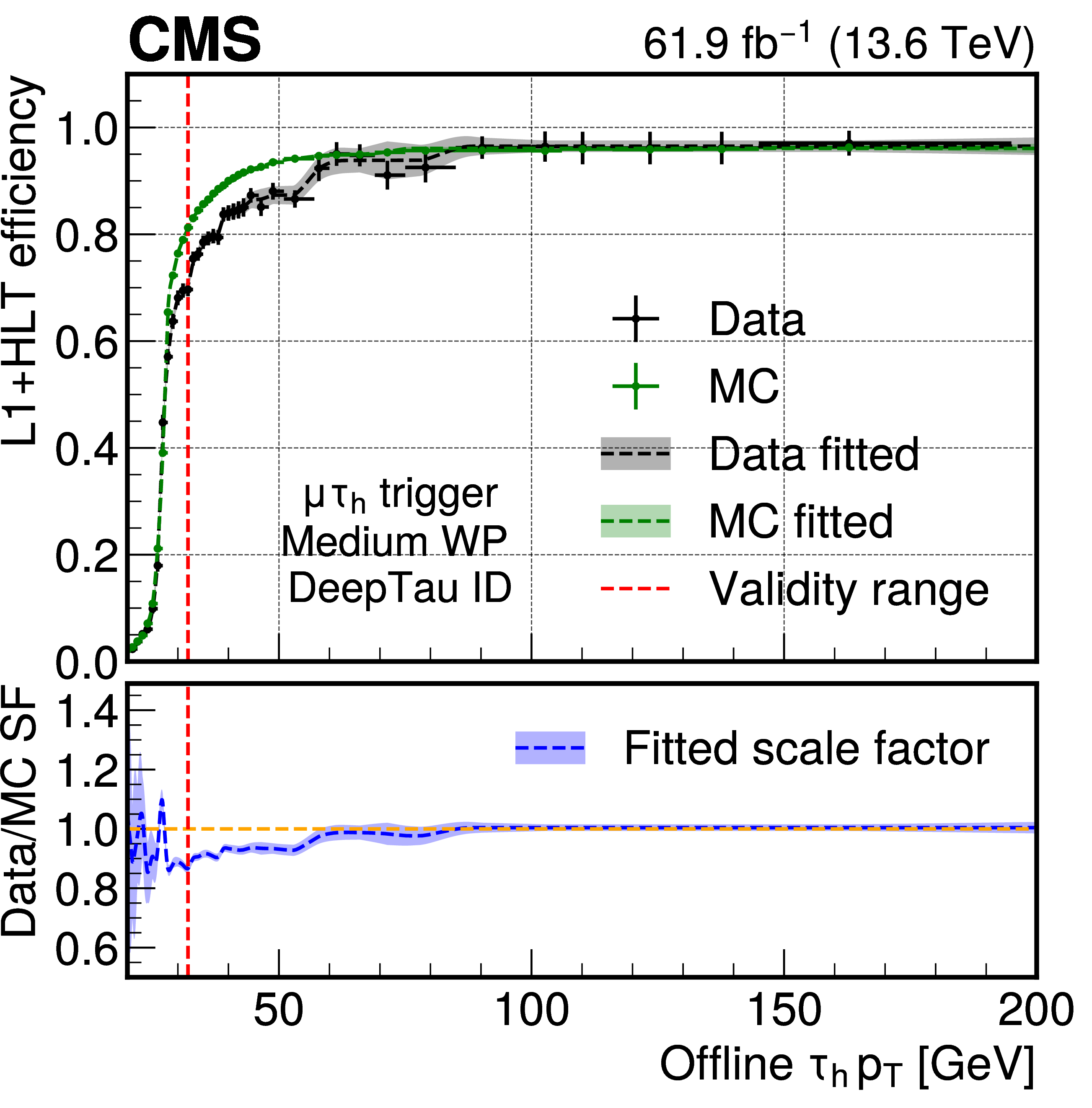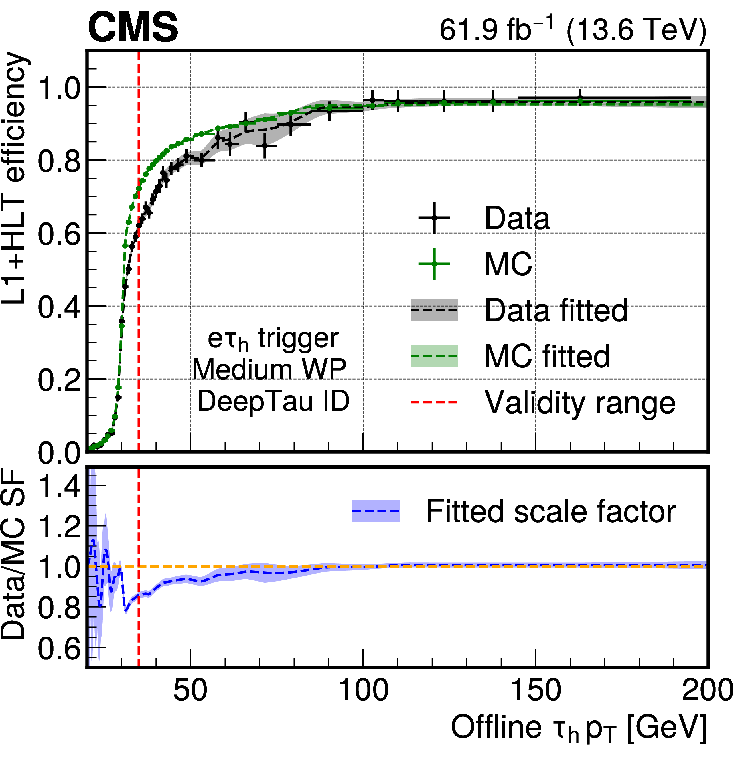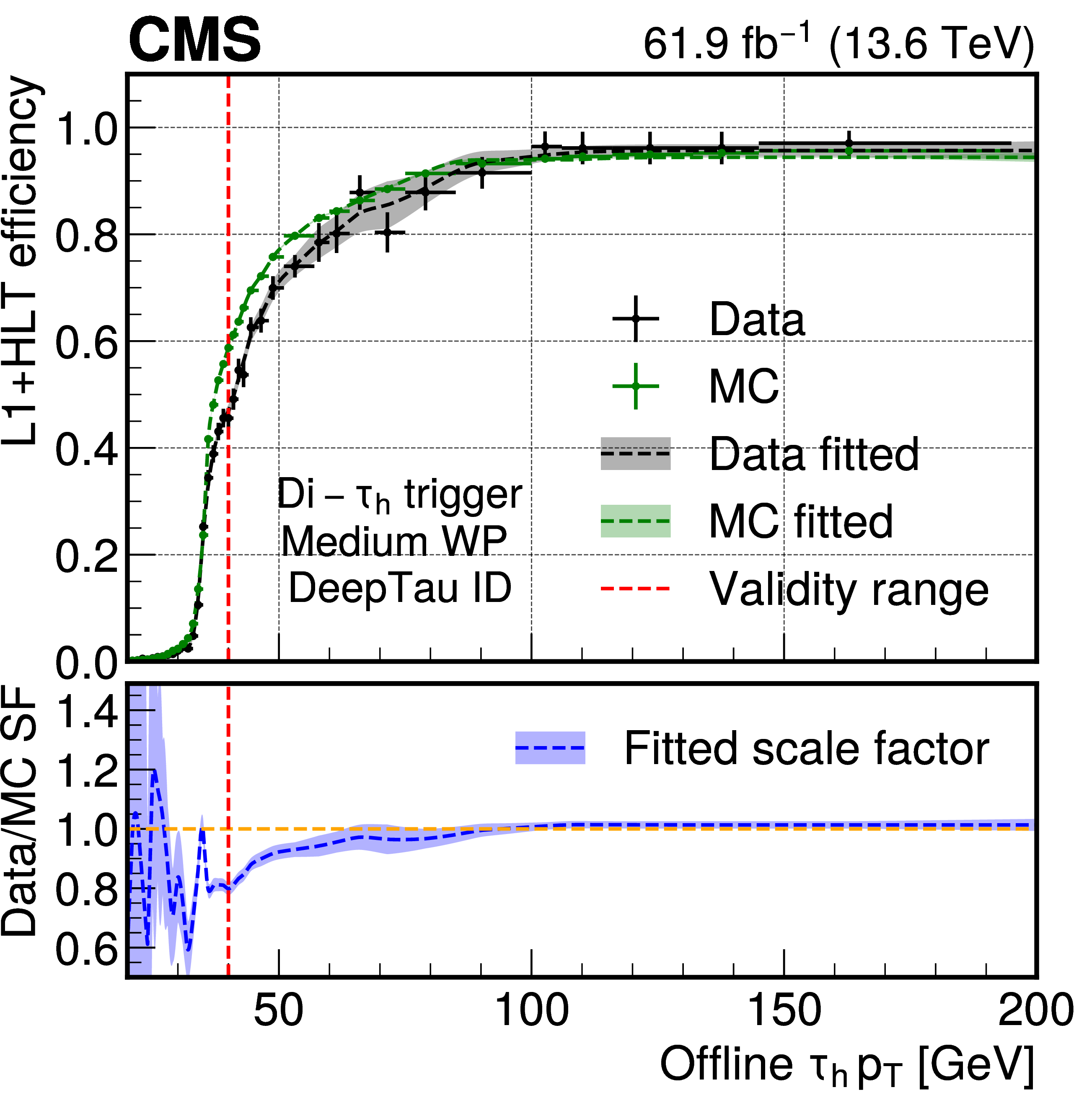 Efficiencies and scale factors of the HLT monitoring paths using 2022--2023 data as functions of the offline $ \tau_\mathrm{h} $ candidate $ p_{\mathrm{T}} $ for the $ \mathrm{e}\tau_\mathrm{h} $ (upper left), $ \mu\tau_\mathrm{h} $ (upper right), di-$ \tau_\mathrm{h} $ (lower left), and di-$ \tau_\mathrm{h}{+}\text{jet} $ (lower right) HLT paths. The measured efficiencies for data are shown with black markers, and for simulation with green markers. The uncertainties shown by the vertical bars are from the number of events available in the sample, while the horizontal bars show the bin width. Some of the vertical bars are smaller than the markers and are not shown. The systematic uncertainties are negligible with respect to the statistical uncertainties and are not included in the bands. The corresponding dotted lines of the same color display the best fit results together with the statistical uncertainty bands. The scale factors, defined as the ratios of efficiencies between data fitted and simulation fitted from the upper panels, are shown in the lower panels as blue lines with associated blue uncertainty bands. Only values to the right of the red dotted line are used in physics studies, to avoid large statistical fluctuations, as they are sufficiently above the turn-on threshold of the trigger. |