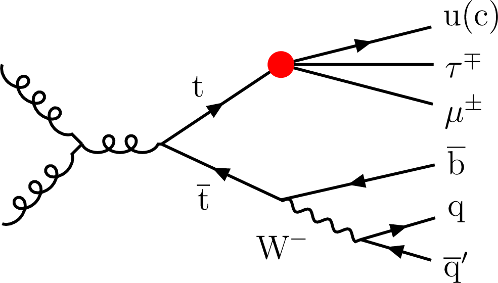 Example Feynman diagrams at leading order for the CLFV production of a single top quark (left and centre) and top quark pair production followed by a CLFV decay (right). Red dots indicate the effective CLFV coupling. |