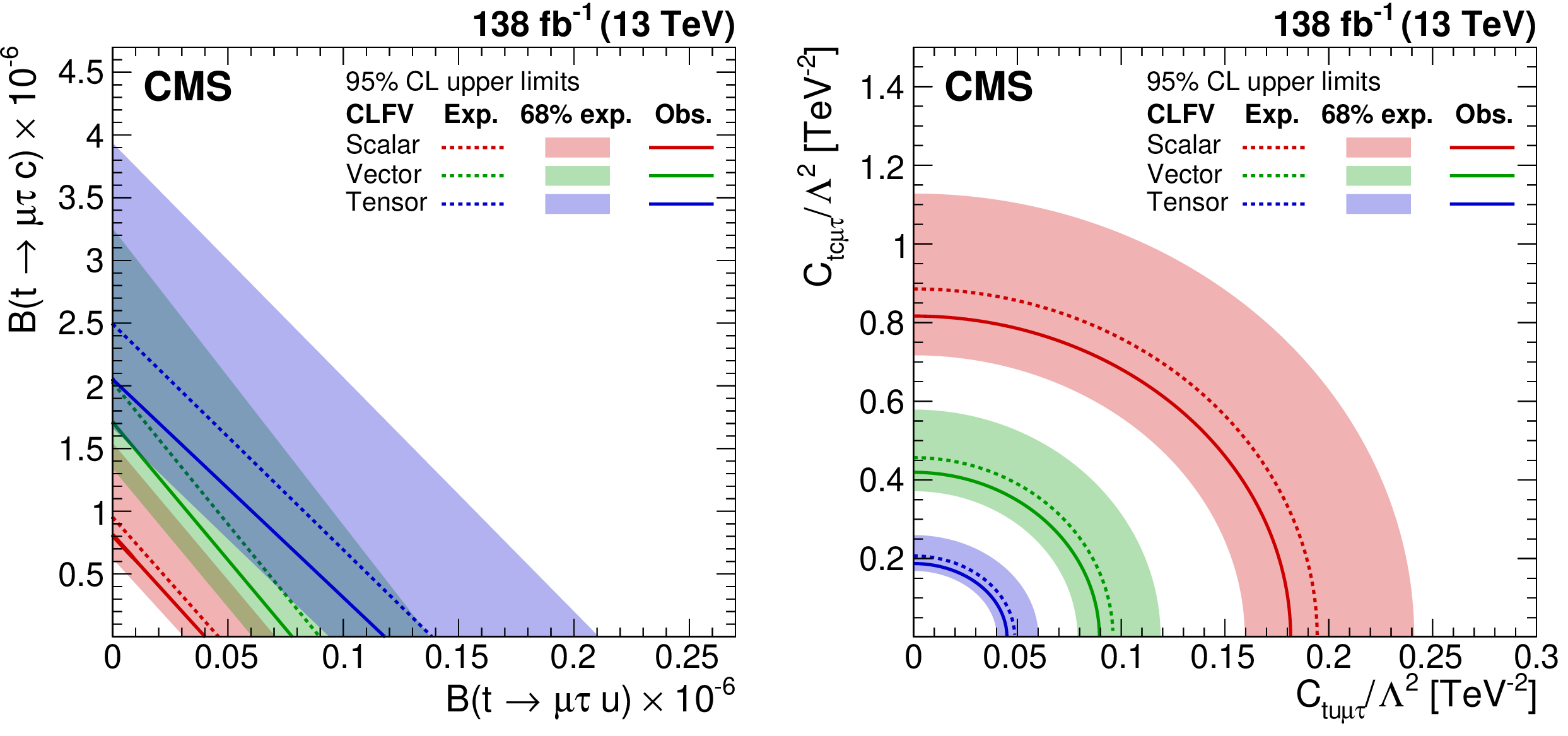 Exclusion contours for the observed and expected 95% CL upper limits and central probability intervals containing 68% of the expected upper limits for the branching fractions (left) and Wilson coefficients (right) corresponding to the $ \mathrm{t}\mathrm{u}\mu\tau $ and $ \mathrm{t}\mathrm{c}\mu\tau $ couplings for scalar, vector and tensor Lorentz structures. |