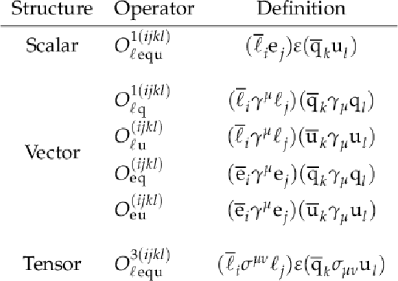 The EFT operators considered in this analysis and their definition. The $ \varepsilon $ parameter is a fully asymmetric two-dimensional tensor, $ \gamma^{\mu} $ are the Dirac matrices, and $ \sigma^{\mu\nu}=\frac{i}{2}[\gamma^{\mu},\gamma^{\nu}] $. Left-handed doublets of leptons and quarks are denoted by $ \ell_i $ and $ \mathrm{q}_k $, respectively, where the indices $ i $ and $ k $ denote the lepton and quark flavours. Right-handed lepton and quark singlets are denoted by $ \mathrm{e}_i $ and $ \mathrm{u}_k $, respectively. |