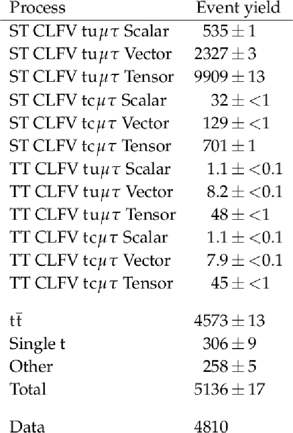 Predicted cross sections for CLFV signal processes are presented together with uncertainties from missing higher orders in matrix element calculations, considering operators with different Lorentz structures using $ C_a/\Lambda^2=1\,\text{Te\hspace{-.08em}V}^{-2} $. The results for $ \text{ST CLFV} $ are at LO accuracy and the ones for $ \text{TT CLFV} $ are at NNLO+NNLL accuracy for the $ \mathrm{t} \overline{\mathrm{t}} $ production with LO accuracy for the CLFV decay. |