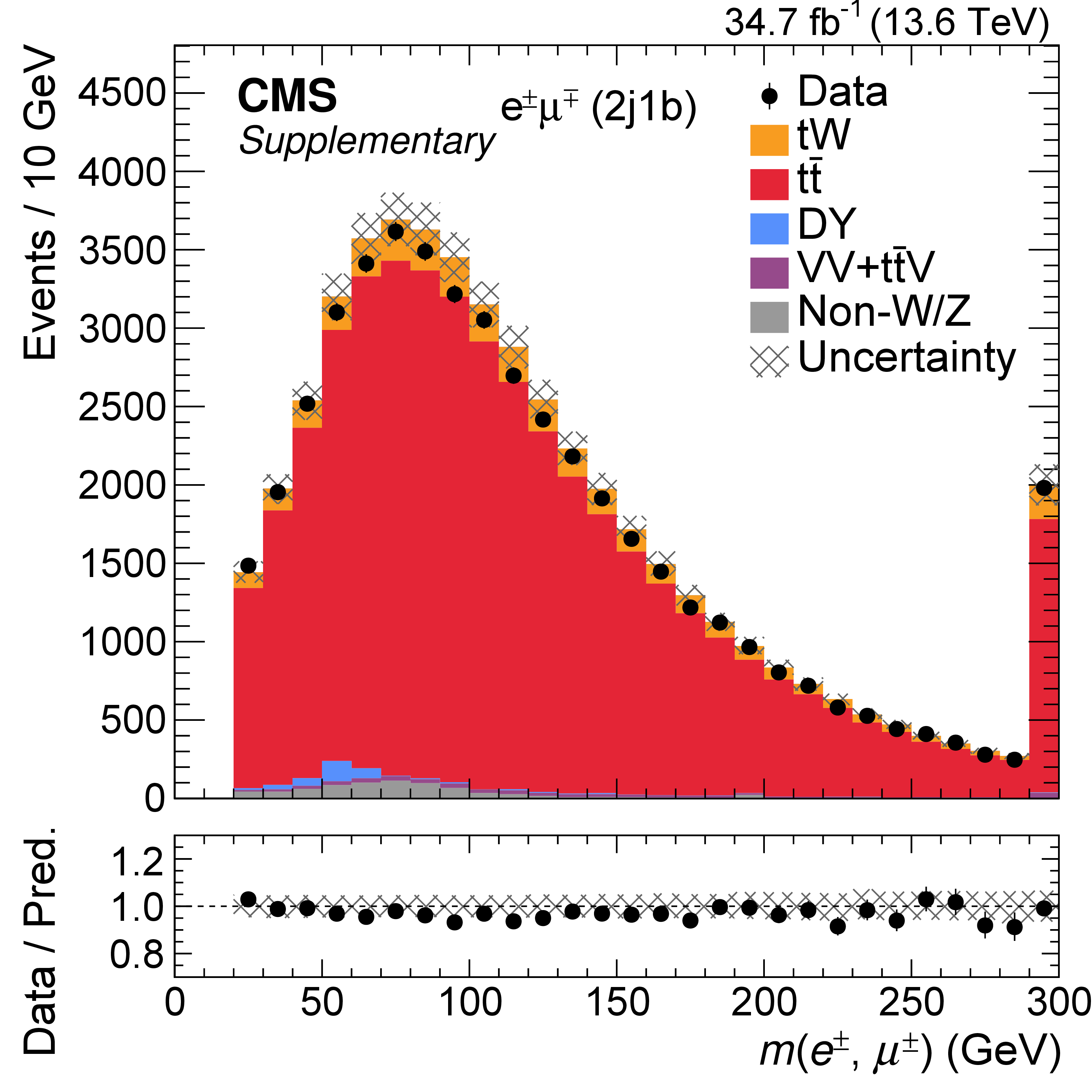 The twenty largest impacts $ \Delta\hat{\mu} $ (right column) and fit constraints $ (\hat{\theta}-\theta_0)/\Delta\theta $ (middle column) of the nuisance parameters listed in the left column from the maximum likelihood fit used to determine the inclusive $ \mathrm{t}\mathrm{W} $ cross section. The horizontal bars on the fit constraints show the ratio of the uncertainties of the fit result to the previous ones, effectively giving the constraint on the nuisance parameter. If the period is specified alongside the uncertainty name, it indicates that this is the component of the uncertainty uncorrelated by periods. There are two possible periods, before (2022PreEE) and after (2022PostEE) ECAL water leak. The JES uncertainties are divided into several sources, where ``JES - absolute'' groups contributions from scale corrections in the barrel, pileup corrections, and initial- and final-state radiation corrections; ``JES - relative sample'' encodes the uncertainty in the $ \eta $-dependent calibration of the jets; ``JES - relativeBal'' accounts for the full difference between log-linear fits of MPF (Missing transverse energy Projection Fraction) and $ p_{\mathrm{T}} $ balance methods [114]; and ``JES - quark/gluon'' comes from the corrections applied to correct the different detector response to gluon and quark jets. This last uncertainty is split in three components. These components are: light for the gluon and up, down, and strange quark jets, charm for the c jets, and bottom for the b jets. |