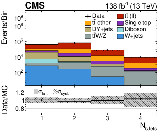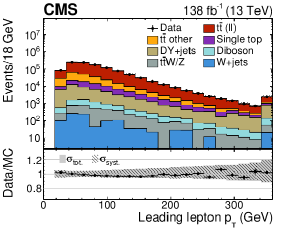 Observed (black markers) and expected (filled histograms) distributions of leading lepton $ p_{\mathrm{T}} $ (upper left), leading jet $ p_{\mathrm{T}} $ (upper right), the number of jets (lower left), and the number of b tagged jets (lower right), after event selection. The hatched (grey) areas denote the systematic (total) uncertainties on the expected yields. Vertical and horizontal error bars on the data points represent the statistical uncertainty and the bin width, respectively. Events from all data-taking periods and all channels are combined. The lower panel of each plot shows the ratio between observed and expected distributions. The last bin includes all events above the plotted range. |