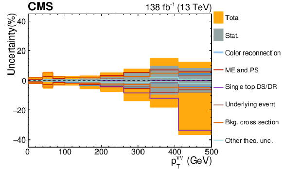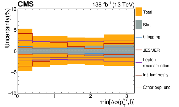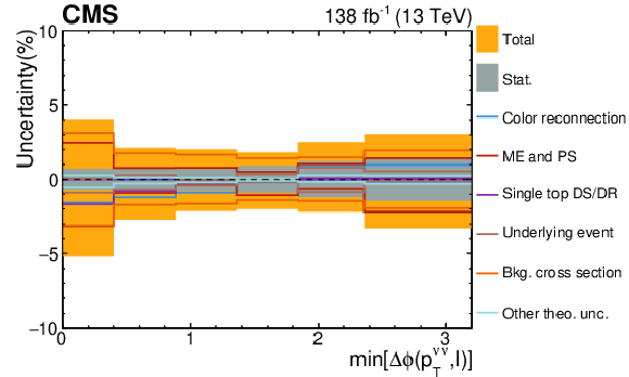 Breakdown of the relative uncertainties from experimental (left) and theoretical (right) uncertainties on the differential cross section measurement as a function of $ p_{\mathrm{T}}^{\nu\nu} $ (upper), $ \min[\Delta\phi({\vec p}_{\mathrm{T}}^{\,\nu\nu},{\vec p}_{\mathrm{T}}^{\,\ell})] $ (middle), and both variables (lower). In the last case, each group of four bins corresponds to $ p_{\mathrm{T}}^{\nu\nu} $ bins, and $ \min[\Delta\phi({\vec p}_{\mathrm{T}}^{\,\nu\nu},{\vec p}_{\mathrm{T}}^{\,\ell})] $ bin edges are indicated by vertical solid lines. The statistical uncertainty (dark grey) takes the size of available event counts in both the simulated samples and the recorded data into account. The last bin includes all events above the plotted range. |