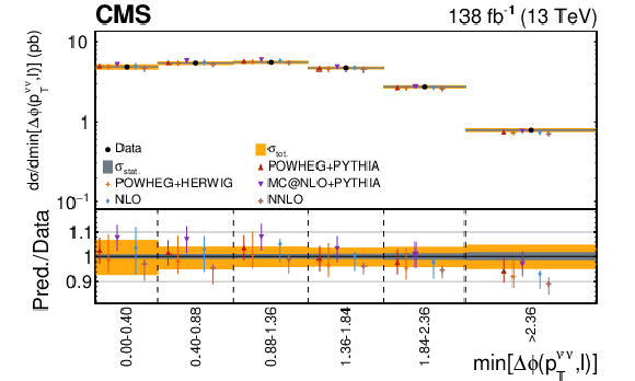 The measured differential signal cross sections (black markers) as functions of $ p_{\mathrm{T}}^{\nu\nu} $ (upper), $ \min[\Delta\phi({\vec p}_{\mathrm{T}}^{\,\nu\nu},{\vec p}_{\mathrm{T}}^{\,\ell})] $ (middle), and double-differential in both observables (lower) are shown. The theoretical predictions from POWHEG +PYTHIA (dark red), POWHEG + HERWIG (orange), MC@NLO+PYTHIA (purple), and the fixed-order NLO (light blue) and NNLO (brown) calculations are compared to the measurement. The cross sections in the last $ p_{\mathrm{T}}^{\nu\nu} $ bin of the upper (lower) plot are determined for $ p_{\mathrm{T}}^{\nu\nu} > $ 410 (200) GeV and normalised to a bin width of 90 (200) GeV for visualisation purposes. The total (statistical) uncertainty on the measurement is shown as an orange (dark grey) band. The lower panel of each plot shows the ratio between theoretical predictions and the measurement. |