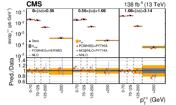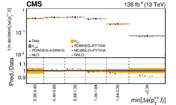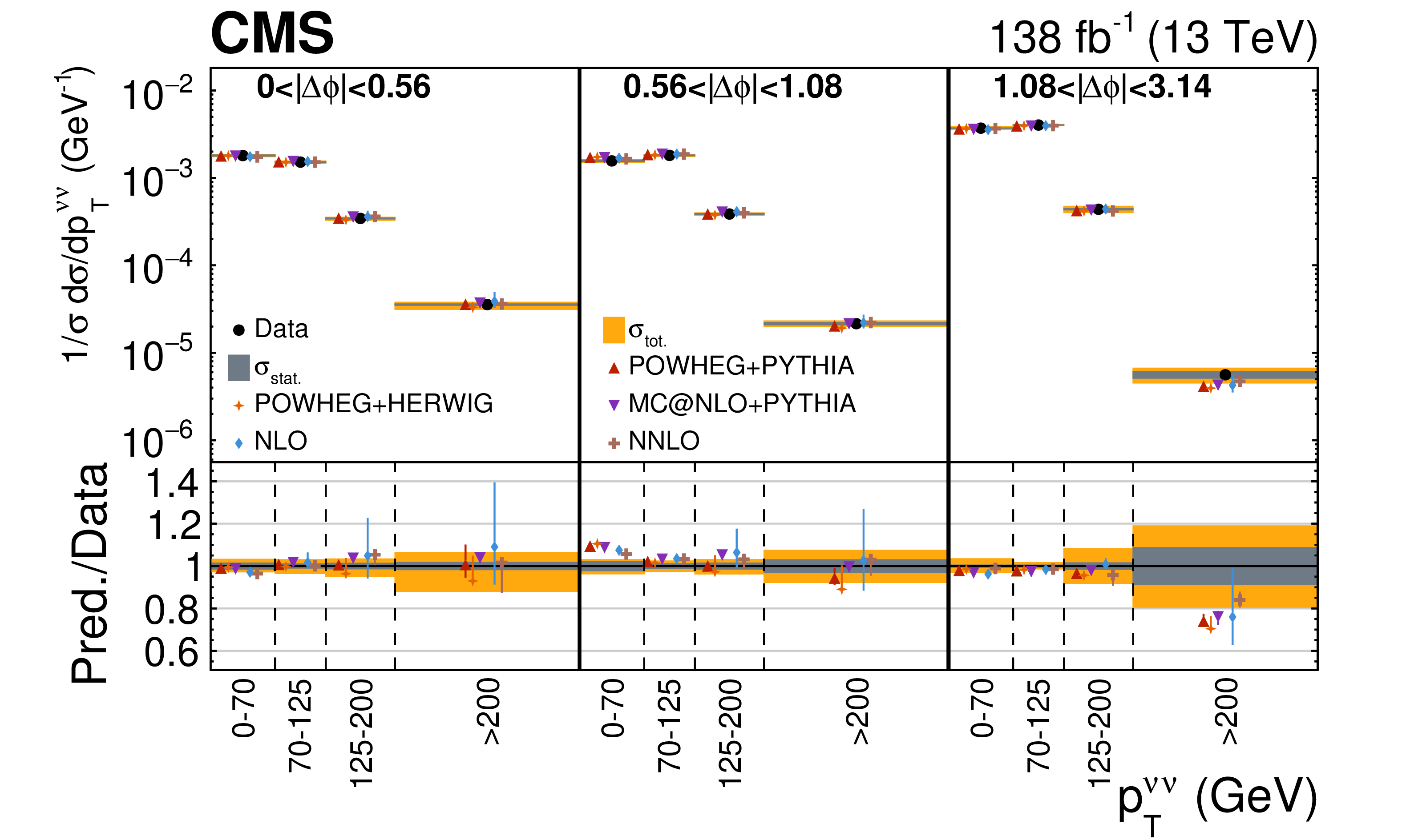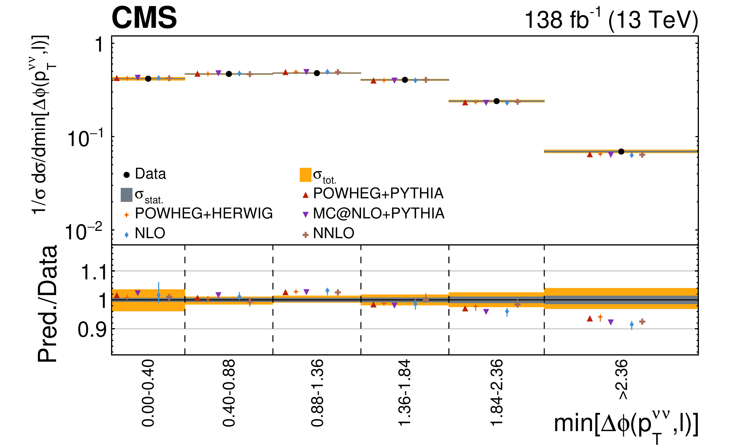The measured normalized differential signal cross sections (black markers) as functions of $ p_{\mathrm{T}}^{\nu\nu} $ (upper), $ \min[\Delta\phi({\vec p}_{\mathrm{T}}^{\,\nu\nu},{\vec p}_{\mathrm{T}}^{\,\ell})] $ (middle), and double-differential in both observables (lower) are shown. The theoretical predictions from POWHEG +PYTHIA (dark red), POWHEG + HERWIG (orange), MC@NLO+PYTHIA (purple), and the fixed-order NLO (light blue) and NNLO (brown) calculations are compared to the measurement. The cross sections in the last $ p_{\mathrm{T}}^{\nu\nu} $ bin of the upper (lower) plot are determined for $ p_{\mathrm{T}}^{\nu\nu} > $ 410 (200) GeV and normalised to a bin width of 90 (200) GeV for visualisation purposes. The total (statistical) uncertainty on the measurement is shown as an orange (dark grey) band. The lower panel of each plot shows the ratio between theoretical predictions and the measurement. |