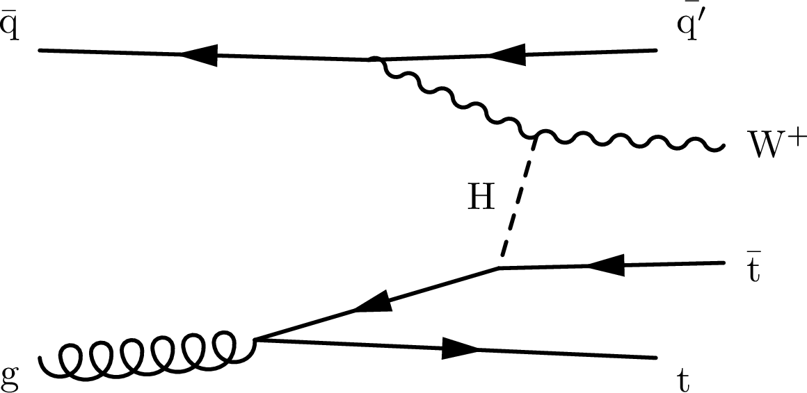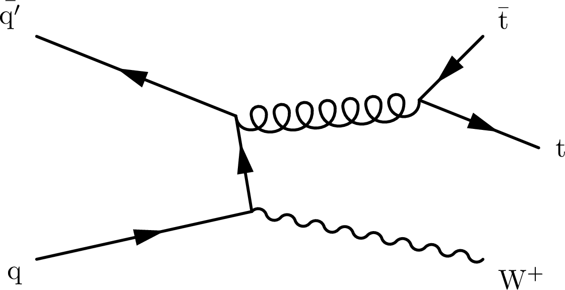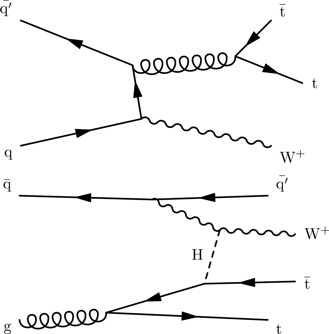 Examples of Feynman diagrams for $ {\mathrm{t}\overline{\mathrm{t}}} \mathrm{W} $ production: at LO (left) and one of the NLO diagrams introducing sizeable electroweak corrections (right). |