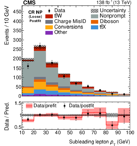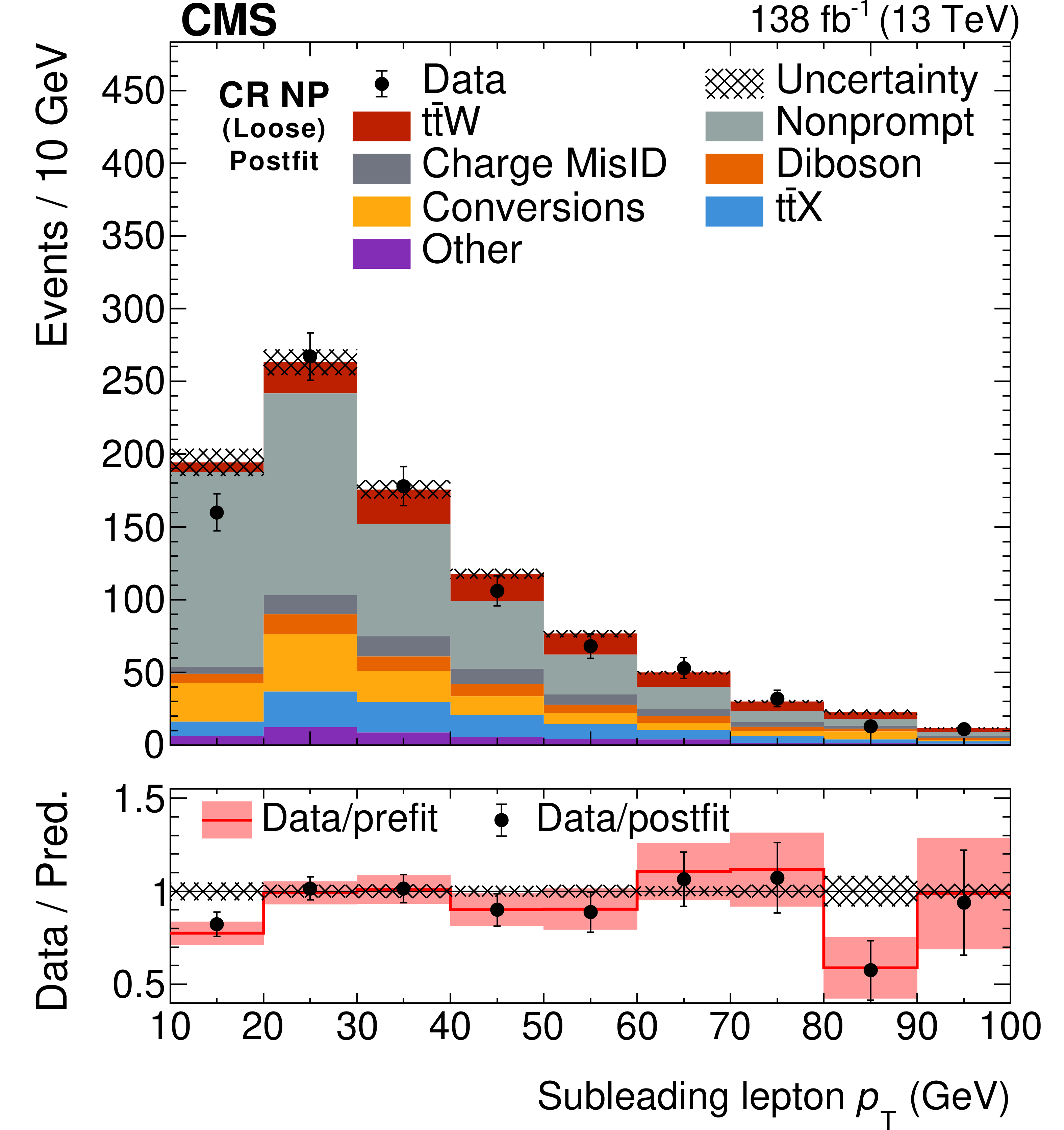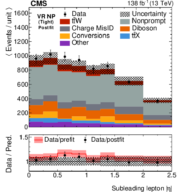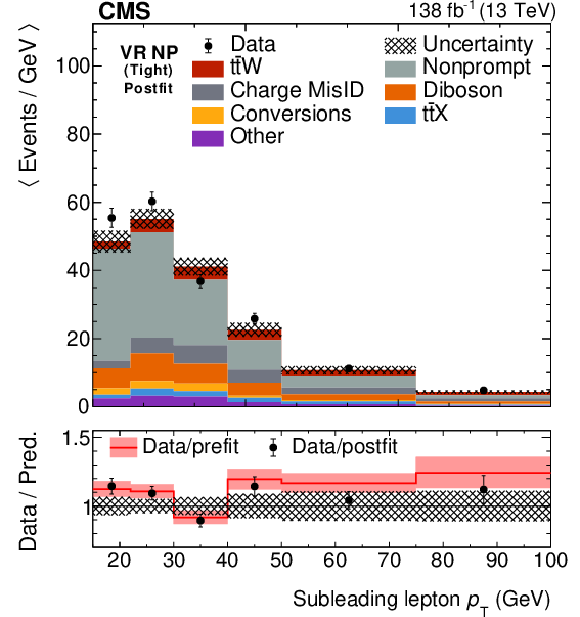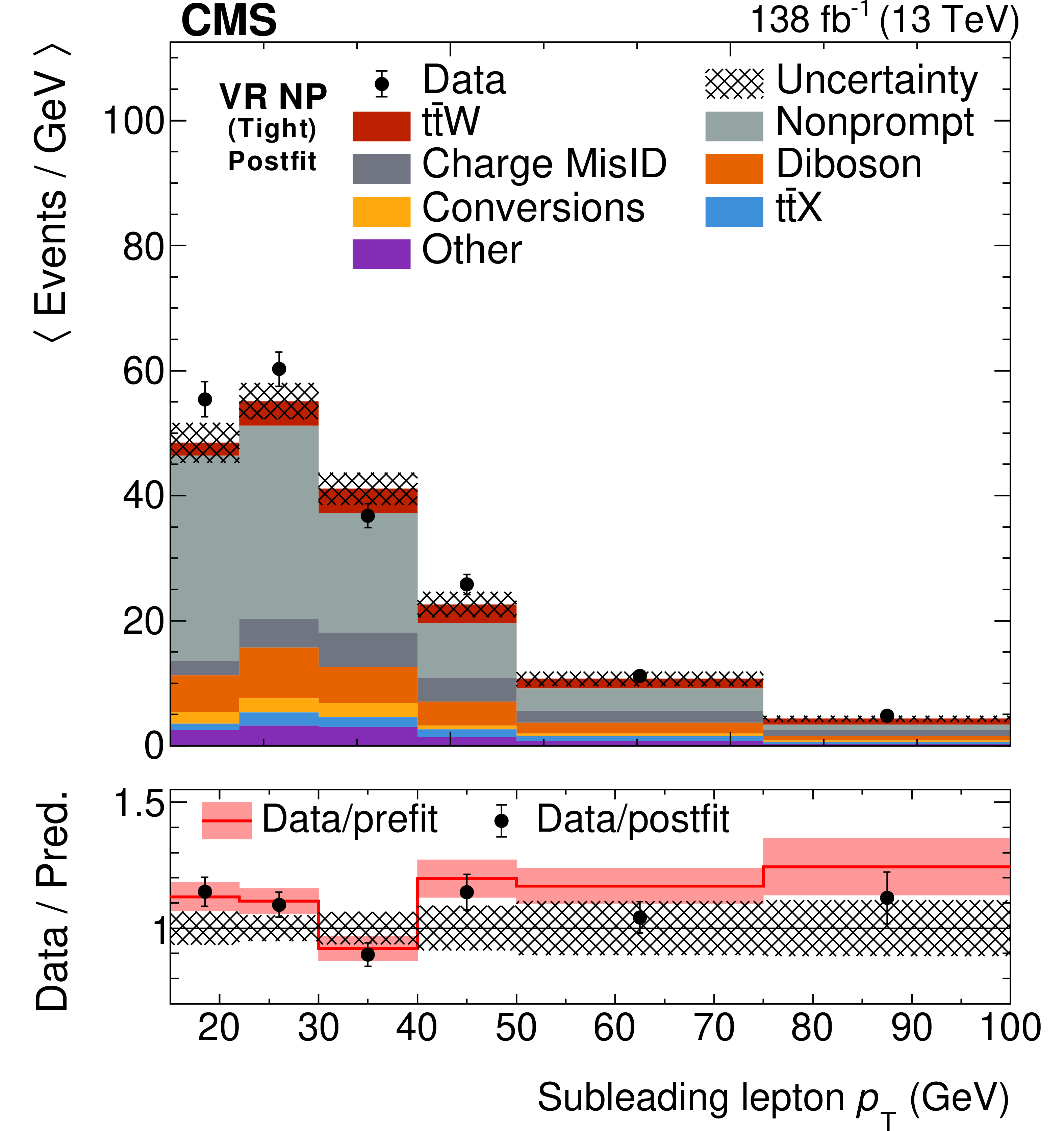 $ p_{\mathrm{T}} $ of the sub-leading lepton (left) and $ |\eta| $ of the subleading lepton (right), in a VR enriched with nonprompt leptons by applying requirements on the number of (b-tagged) jets orthogonal to the SR, for data (points) and predictions (filled histograms) after the fit to the data in the SR and CR as described in Section 7 for the tight lepton selection. The lower panels show the ratio of the data to the sum of the postfit predictions (points) and the ratio of the data to the prefit predictions (red line). The vertical lines on the data points represent the statistical uncertainty in the data and the hatched (filled) band corresponds to the total uncertainty in the postfit (prefit) prediction. Events that exceed the range of the plot are included in the last bin. The bin contents are divided by bin width. |