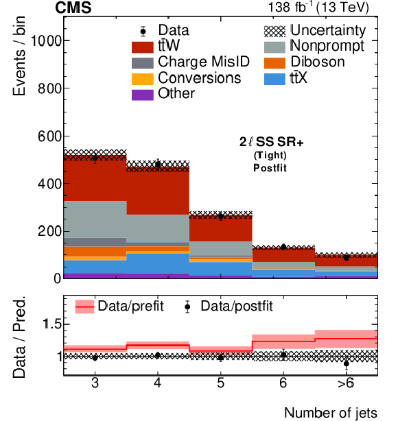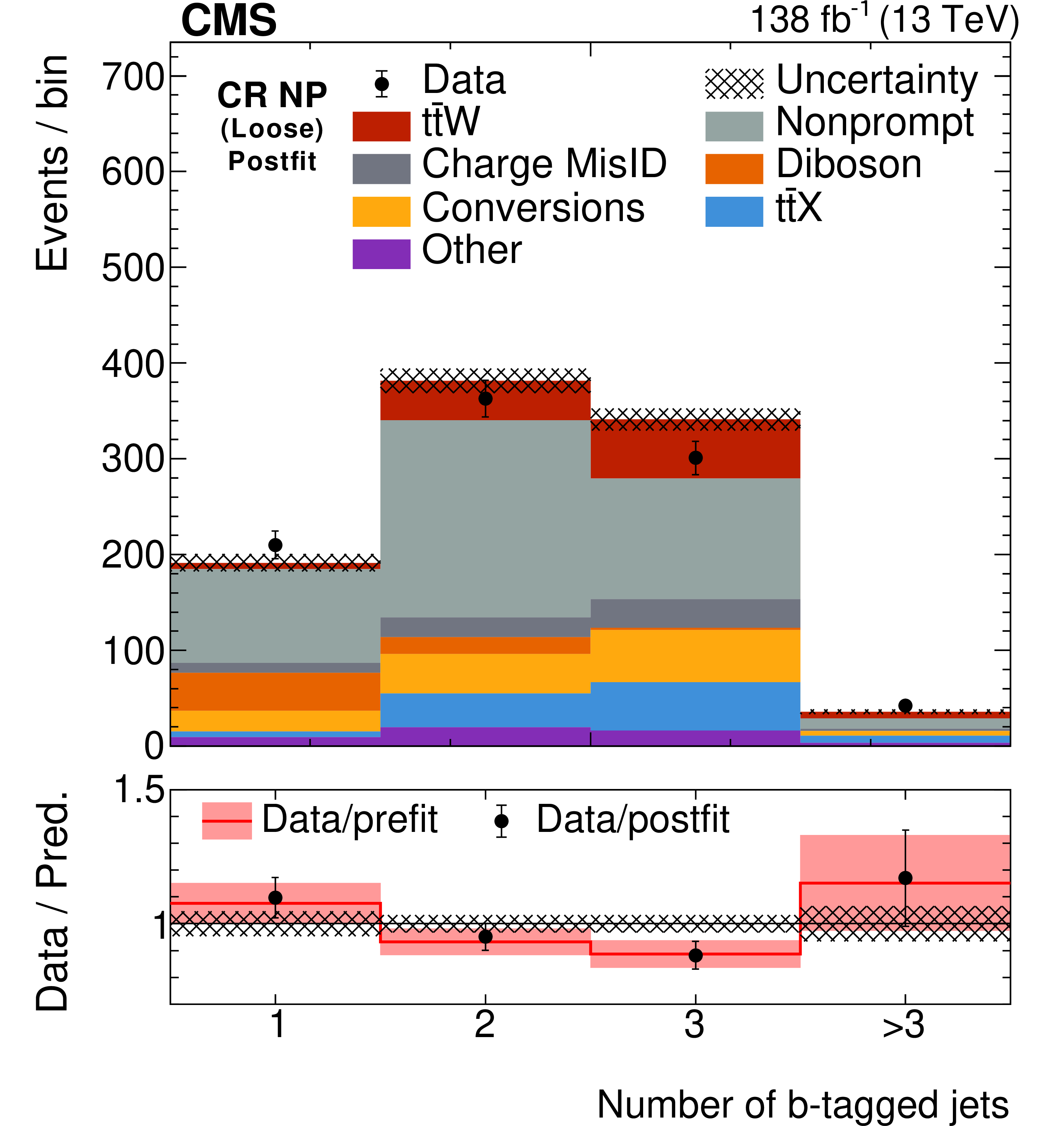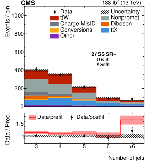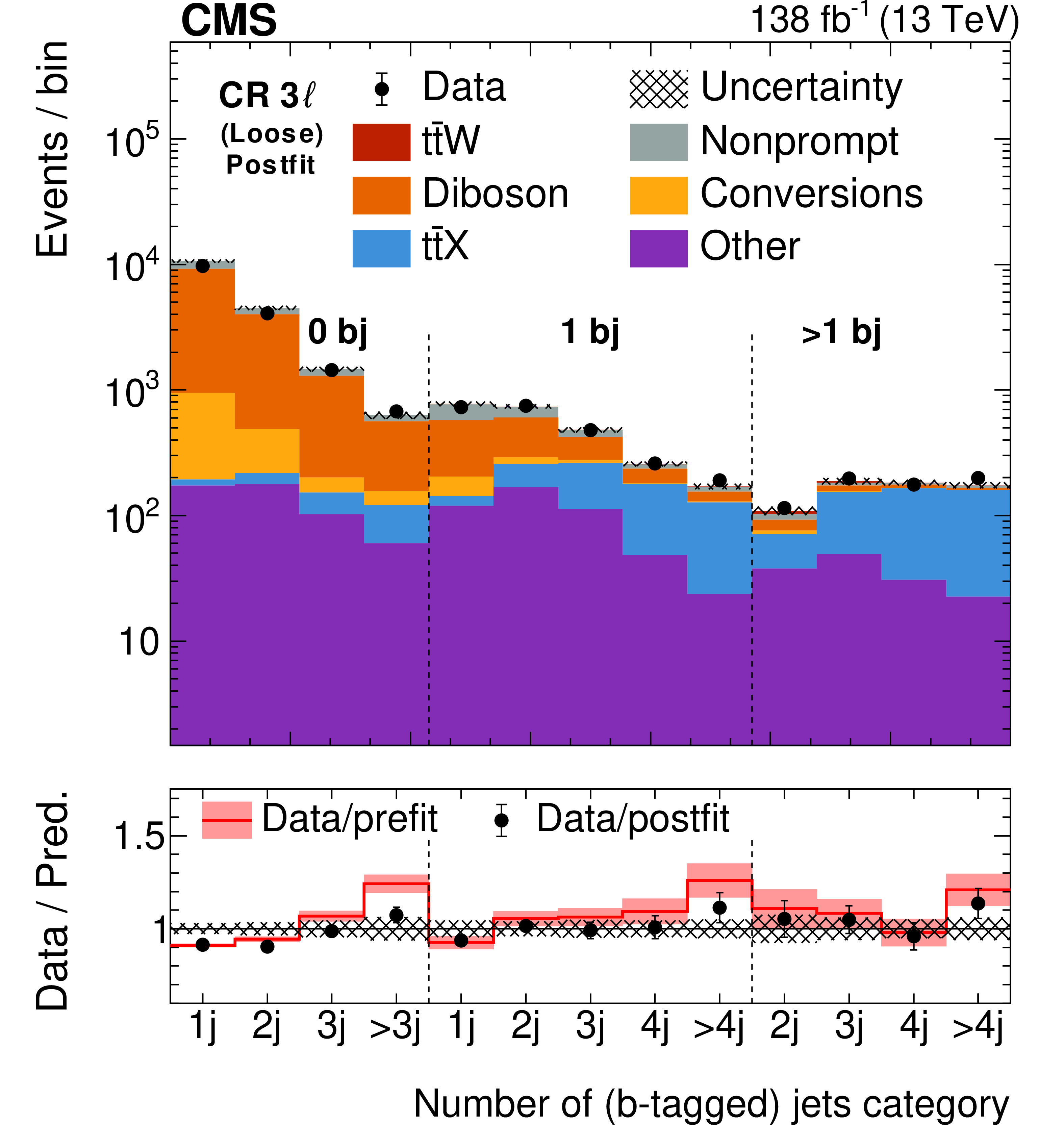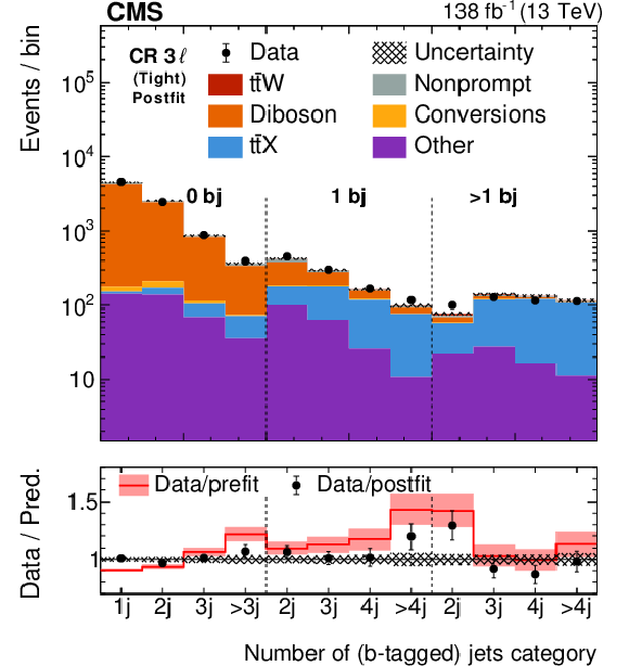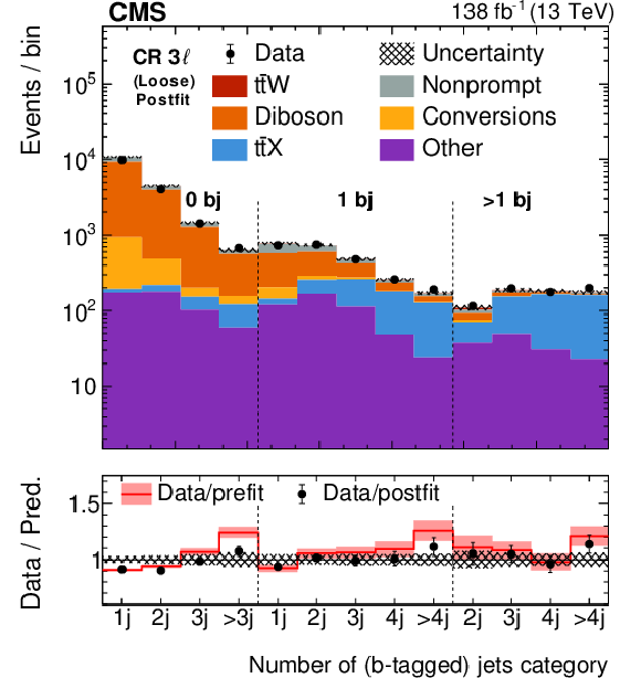 Number of selected (b-tagged) jets in the event for events with three leptons passing the loose (left) and tight (right) selection after the fit to the data in the SR and CR as described in Section 7. Events with no b-tagged jets are classified in bins 1 to 4, events with one b-tagged jet are classified in bins 5 to 9 (8) and events with more than one b tag are classified in bins 10 (9) to 13 (12) for the loose (tight) lepton selection. The lower panels show the ratio of the data to the sum of the postfit predictions (points) and the ratio of the data to the prefit predictions (red line). The vertical lines on the data points represent the statistical uncertainty in the data and the hatched (filled) band corresponds to the total uncertainty in the postfit (prefit) prediction. |