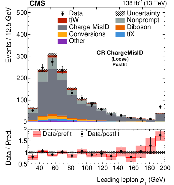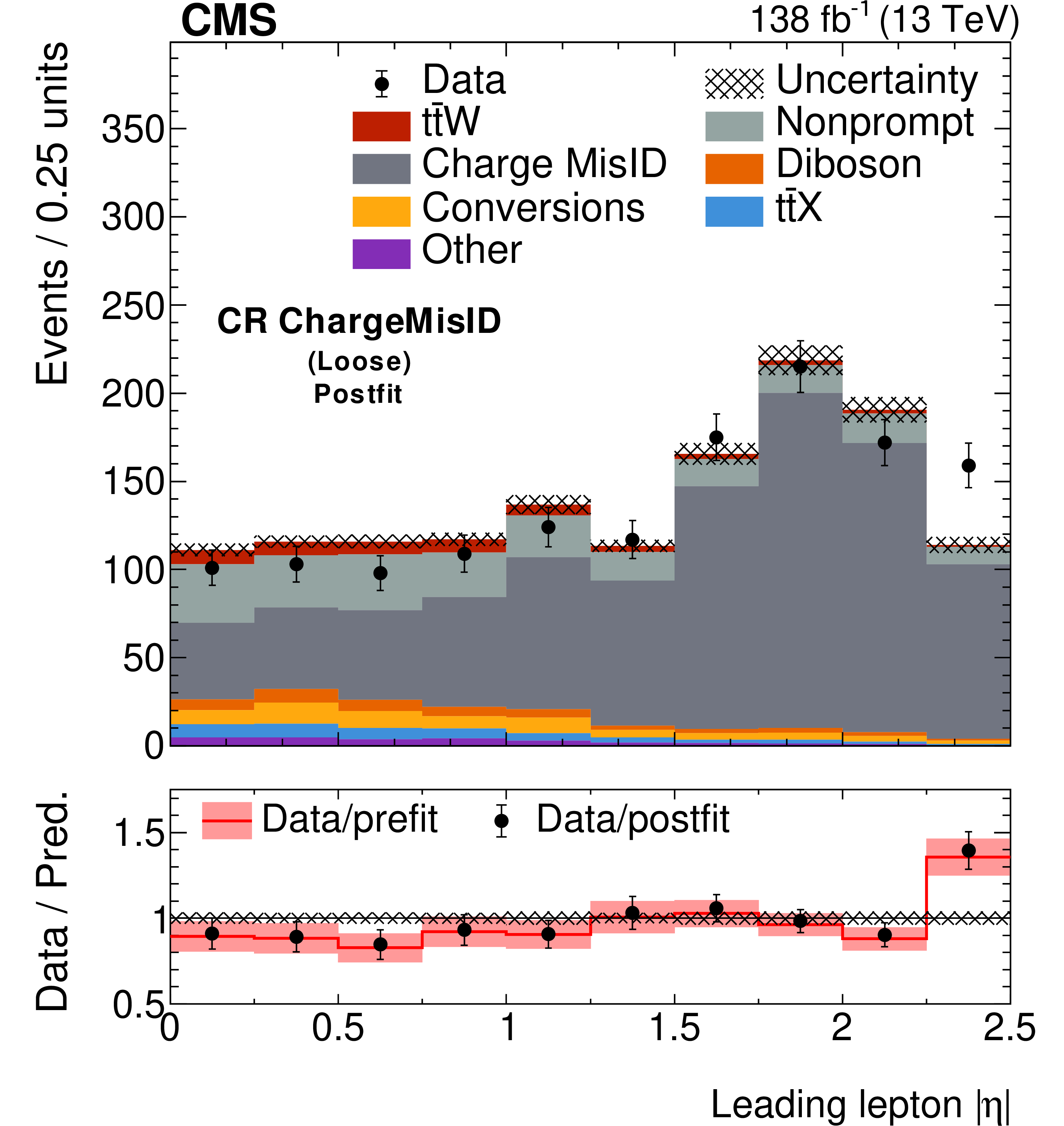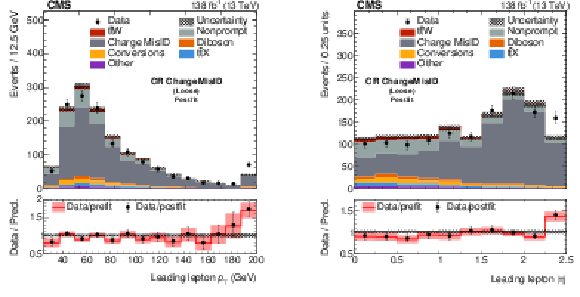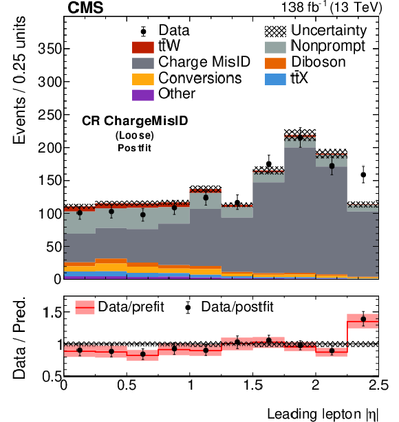 $ p_{\mathrm{T}} $ of the leading lepton (left), $ |\eta| $ of the leading lepton (right), in a CR enriched with charge-misidentified leptons and additional jets for data (points) and predictions (filled histograms) after the fit to the data in the SR and CR as described in Section 7 for the loose lepton selection. The lower panels show the ratio of the data to the sum of the postfit predictions (points) and the ratio of the data to the prefit predictions (red line). The vertical lines on the data points represent the statistical uncertainty in the data and the hatched (filled) band corresponds to the total uncertainty in the postfit (prefit) prediction. Events that exceed the range of the plot are included in the last bin. |