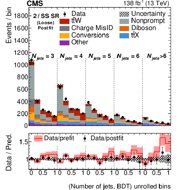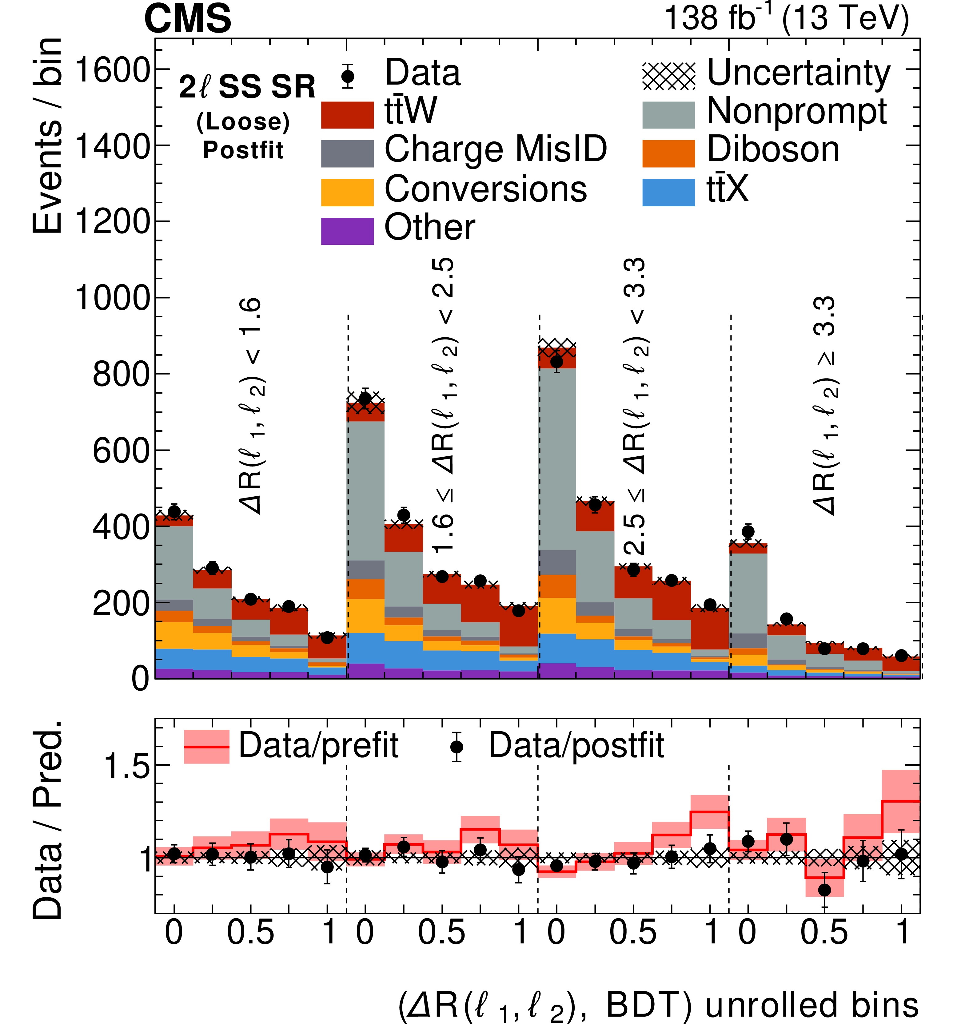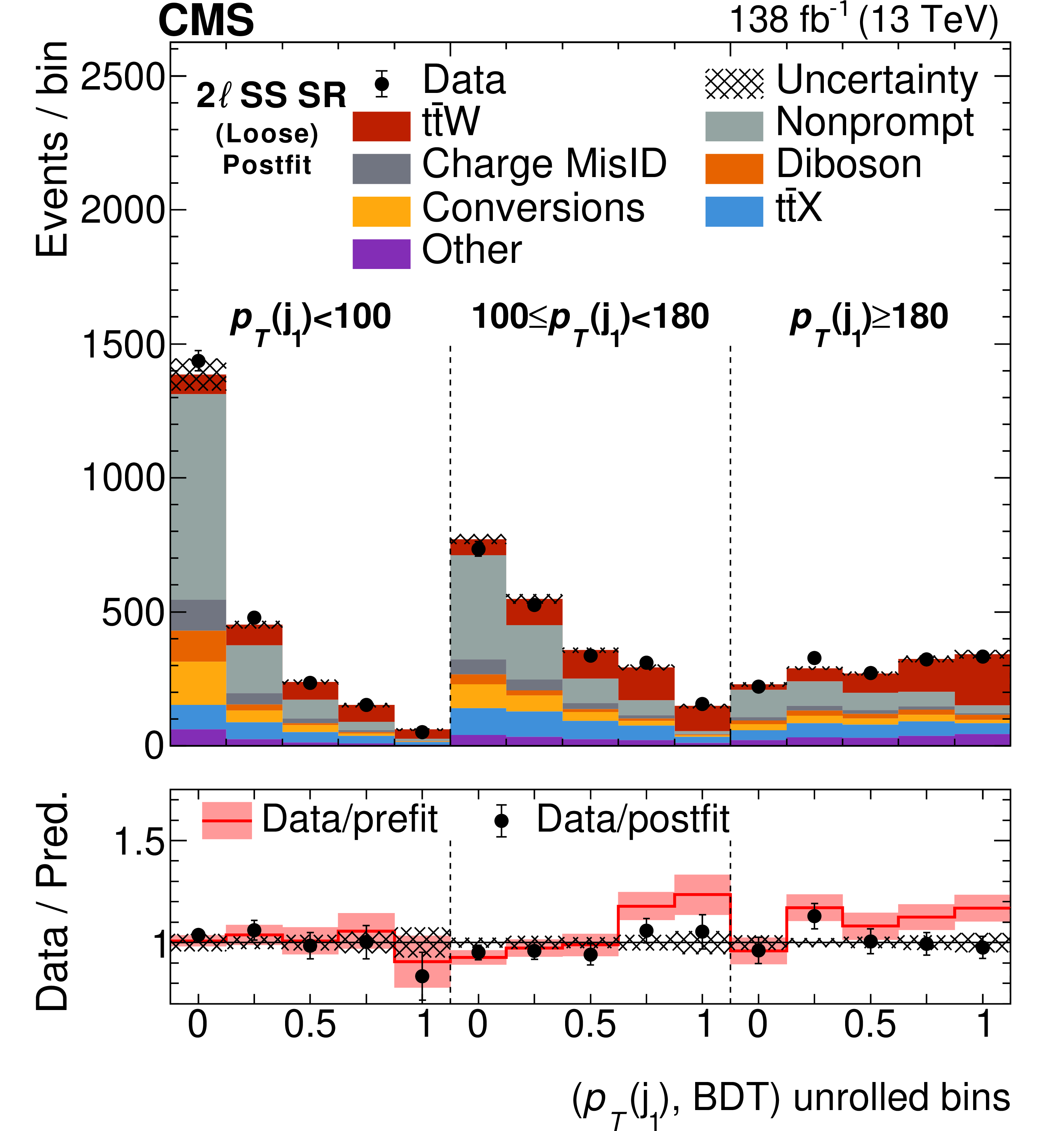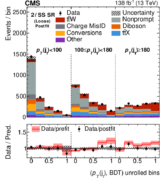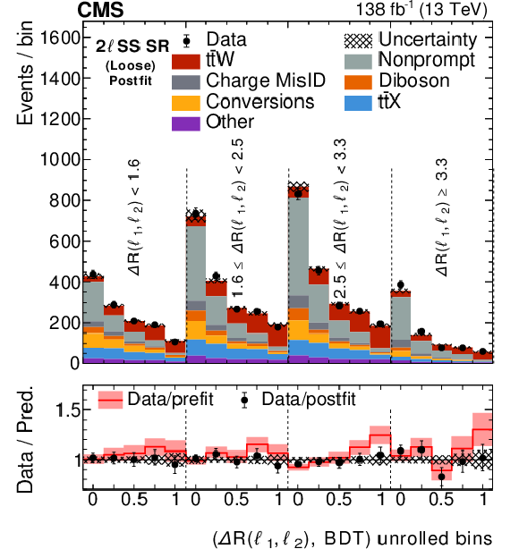 Distributions defined in a two-dimensional grid between the MVA score and the variable of interest in the two-lepton signal selection for data (points) and predictions (filled histograms) after the fit to the data in the SR and CR for the loose lepton selection. The lower panels show the ratio of the data to the sum of the postfit predictions (points) and the ratio of the data to the prefit predictions (red line). The vertical lines on the data points represent the statistical uncertainty in the data and the hatched (filled) band corresponds to the total uncertainty in the postfit (prefit) prediction. |