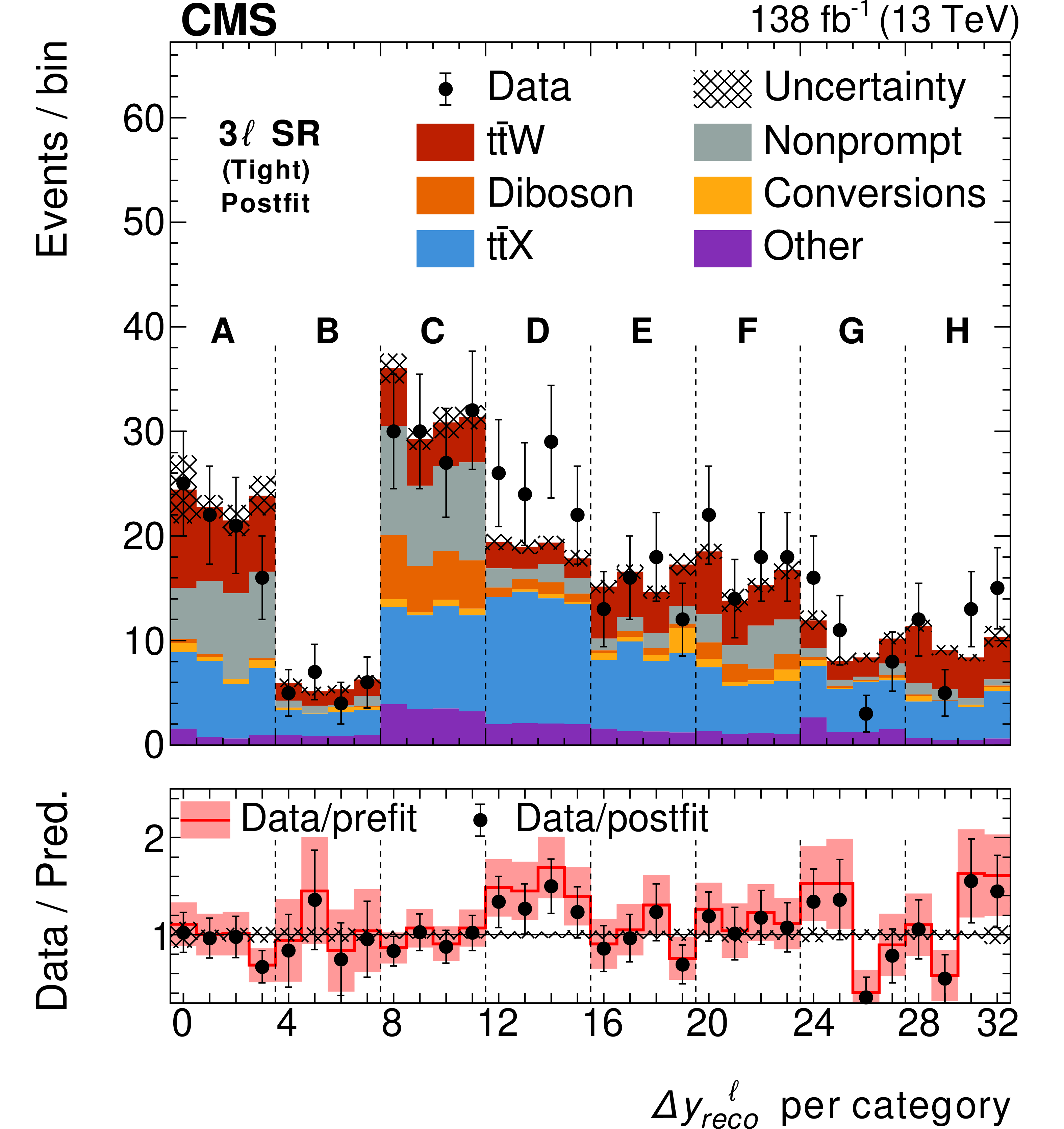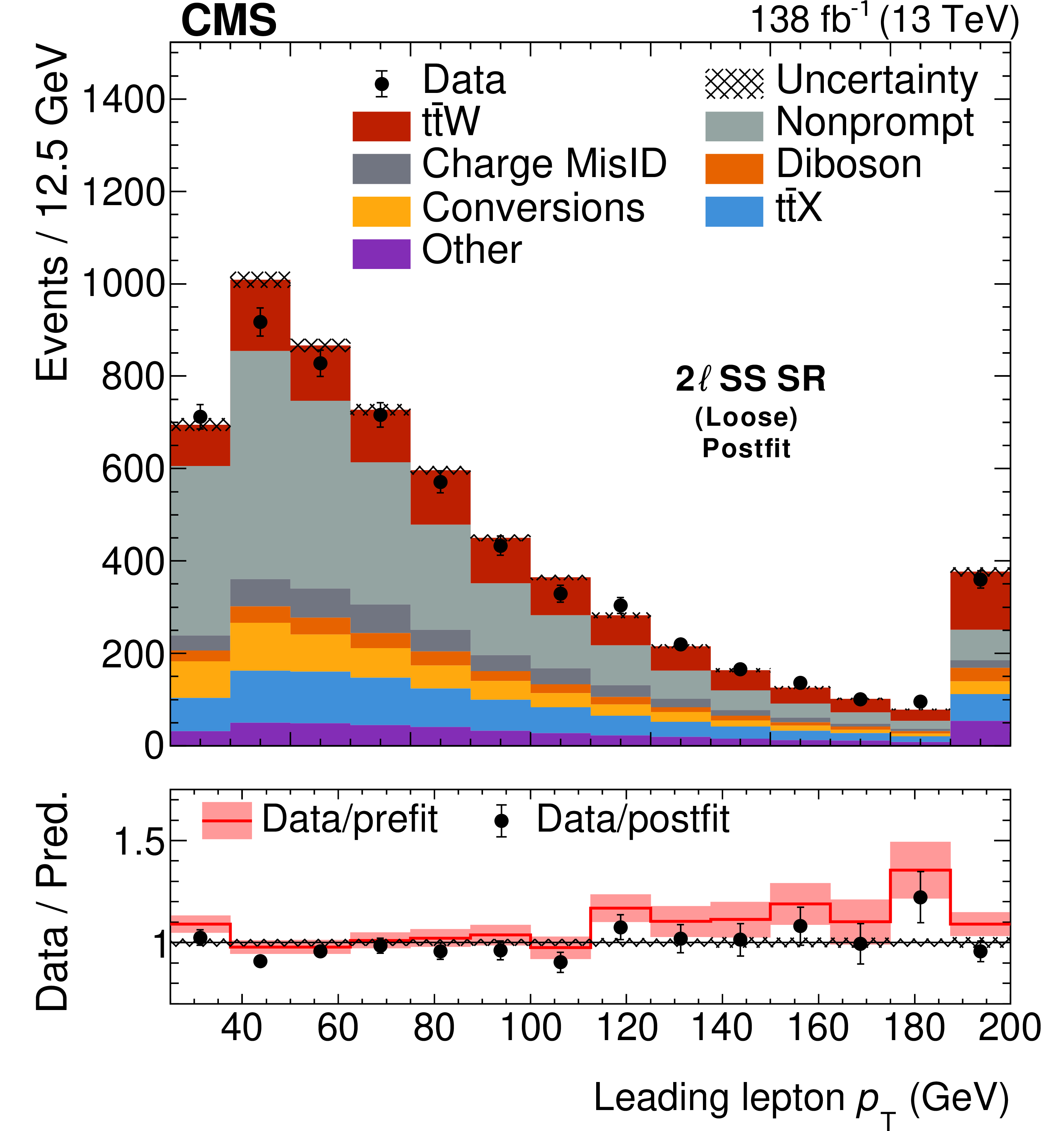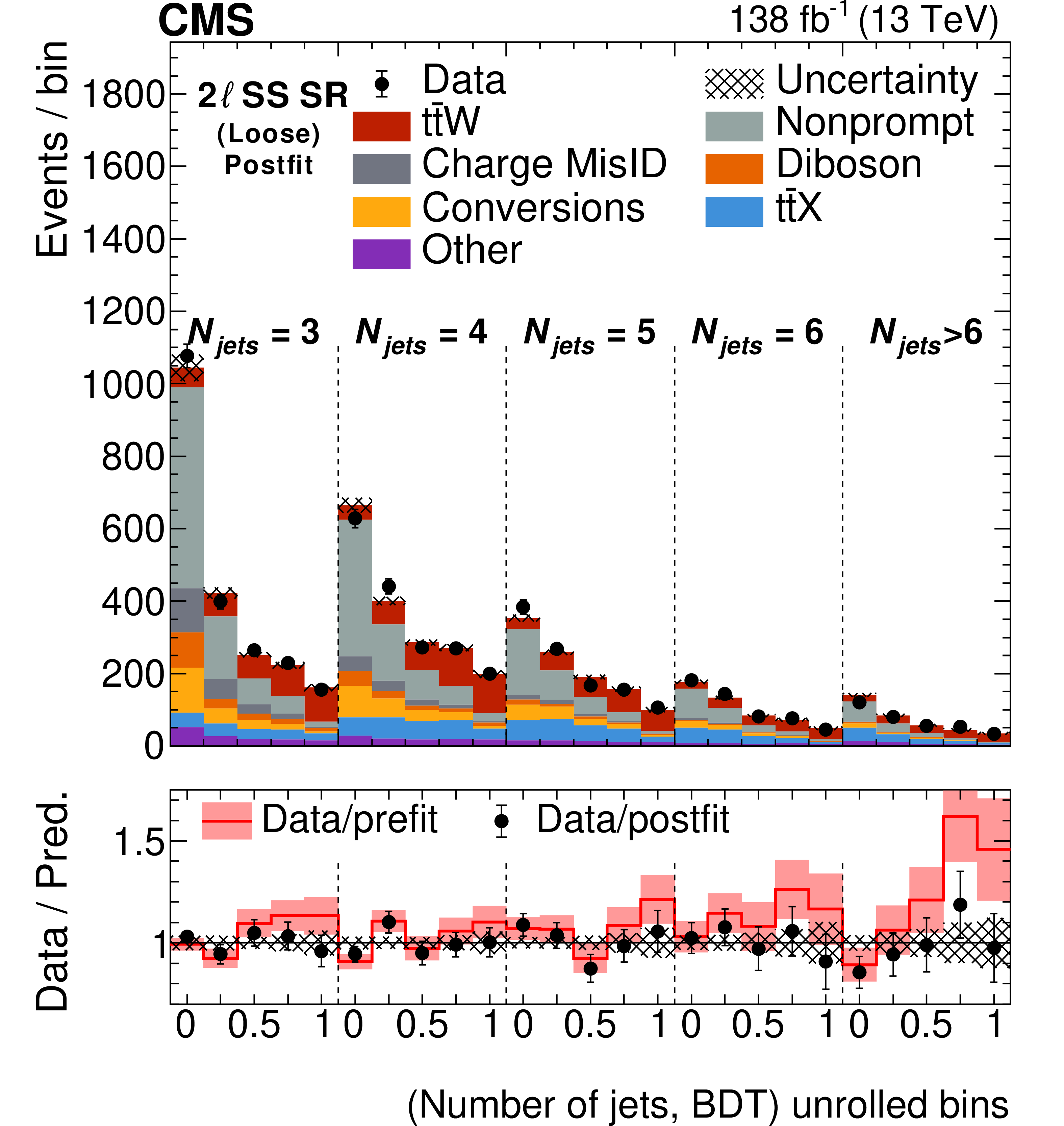 Distributions defined in a two-dimensional grid between the MVA score and the variable of interest in the two-lepton signal selection for data (points) and predictions (filled histograms) after the fit to the data in the SR and CR for the loose lepton selection. The lower panels show the ratio of the data to the sum of the postfit predictions (points) and the ratio of the data to the prefit predictions (red line). The vertical lines on the data points represent the statistical uncertainty in the data and the hatched (filled) band corresponds to the total uncertainty in the postfit (prefit) prediction. |