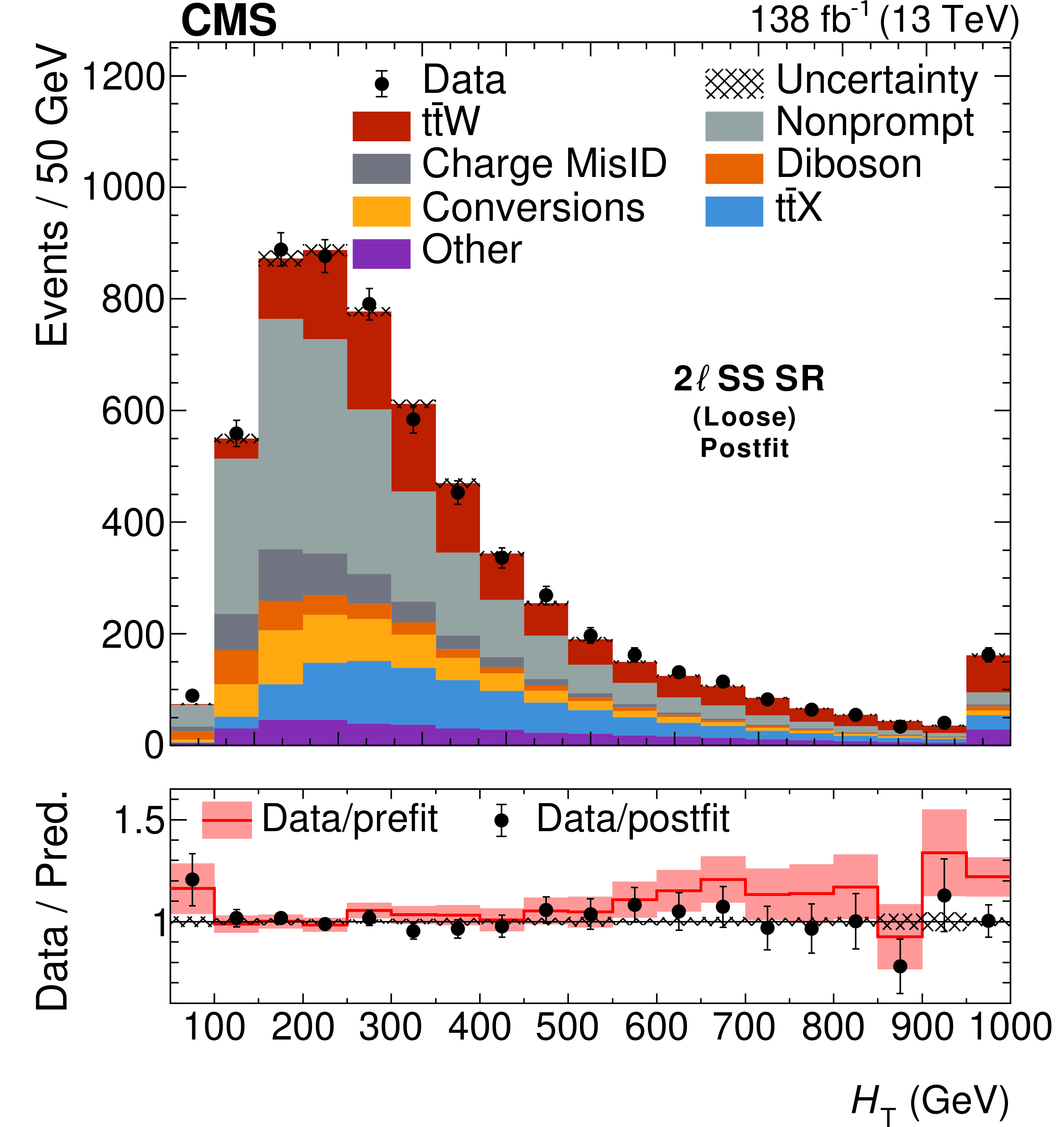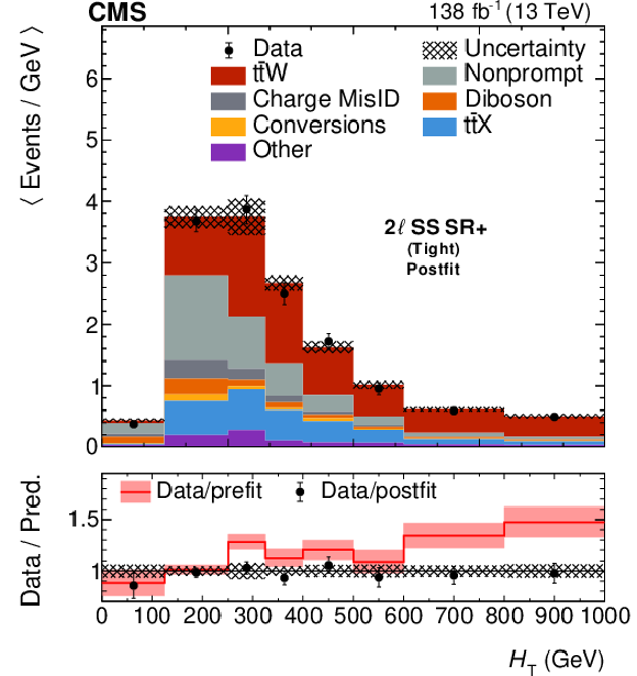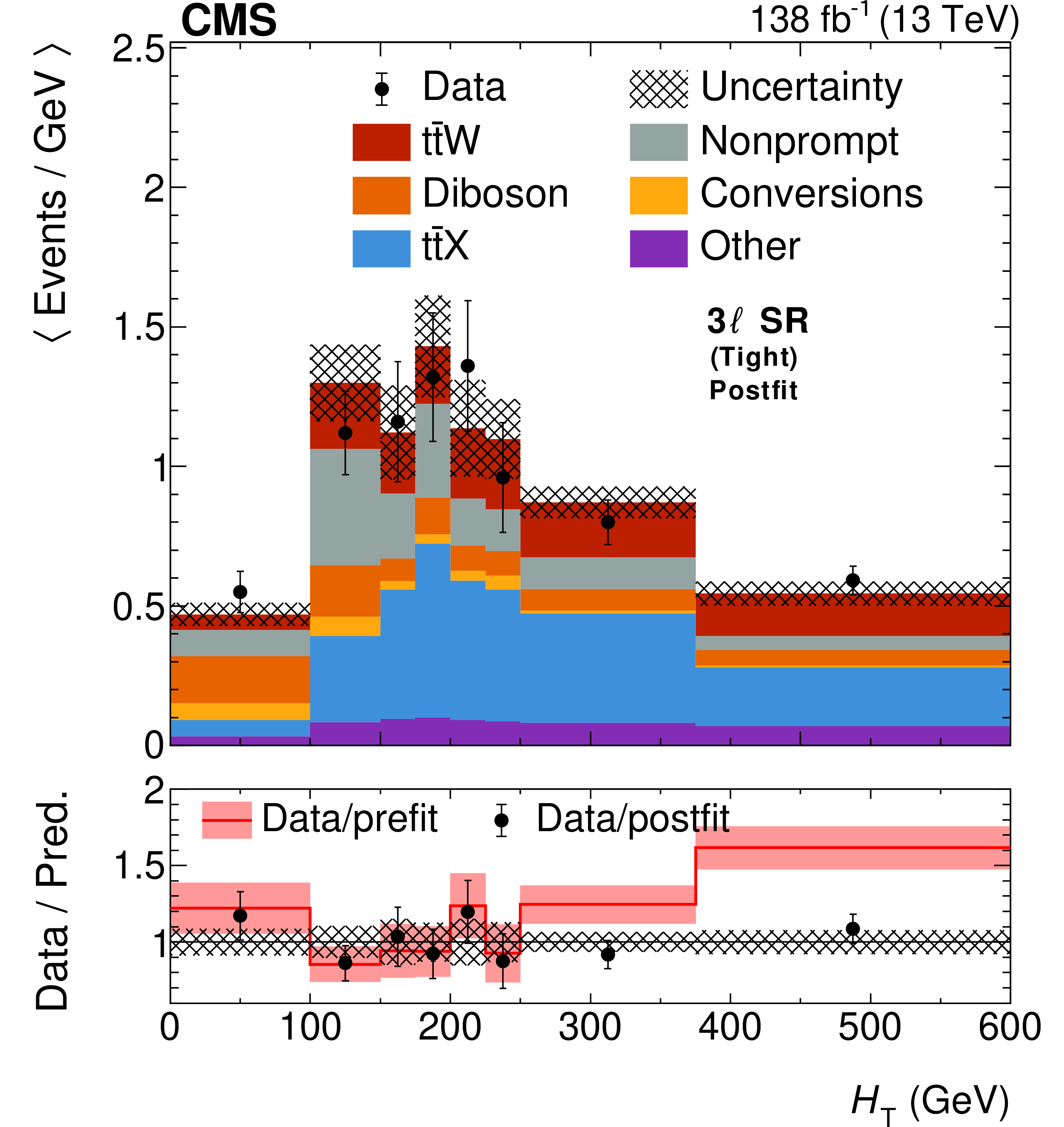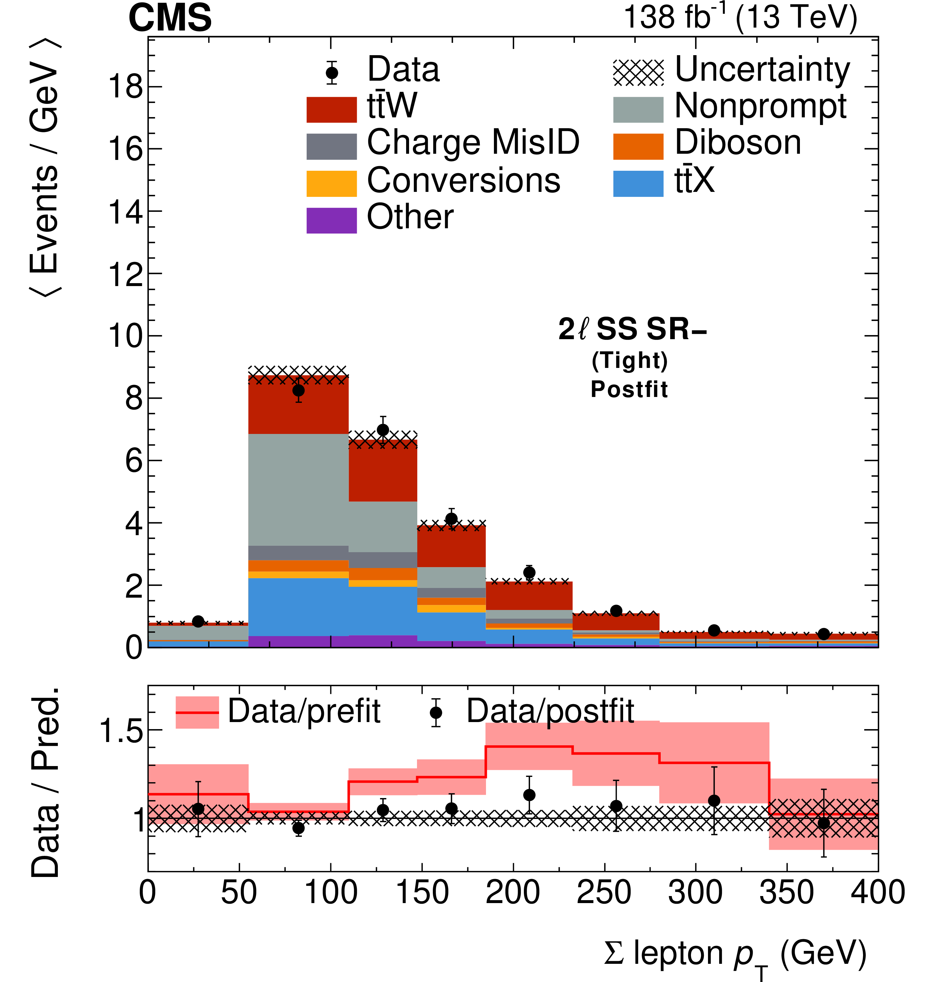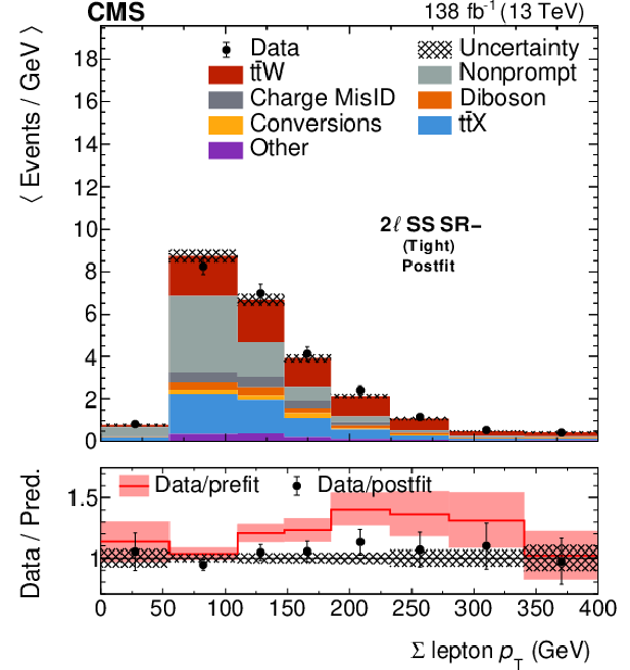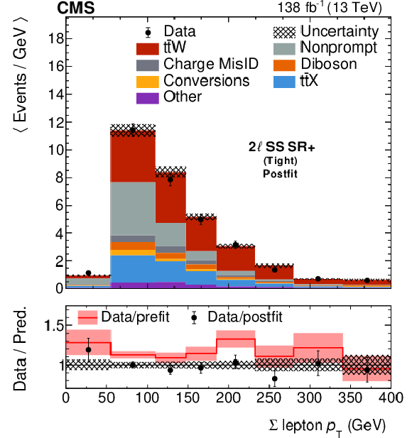 Scalar $ p_{\mathrm{T}} $ sum of the jets in the event (left) and scalar $ p_{\mathrm{T}} $ sum of the leptons in the event (right); in the trilepton signal selection for data (points) and predictions (filled histograms) after the fit to the data for the tight lepton selection. The lower panels show the ratio of the data to the sum of the postfit predictions (points) and the ratio of the data to the prefit predictions (red line). The vertical lines on the data points represent the statistical uncertainty in the data and the hatched (filled) band corresponds to the total uncertainty in the postfit (prefit) prediction. Events that exceed the range of the plot are included in the last bin. The bin contents are divided by bin width. |