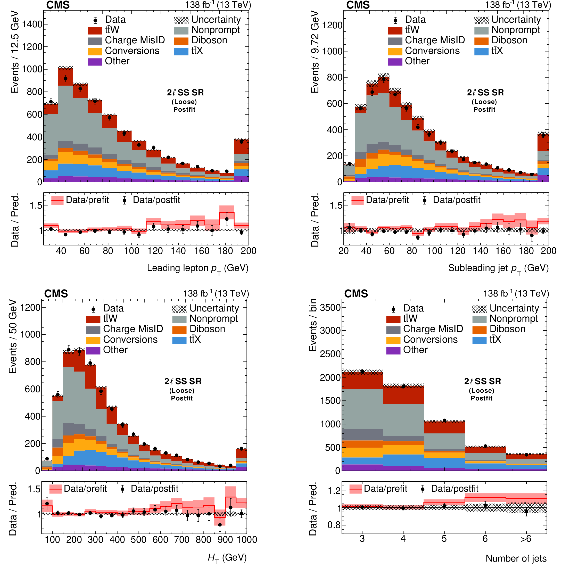 $ p_{\mathrm{T}} $ of the leading lepton (upper left), $ p_{\mathrm{T}} $ of the subleading jet (upper right), scalar $ p_{\mathrm{T}} $ sum of selected jets in the event (lower left), and the number of selected jets in the event (lower right), in the two-lepton signal selection for the loose lepton selection for data (points) and predictions (filled histograms) after the fit to the data in the SR and CR. The lower panels show the ratio of the data to the sum of the postfit predictions (points) and the ratio of the data to the prefit predictions (red line). The vertical lines on the data points represent the statistical uncertainty in the data and the hatched (filled) band corresponds to the total uncertainty in the postfit (prefit) prediction. Events that exceed the range of the plot are included in the last bin. |
