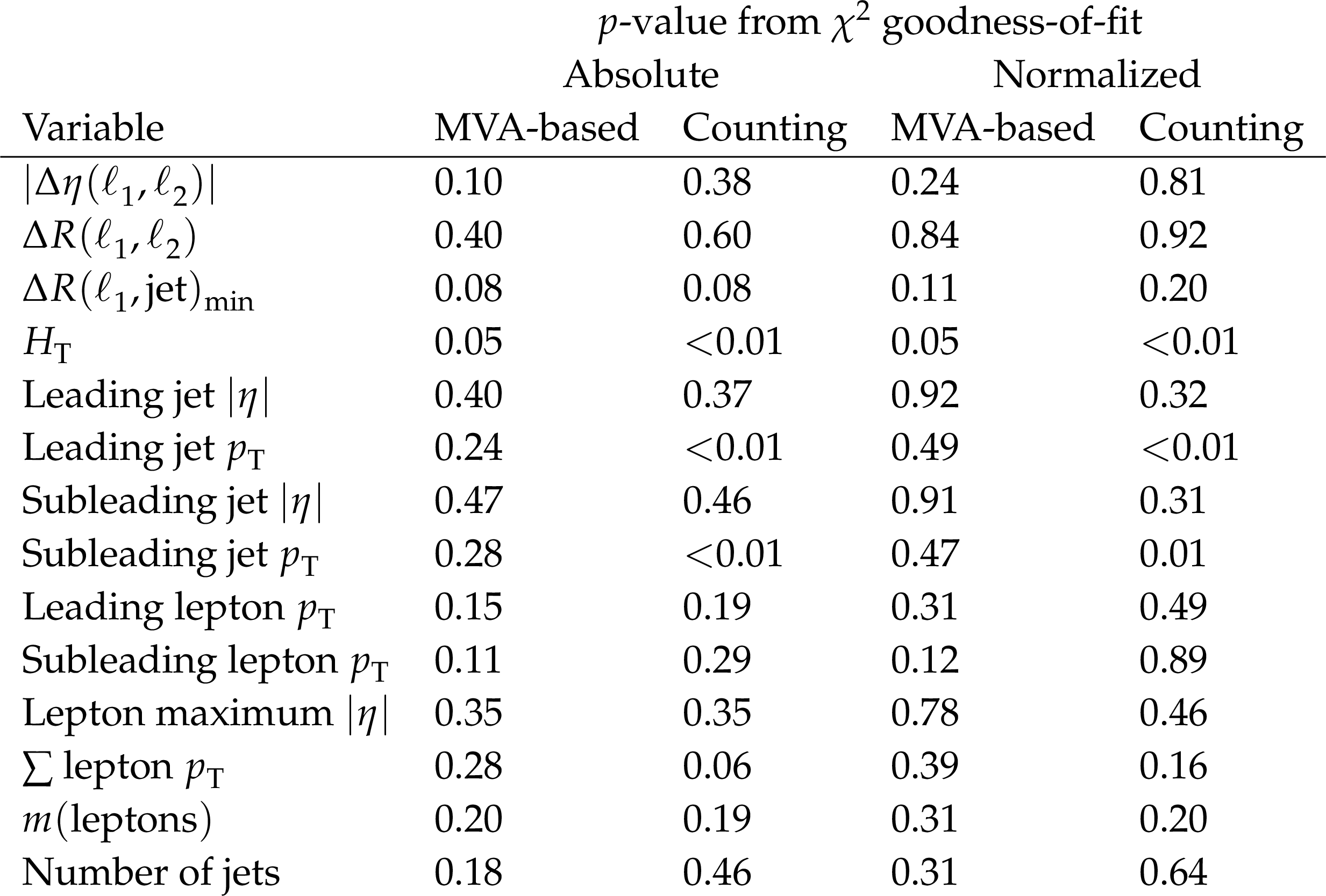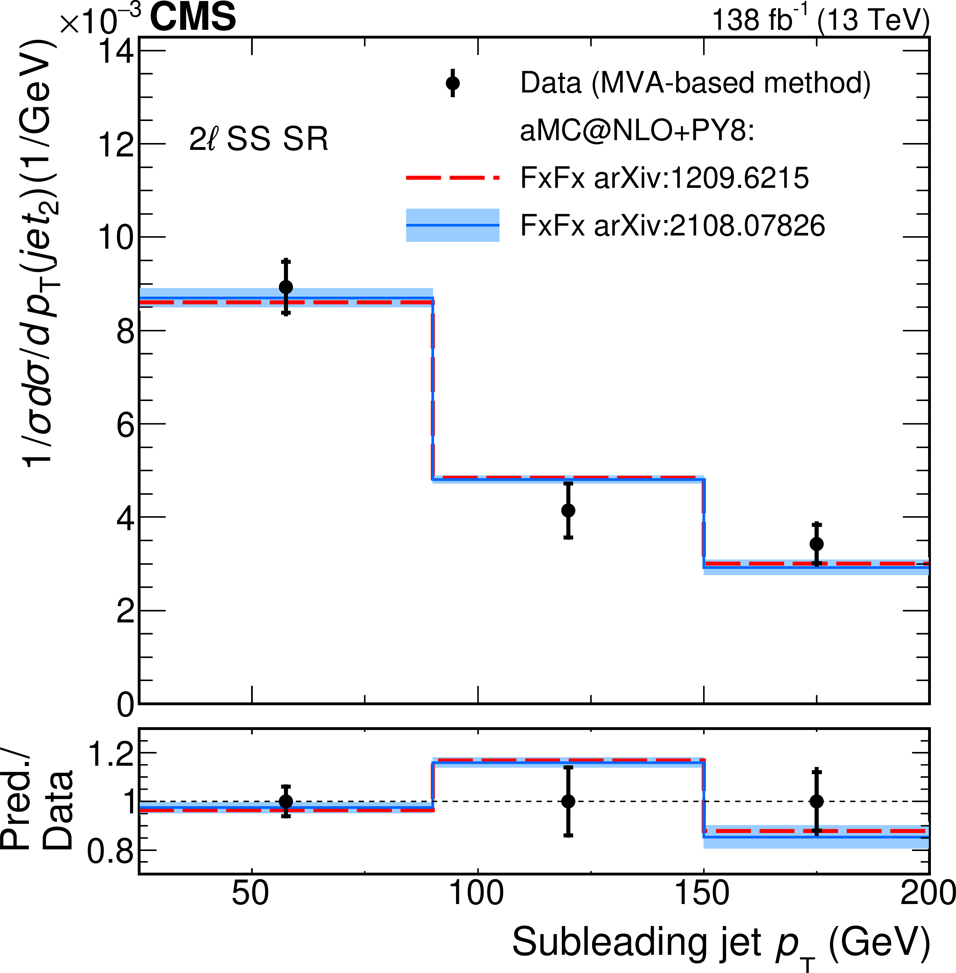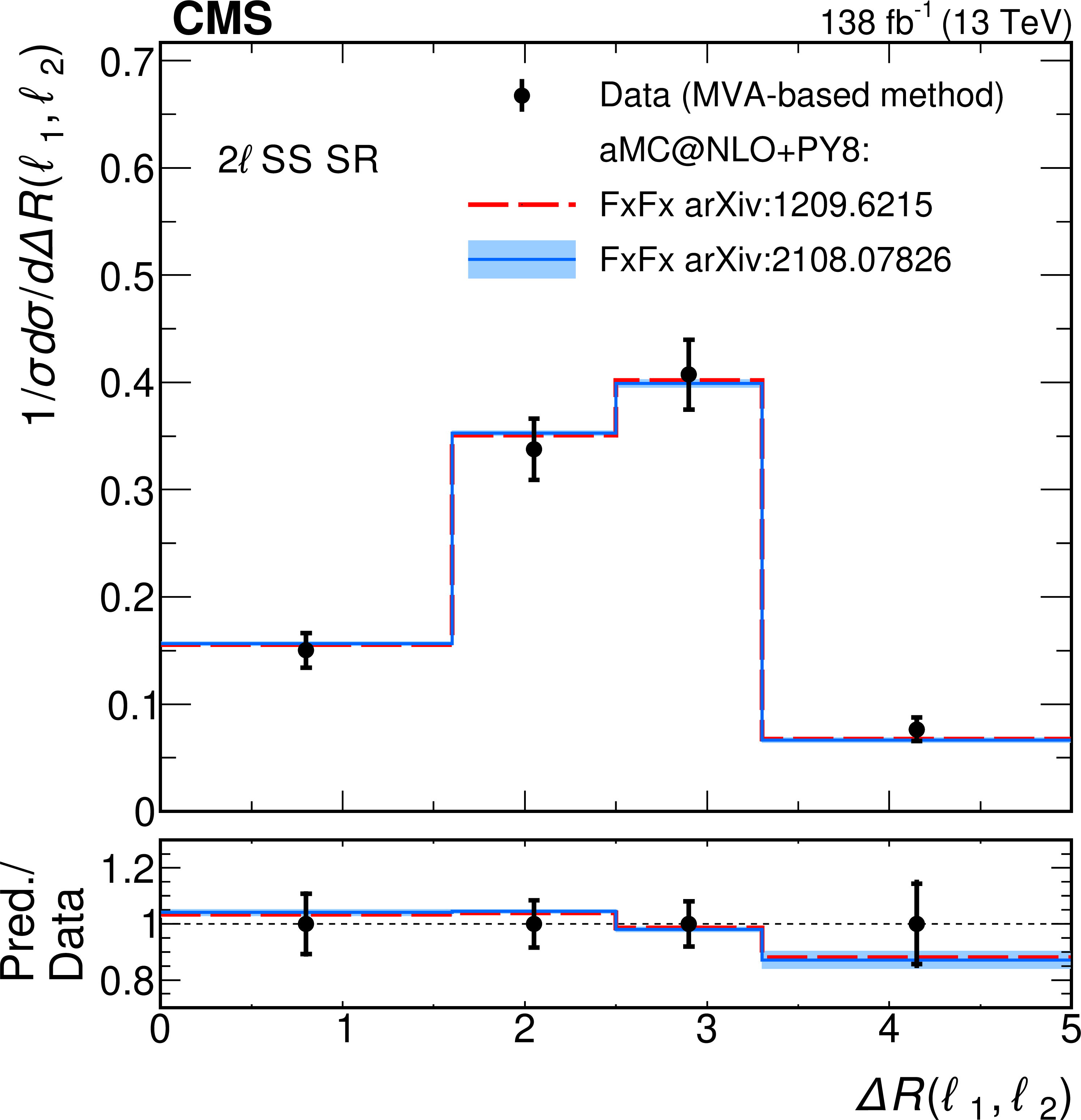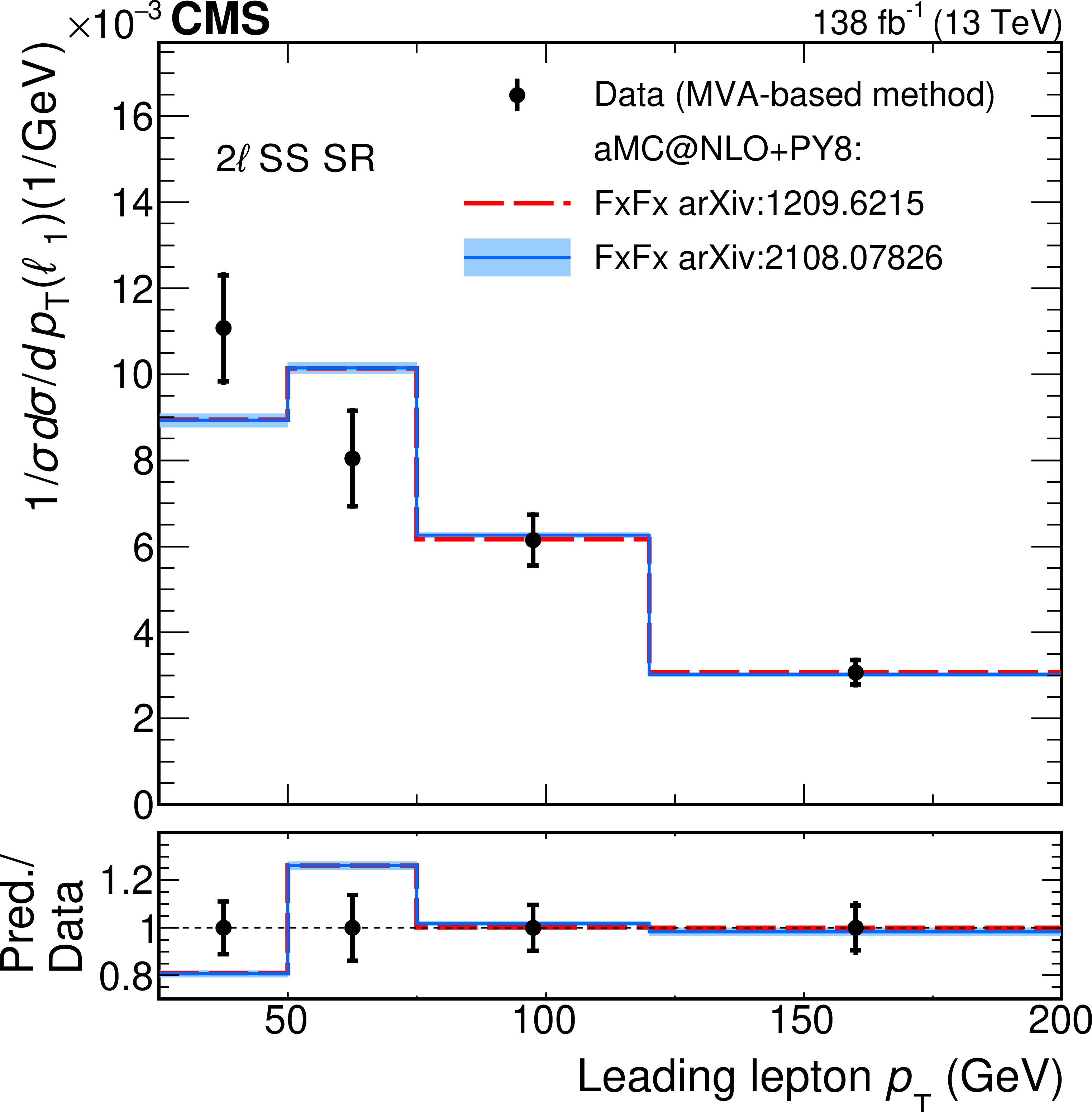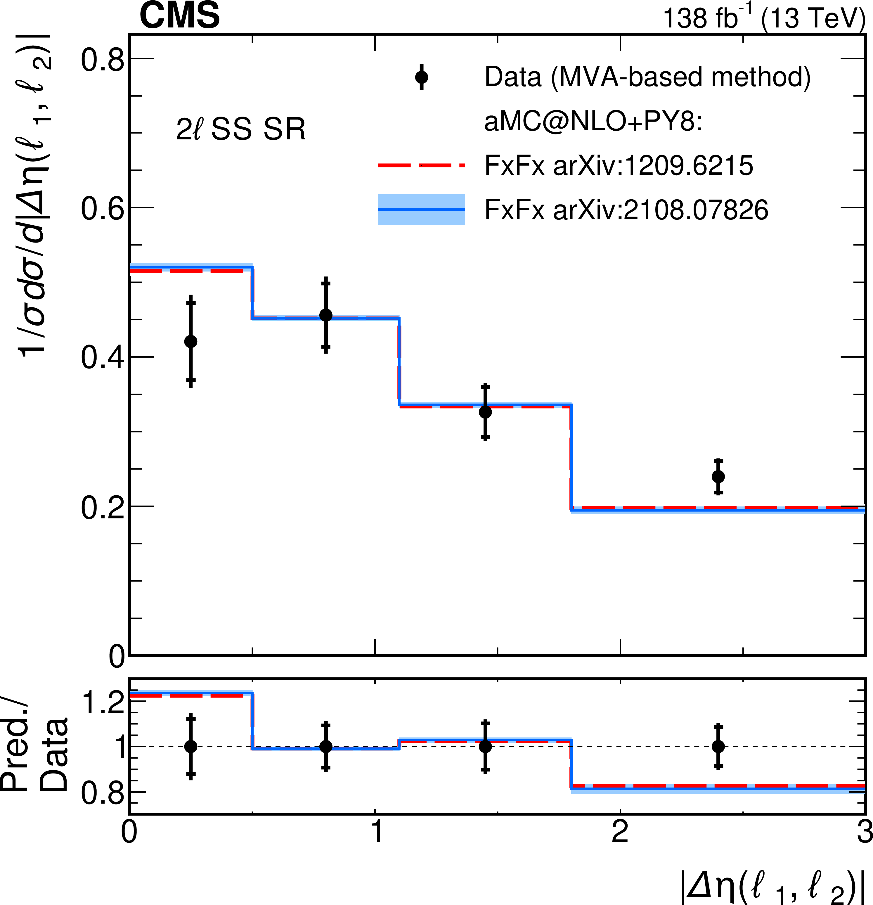 The $ p $-values from the $ \chi^2 $ goodness-of-fit tests comparing the absolute (column 1 and 2) and normalized (column 3 and 4) differential cross sections predicted by the new FxFx model [17] with the two measurements in the 2 $ \ell\mkern1mu\text{SS} $ region. |