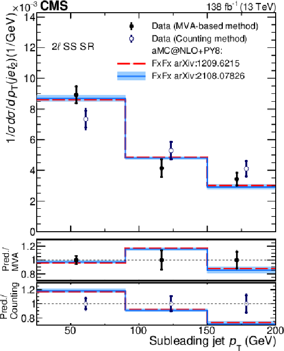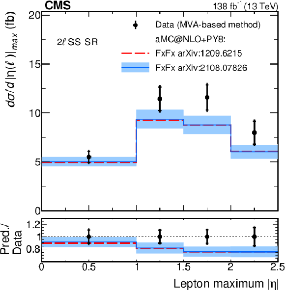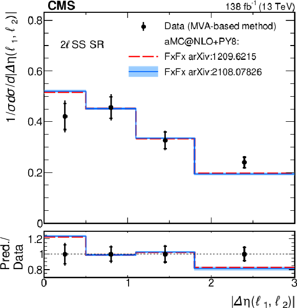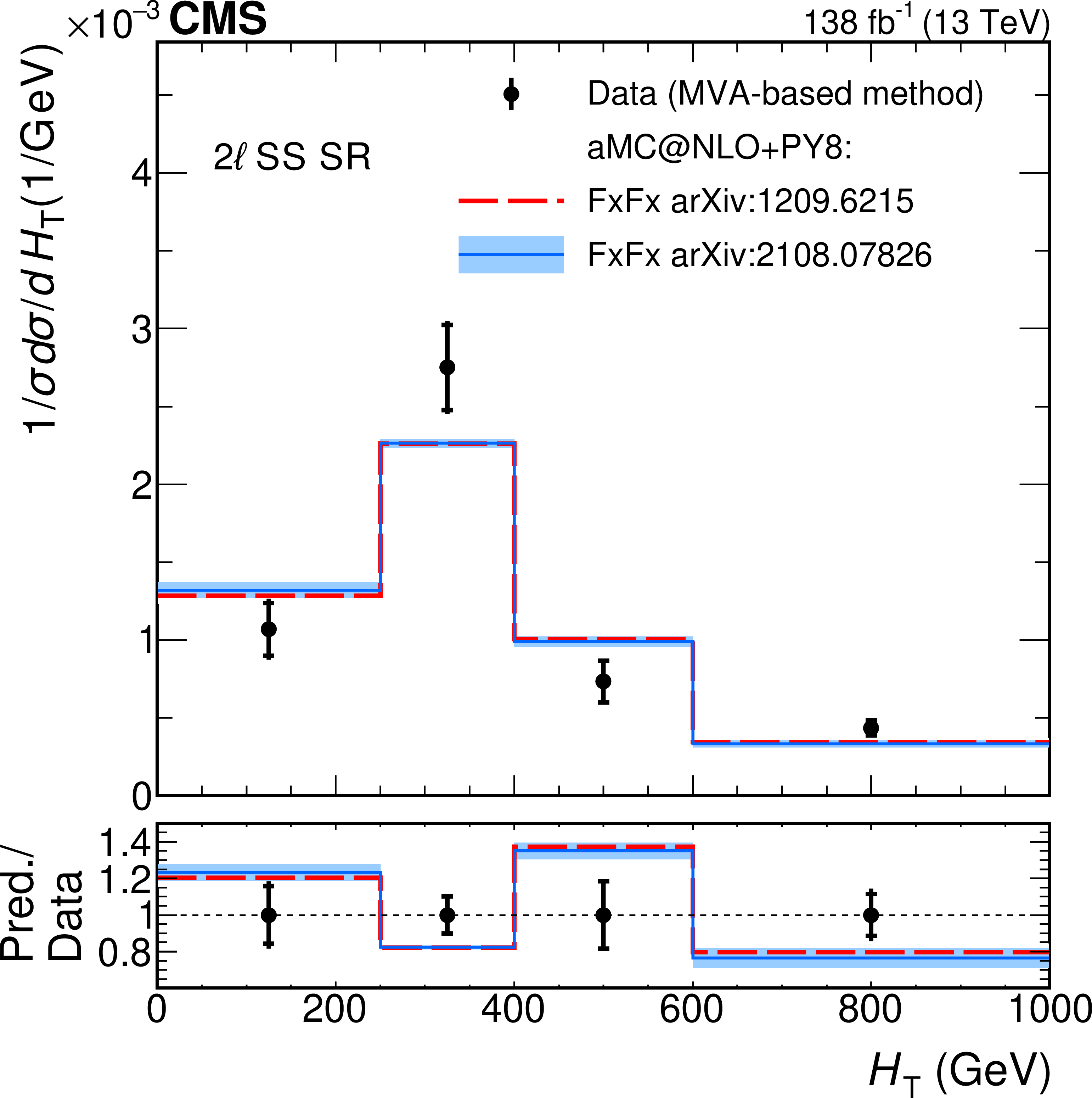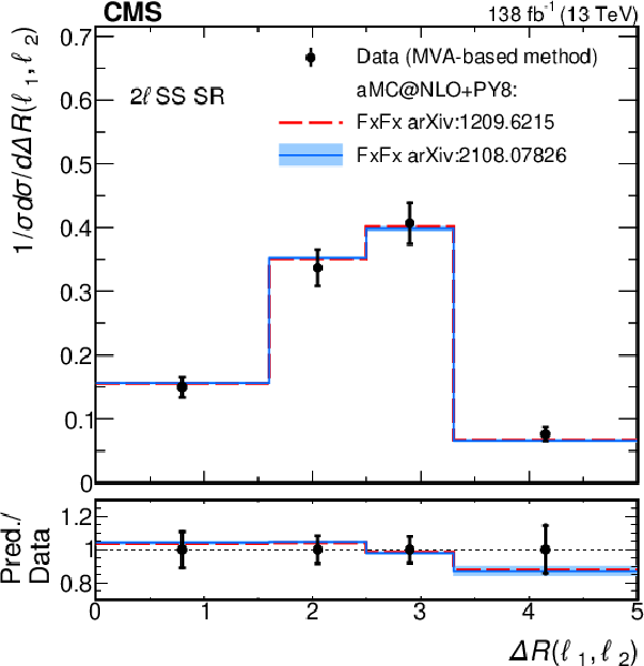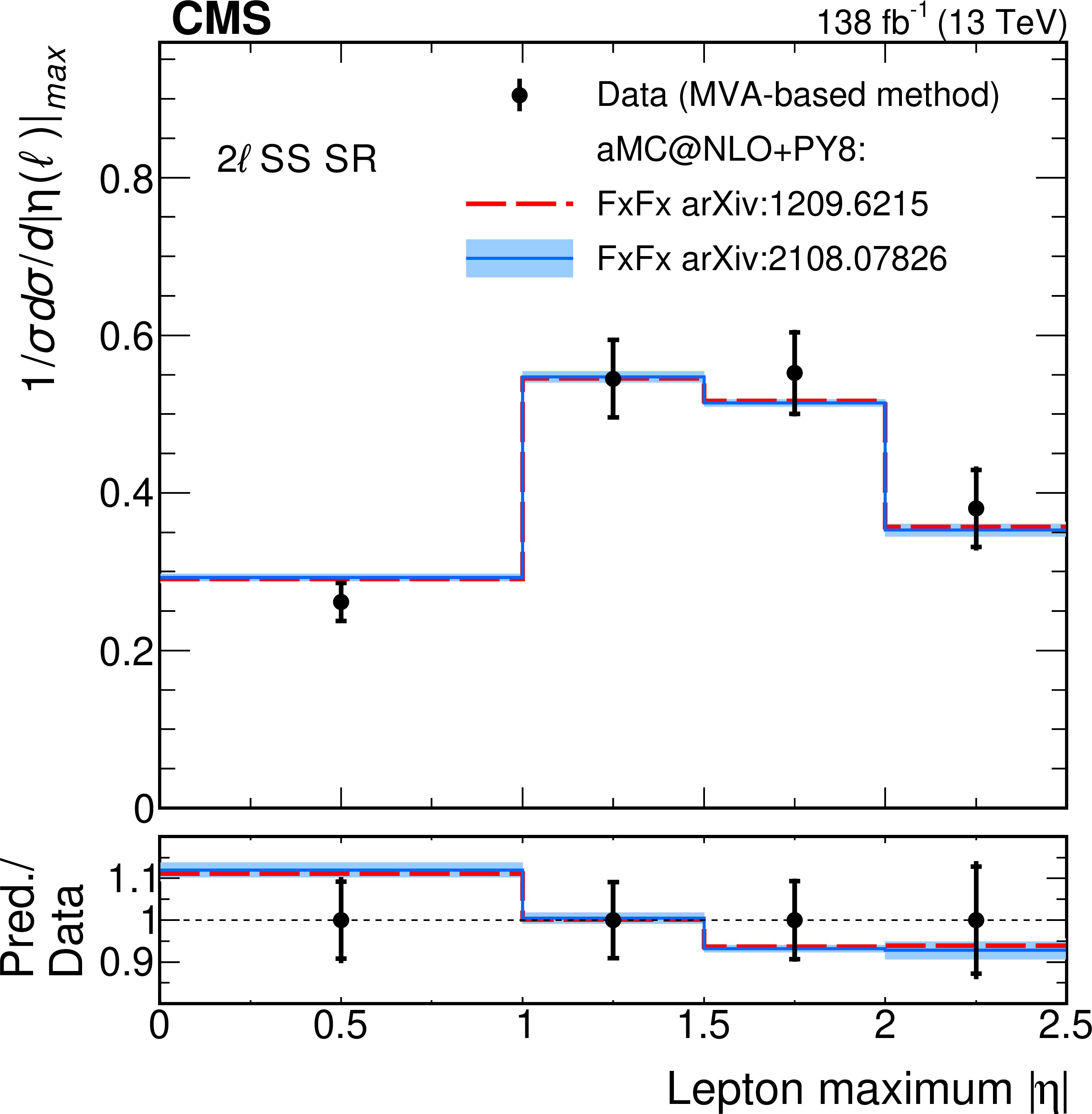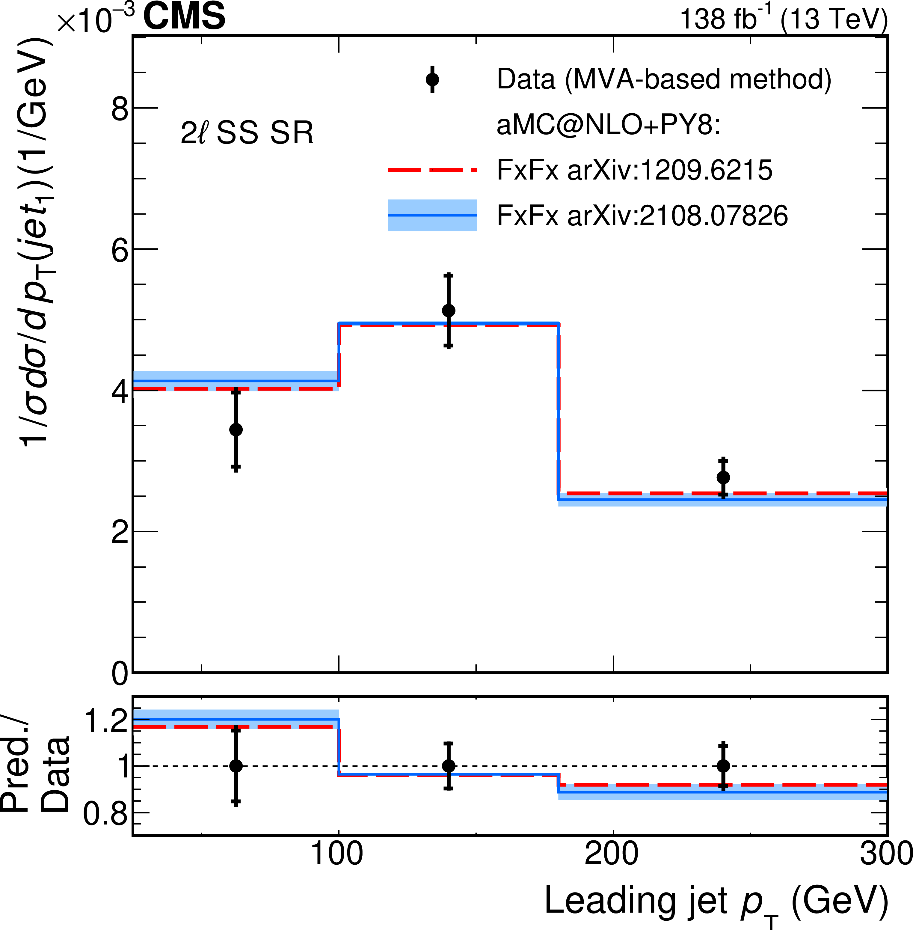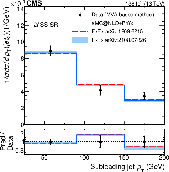 The $ p $-values from the $ \chi^2 $ goodness-of-fit tests comparing the absolute (column 1 and 2) and normalized (column 3 and 4) differential cross sections predicted by the new FxFx model [17] with the two measurements in the 2 $ \ell\mkern1mu\text{SS} $ region. |