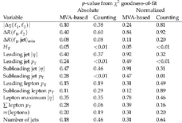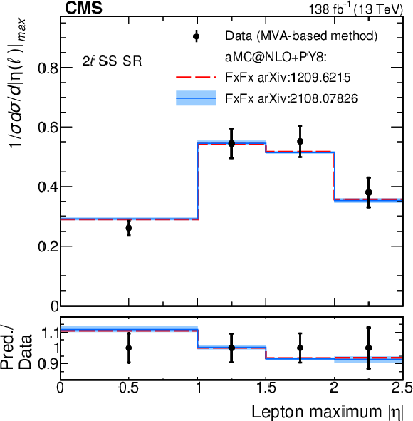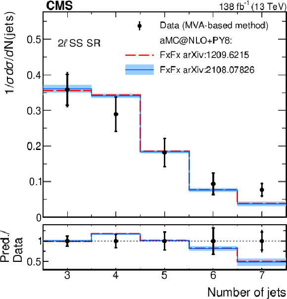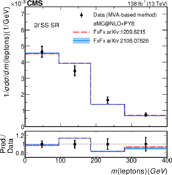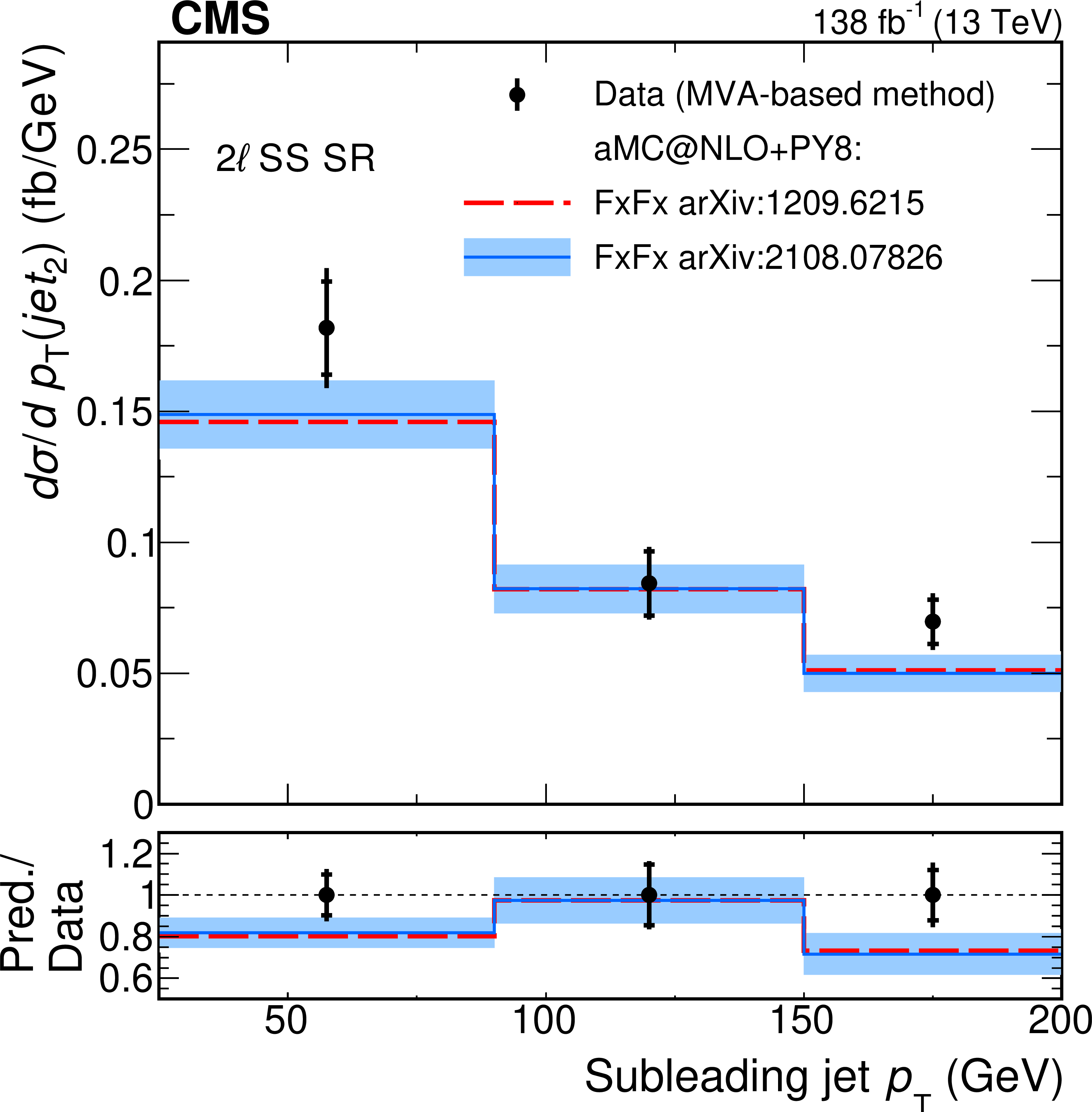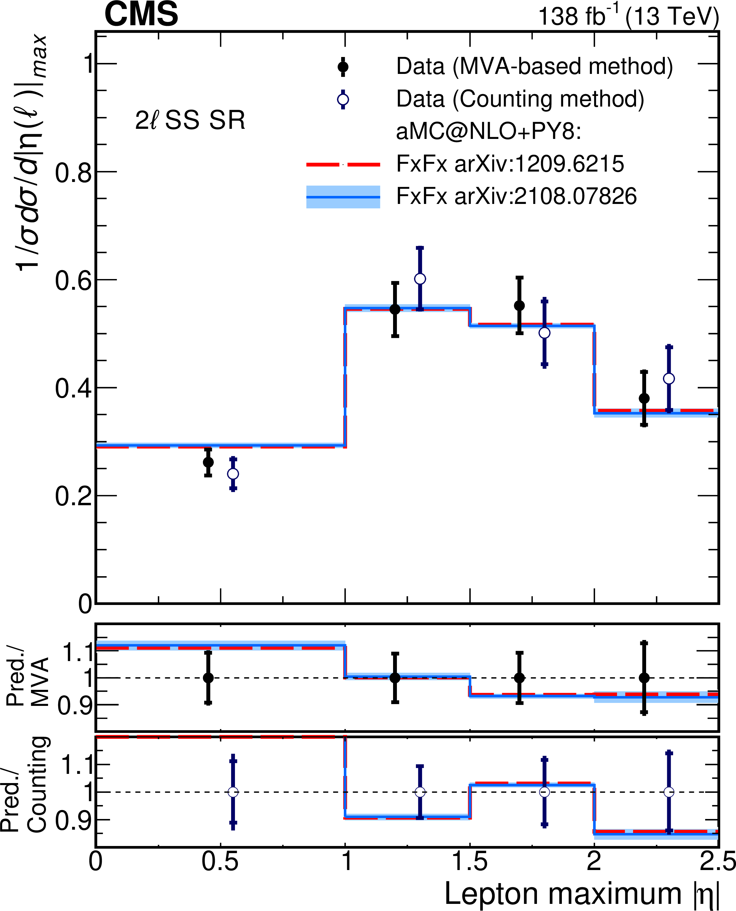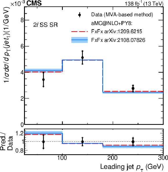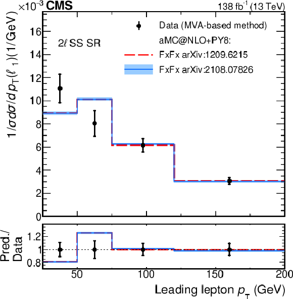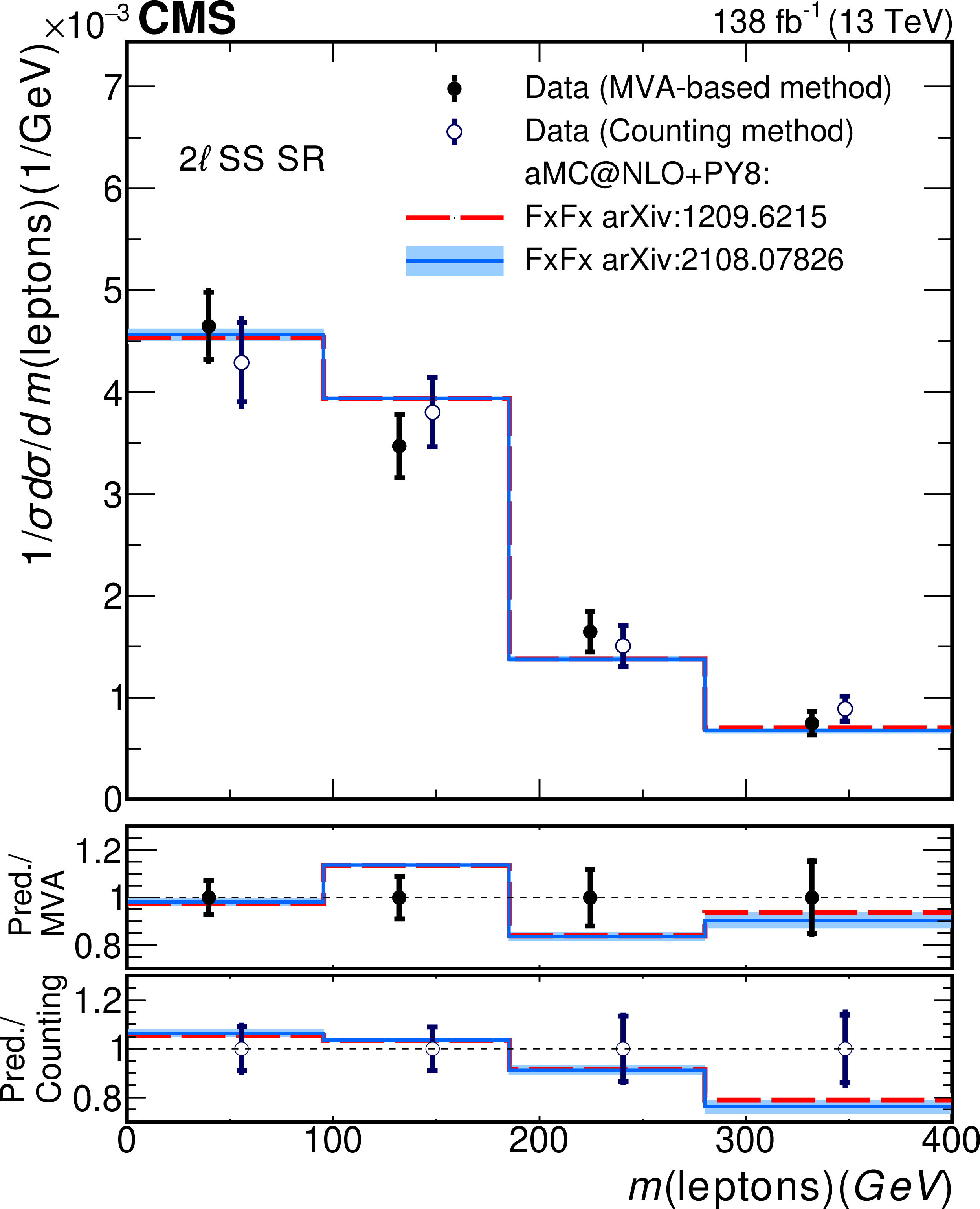 The $ p $-values from the $ \chi^2 $ goodness-of-fit tests comparing the absolute (column 1 and 2) and normalized (column 3 and 4) differential cross sections predicted by the new FxFx model [17] with the two measurements in the 2 $ \ell\mkern1mu\text{SS} $ region. |