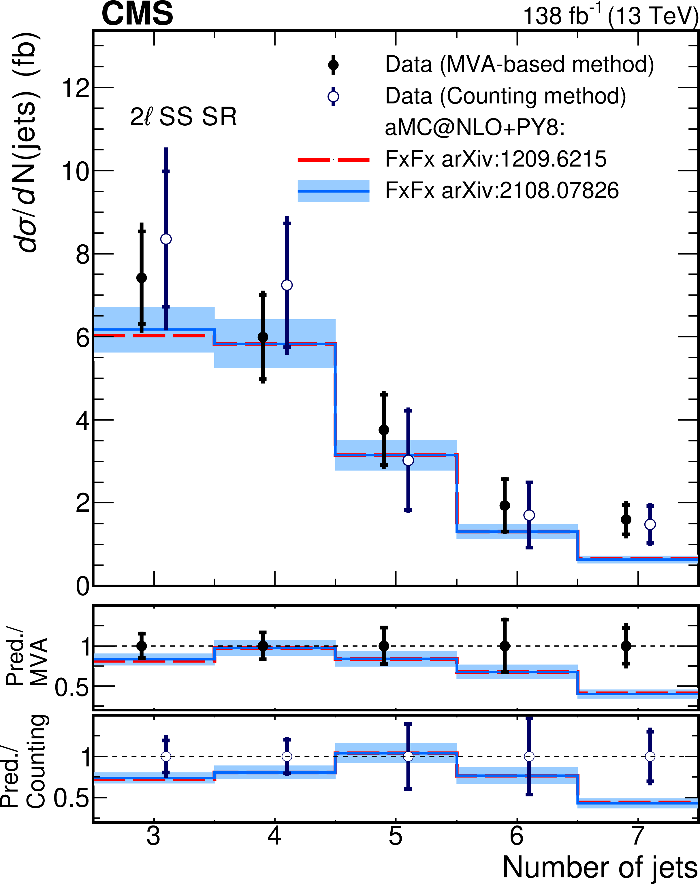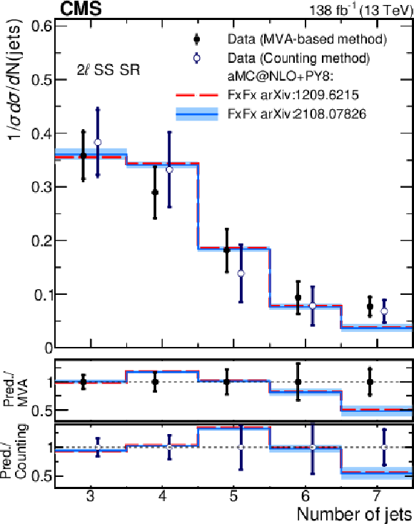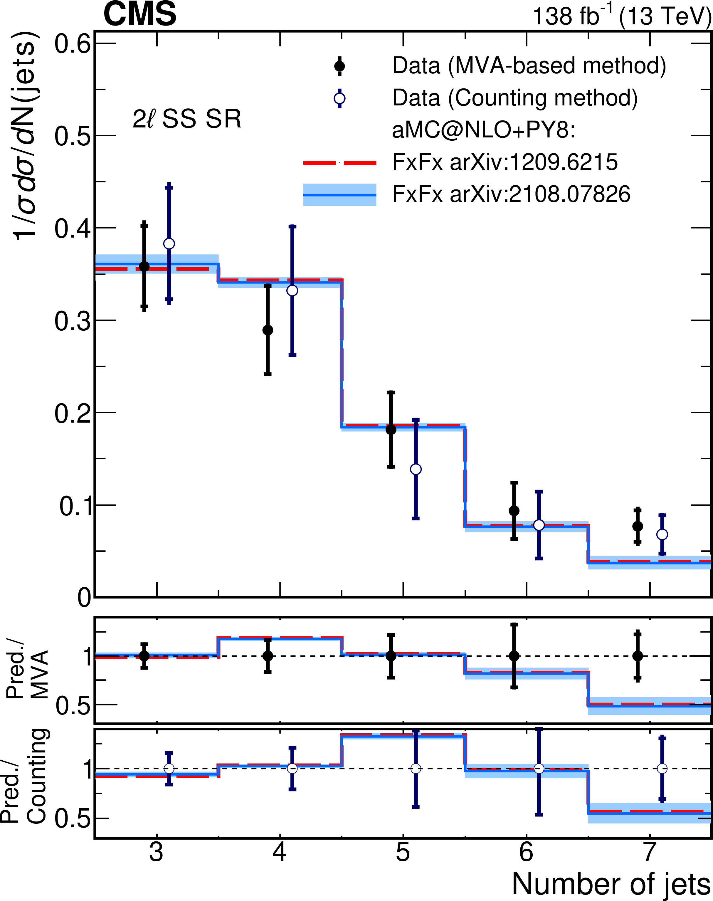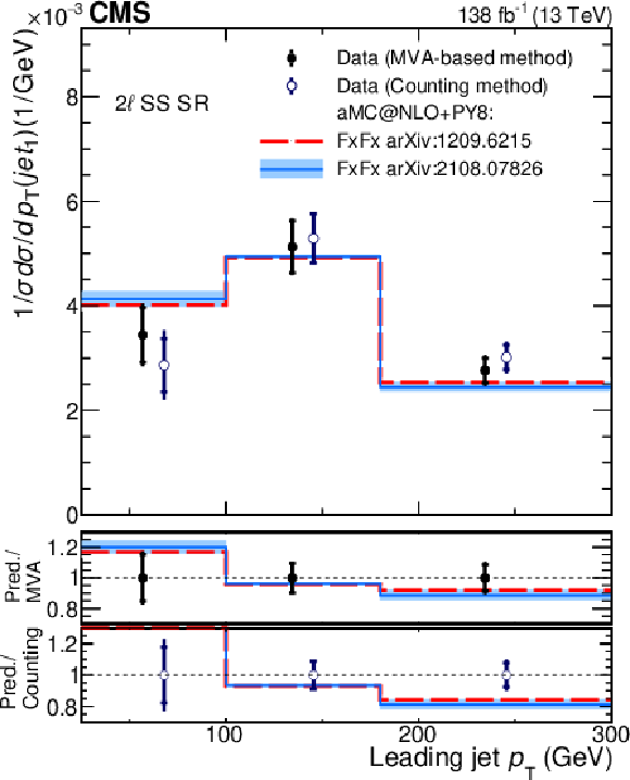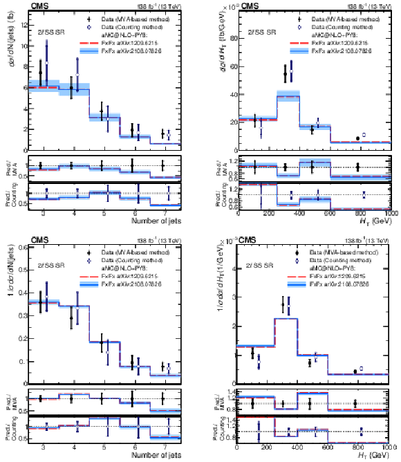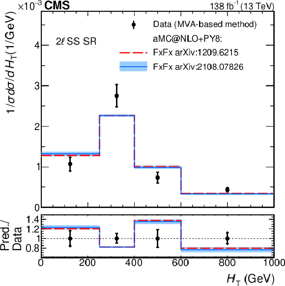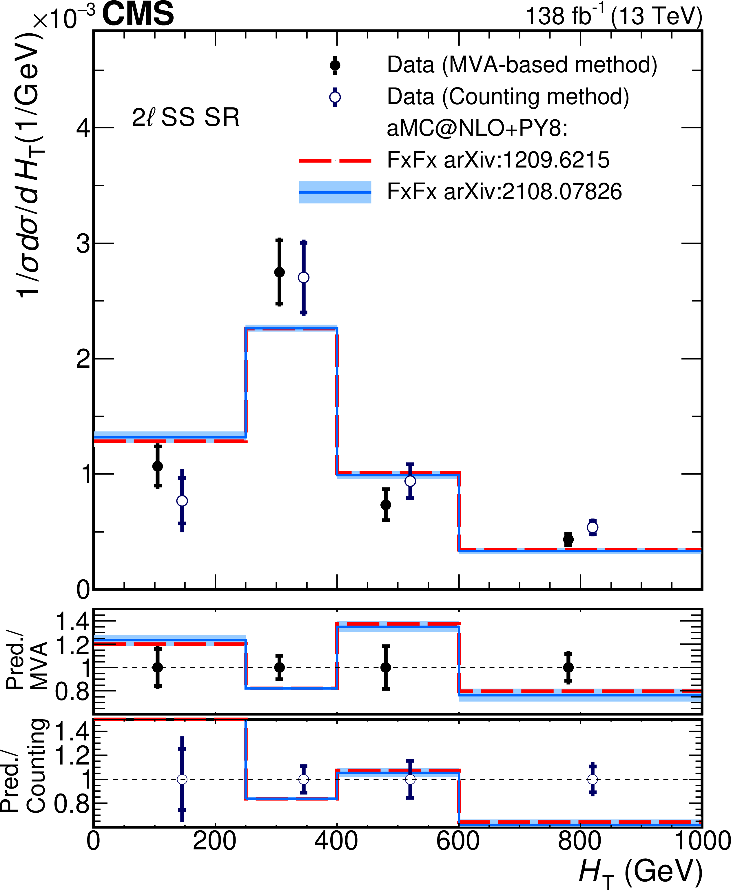Absolute (upper row) and normalized (lower row) differential cross section measured as a function of the jet multiplicity (left) and $ H_{\mathrm{T}} $ (right), using the MVA-based method. The upper panels show the results of the measurement together with the theoretical predictions. The blue band shows the uncertainty of the prediction from Ref. [17]. The lower panels show the ratio between the predictions and the measurement. The vertical lines on the unfolded data points represent the total experimental uncertainty of the unfolded cross section, while the horizontal bars show the statistical component of the uncertainty. |