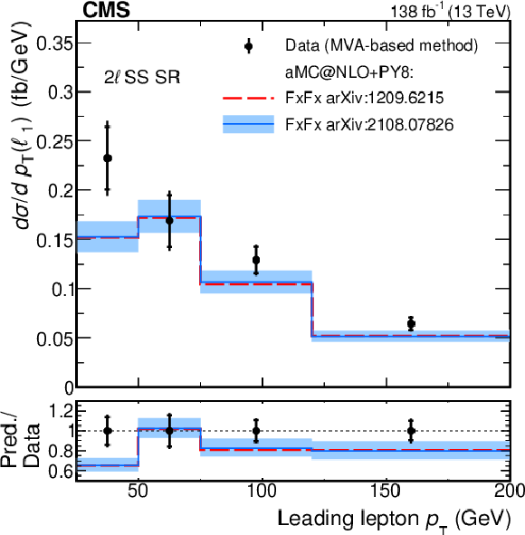 Absolute (upper row) and normalized (lower row) differential cross section measured as a function of the leading (left) and subleading (right) lepton $ p_{\mathrm{T}} $, using the MVA-based method. The upper panels show the results of the measurement together with the theoretical predictions. The blue band shows the uncertainty of the prediction from Ref. [17]. The lower panels show the ratio between the predictions and the measurement. The vertical lines on the unfolded data points represent the total experimental uncertainty of the unfolded cross section, while the horizontal bars show the statistical component of the uncertainty. |