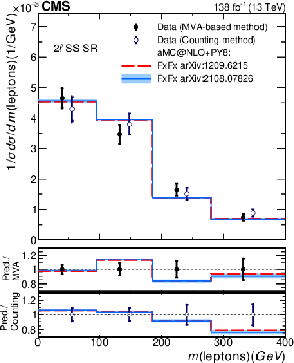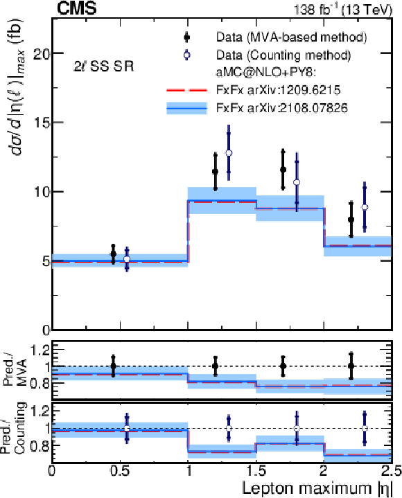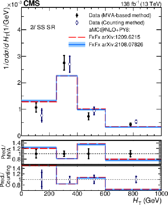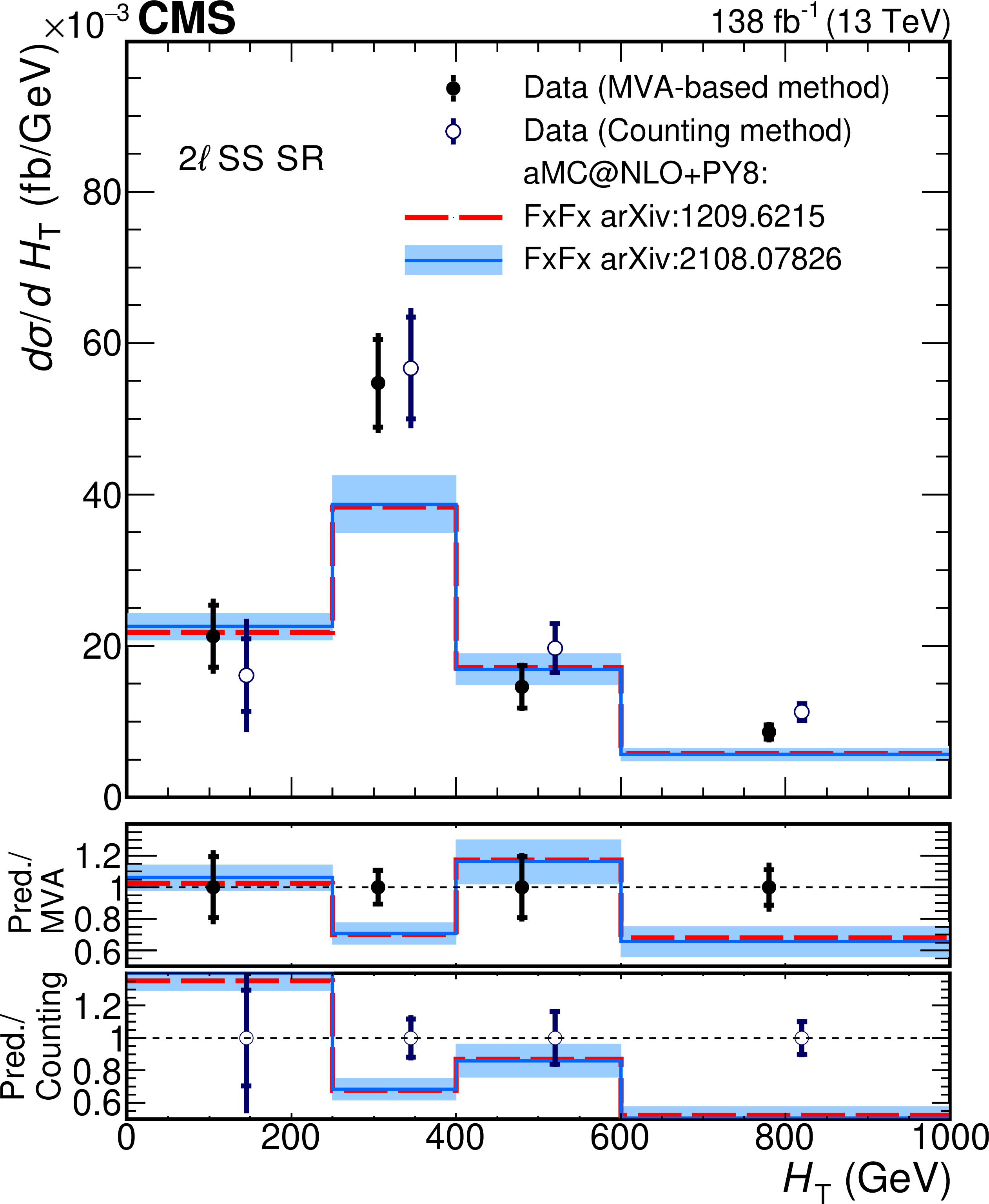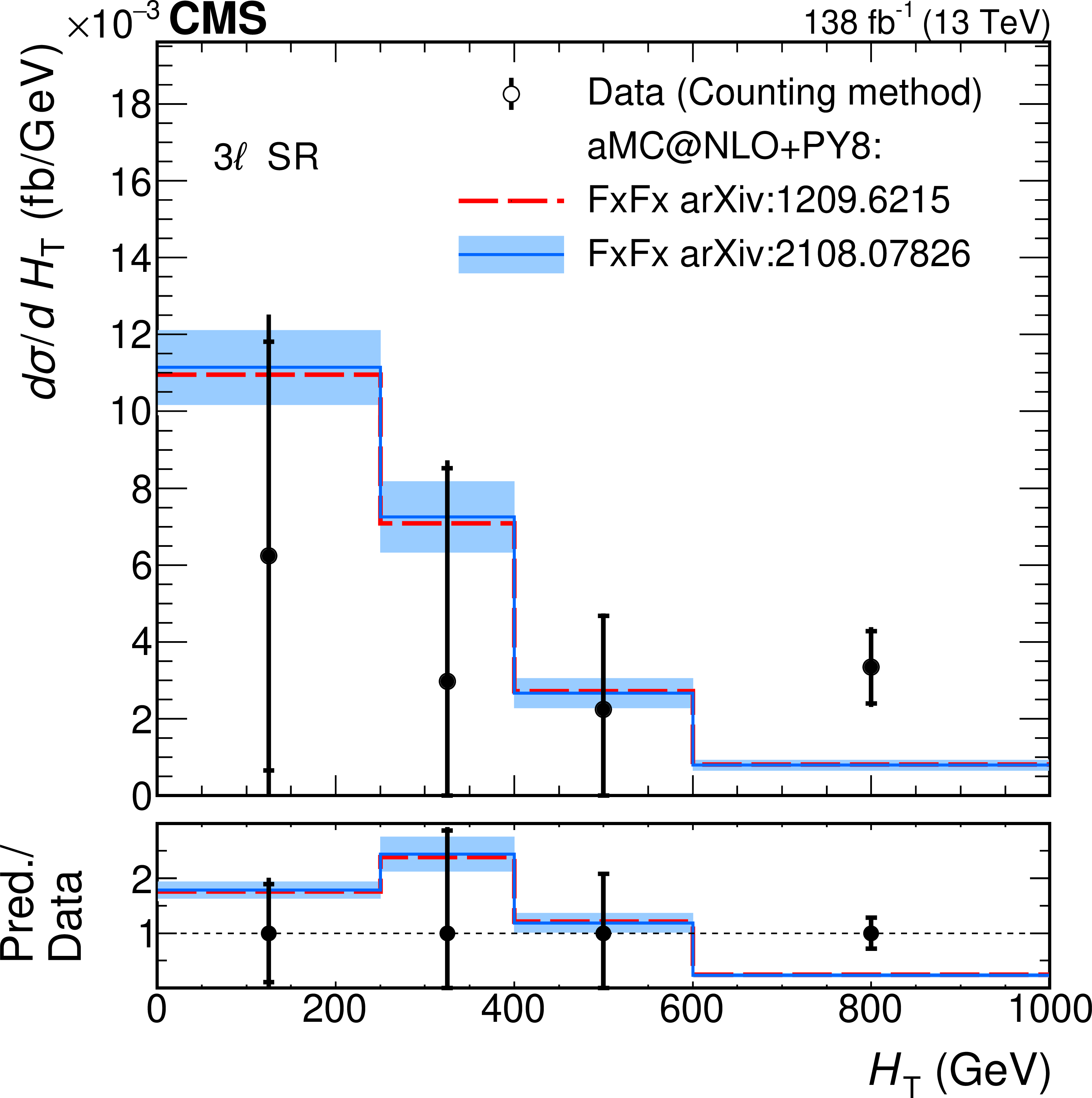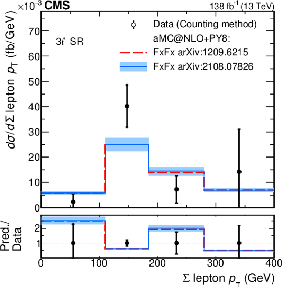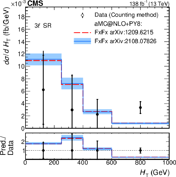Absolute differential cross section measured as a function of the $ H_{\mathrm{T}} $ (left) and the scalar sum of the lepton $ p_{\mathrm{T}} $'s, using the counting method in the 3 $ \ell $ SR. The upper panels show the results of the measurement together with the theoretical predictions. The blue band shows the uncertainty of the prediction from Ref. [17]. The lower panels show the ratio between the predictions and the measurement. The vertical lines on the unfolded data points represent the total experimental uncertainty of the unfolded cross section, while the horizontal bars show the statistical component of the uncertainty. |