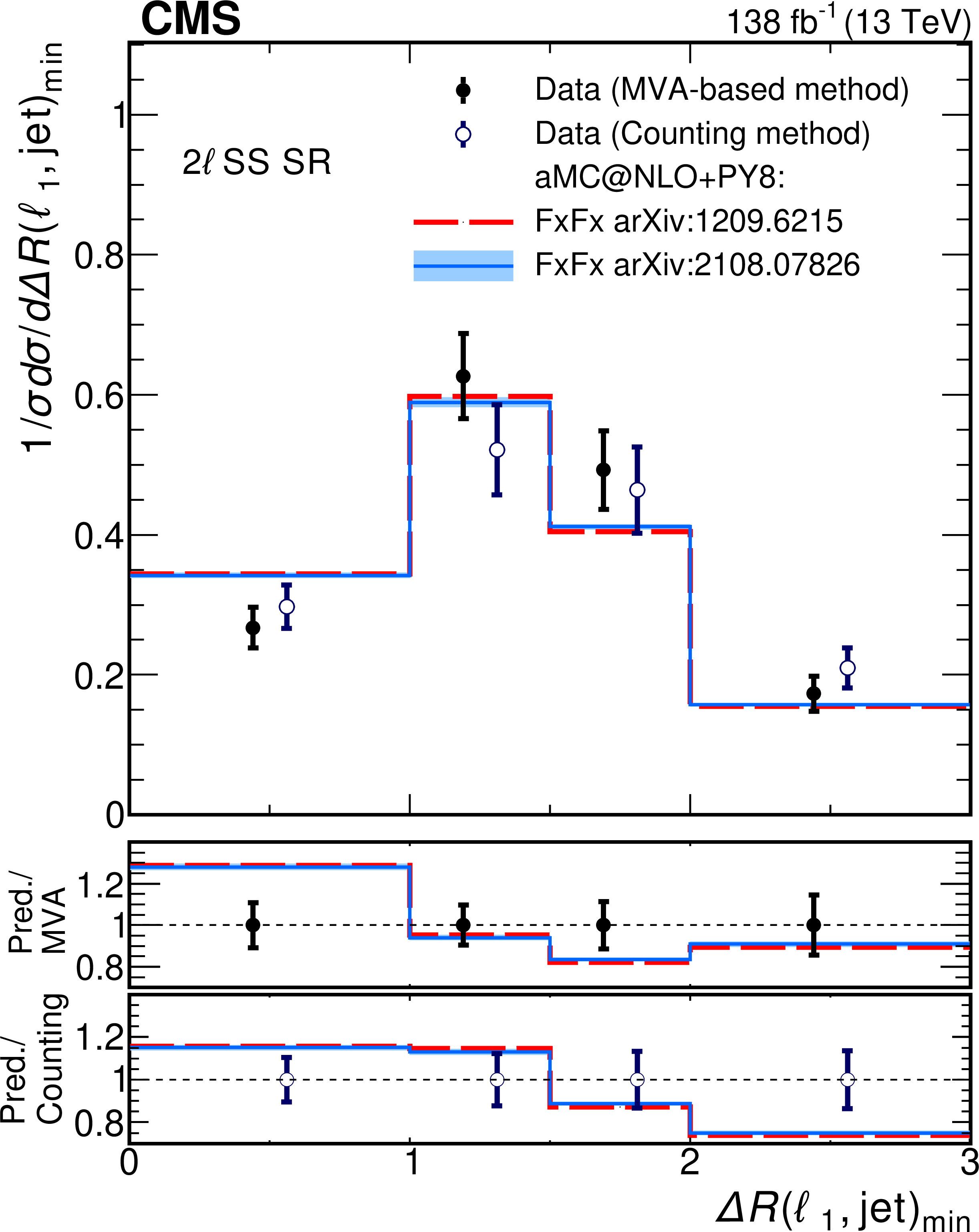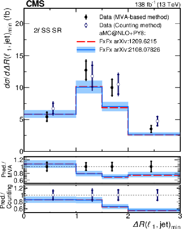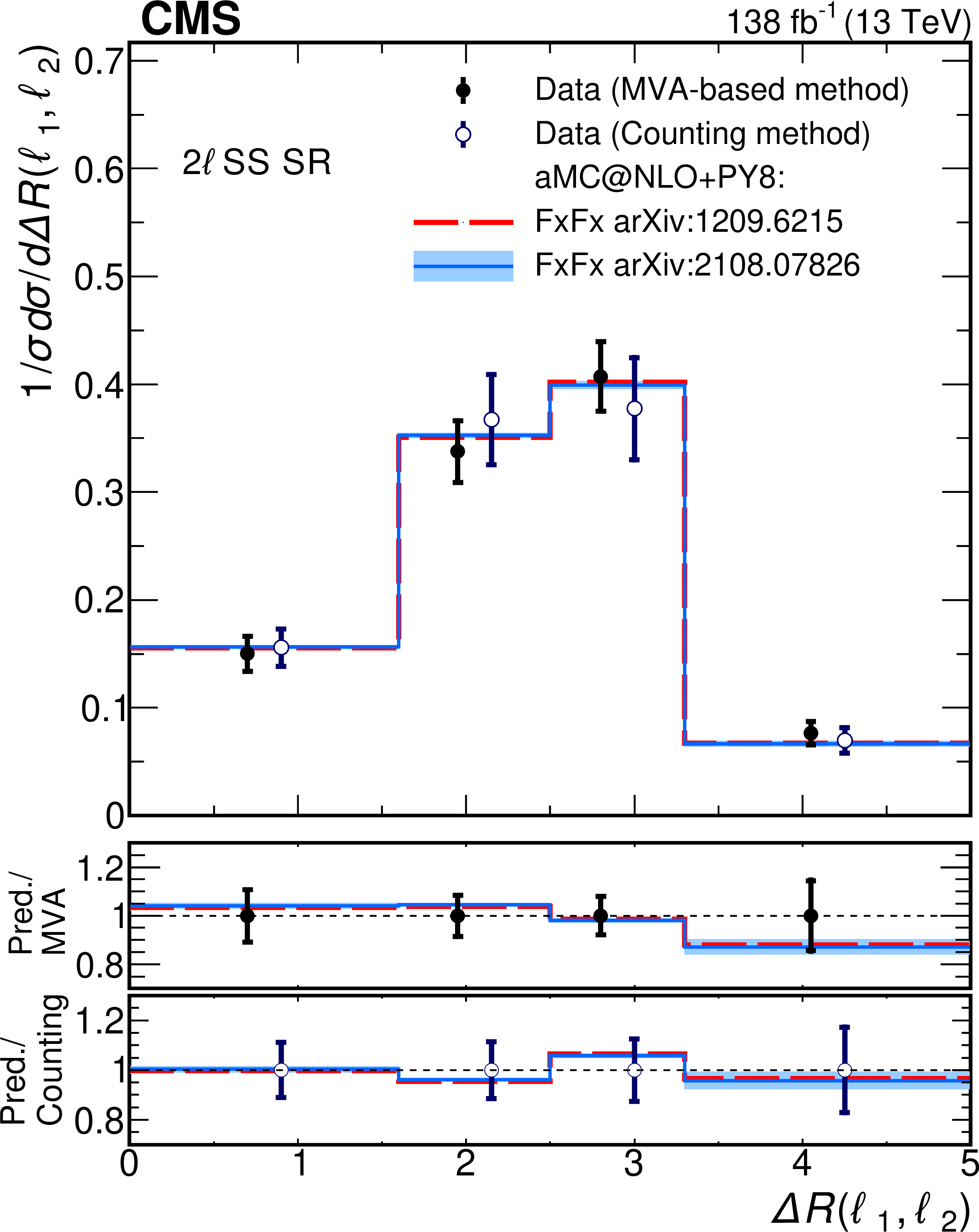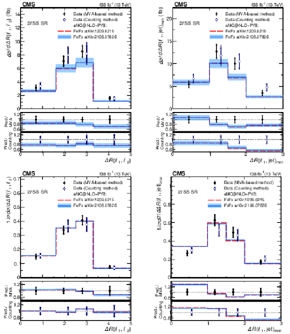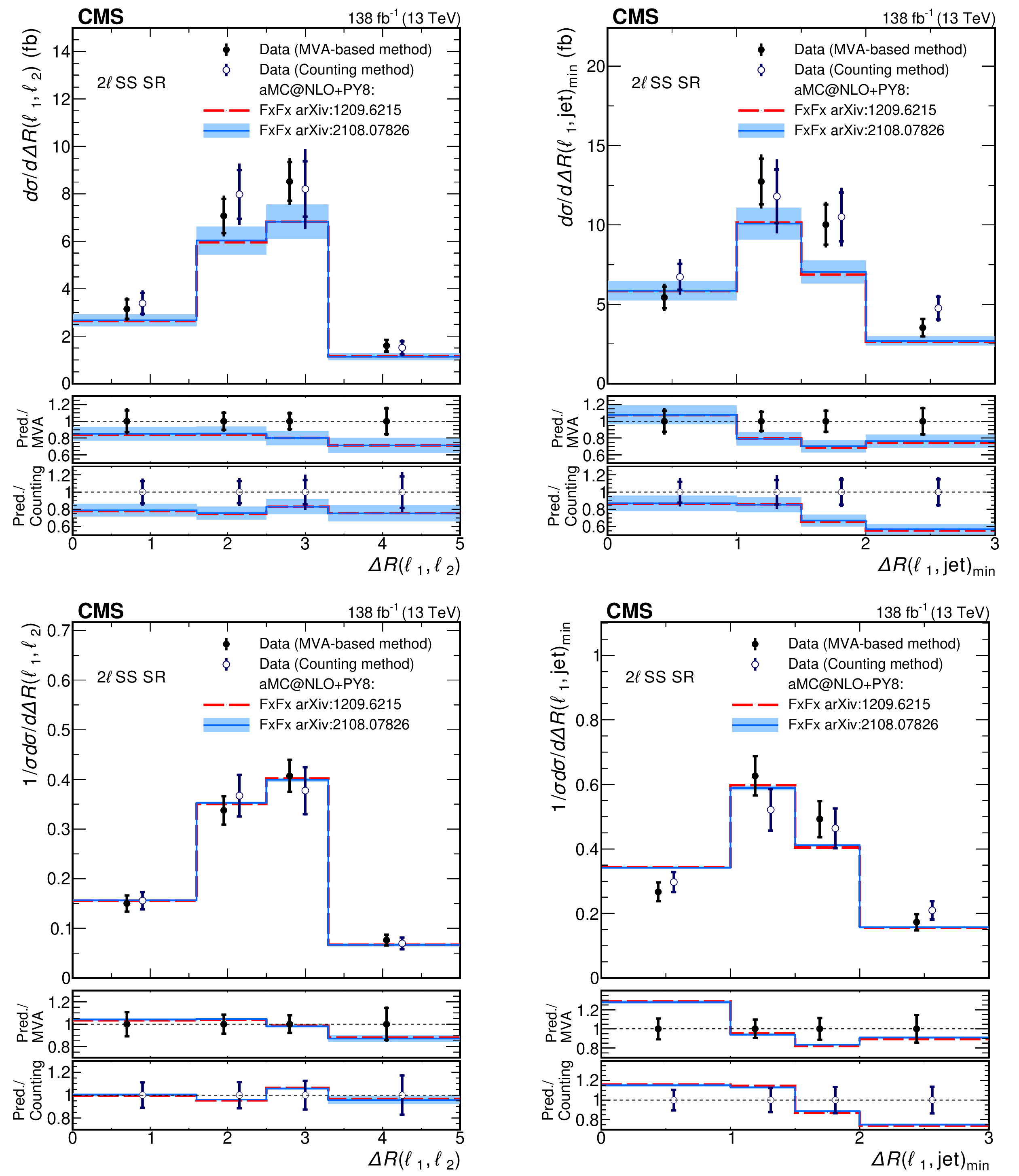 Absolute (upper row) and normalized (lower row) differential cross section measured as a function of the $ \Delta R(\ell_1, \ell_2) $ and the $ \Delta R(\ell_1, jet)_{\text{min}} $, using the MVA-based and the counting method. The upper panels show the results of the two measurements together with the theoretical predictions. The blue band shows the uncertainty of the prediction from Ref. [17]. Each two lower panels shows the ratio between the predictions and each of the measurements. The vertical lines on the unfolded data points represent the total experimental uncertainty of the unfolded cross section, while the horizontal bars show the statistical component of the uncertainty. |