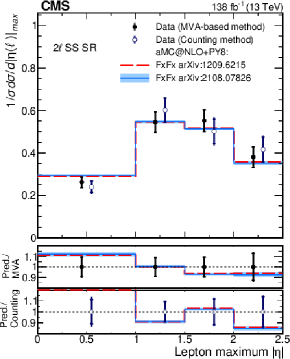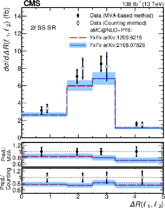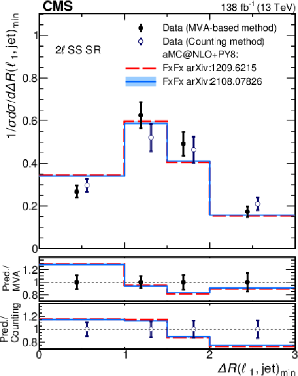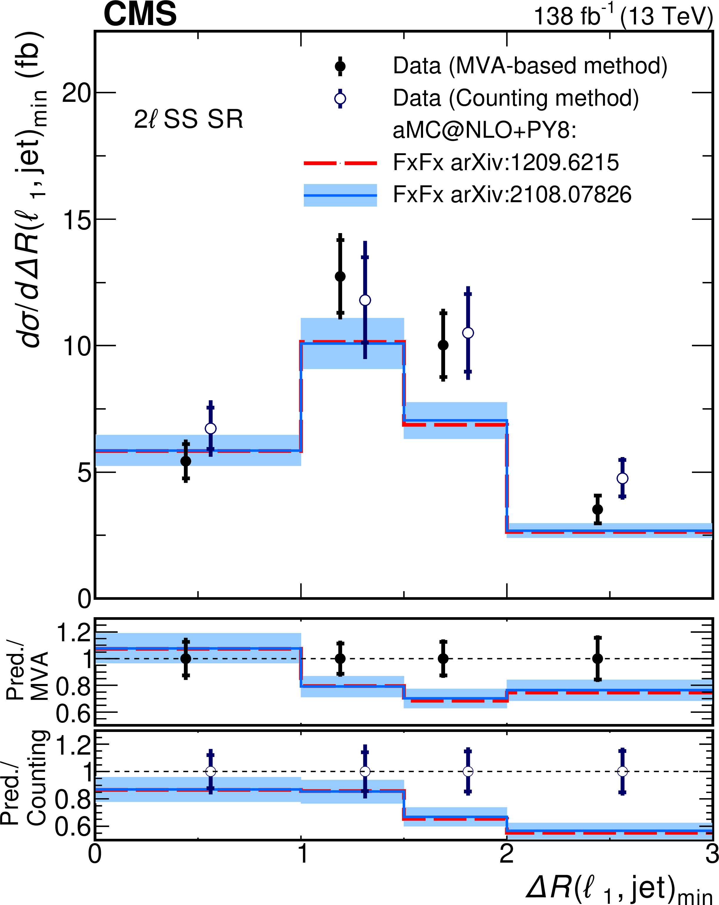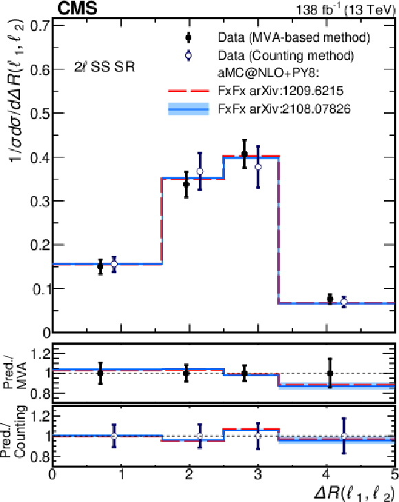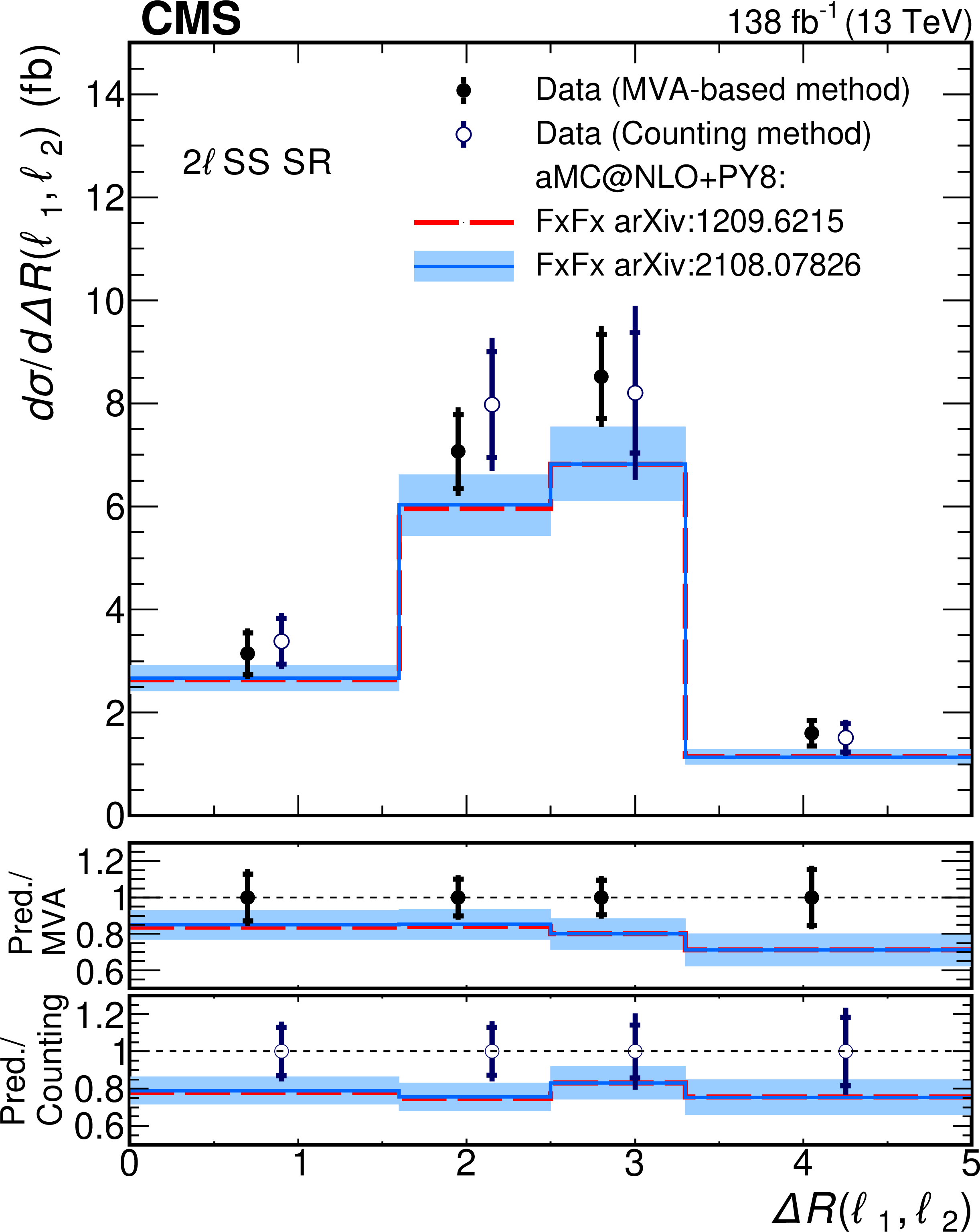 Absolute (upper row) and normalized (lower row) differential cross section measured as a function of the $ \Delta R(\ell_1, \ell_2) $ and the $ \Delta R(\ell_1, jet)_{\text{min}} $, using the MVA-based and the counting method. The upper panels show the results of the two measurements together with the theoretical predictions. The blue band shows the uncertainty of the prediction from Ref. [17]. Each two lower panels shows the ratio between the predictions and each of the measurements. The vertical lines on the unfolded data points represent the total experimental uncertainty of the unfolded cross section, while the horizontal bars show the statistical component of the uncertainty. |
