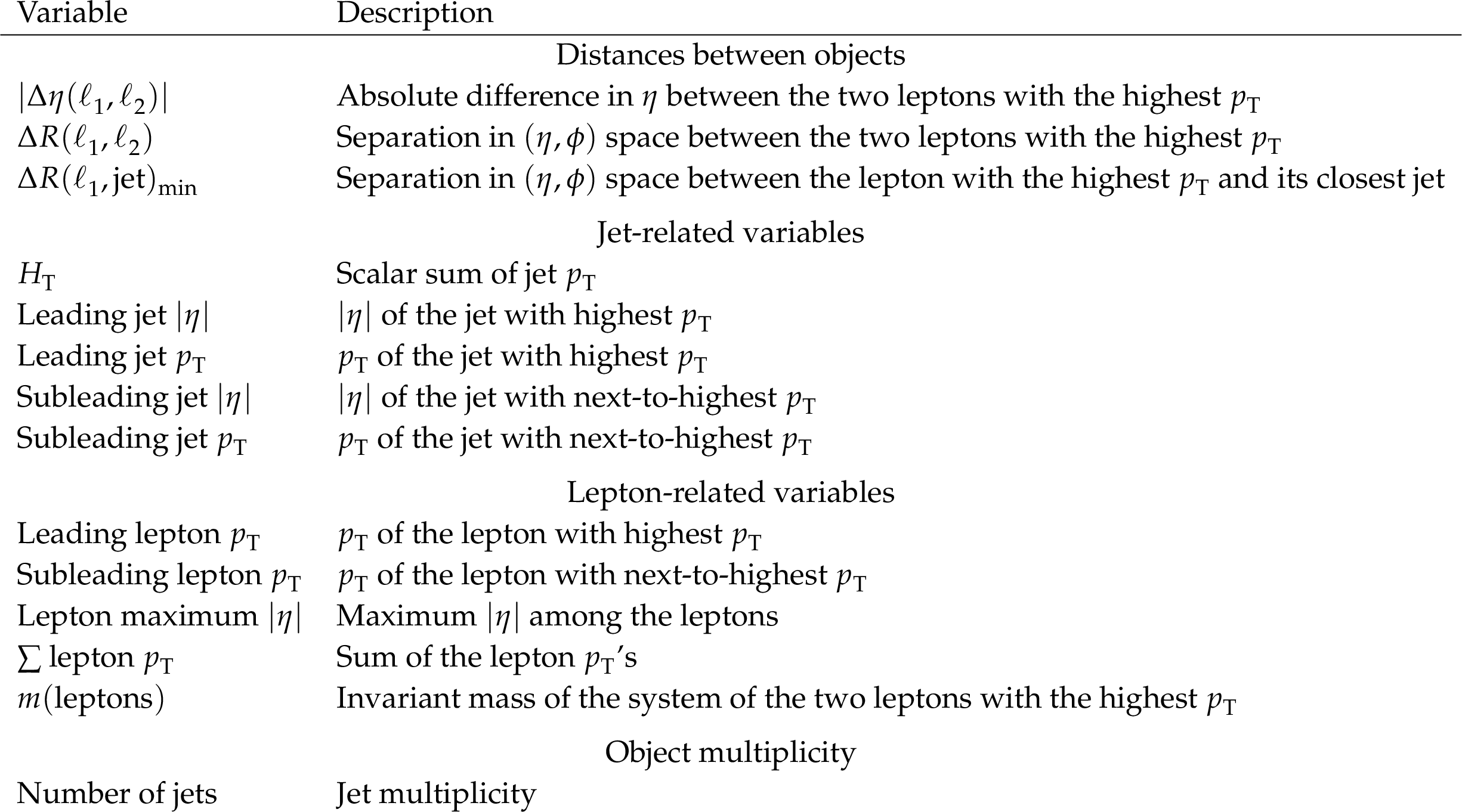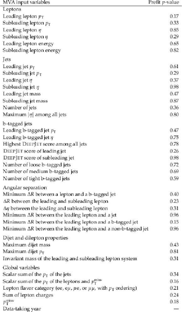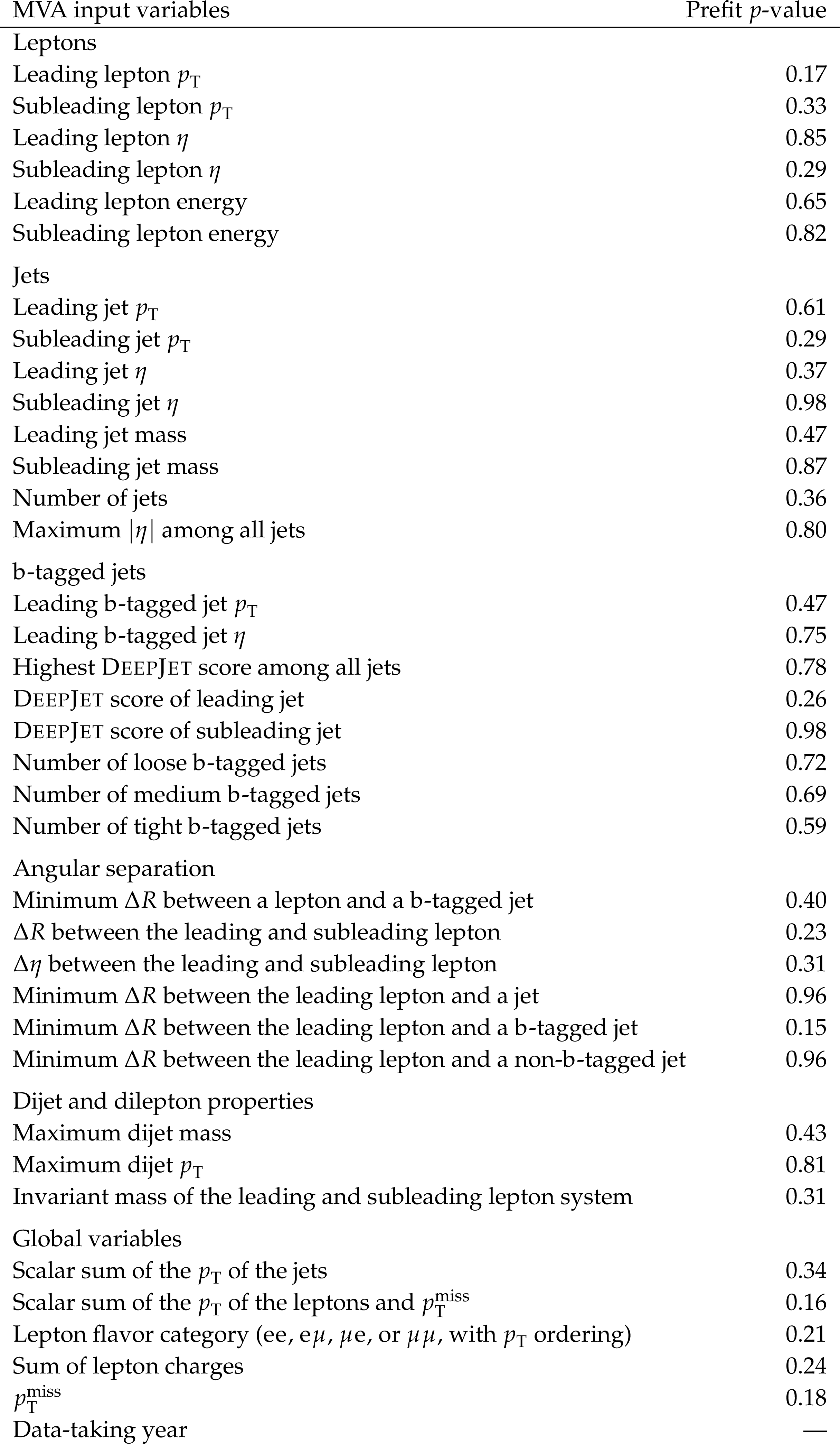 Overview of input variables to the BDT and their prefit $ p $-values, obtained in a $ \chi^2 $ goodness-of-fit test. |