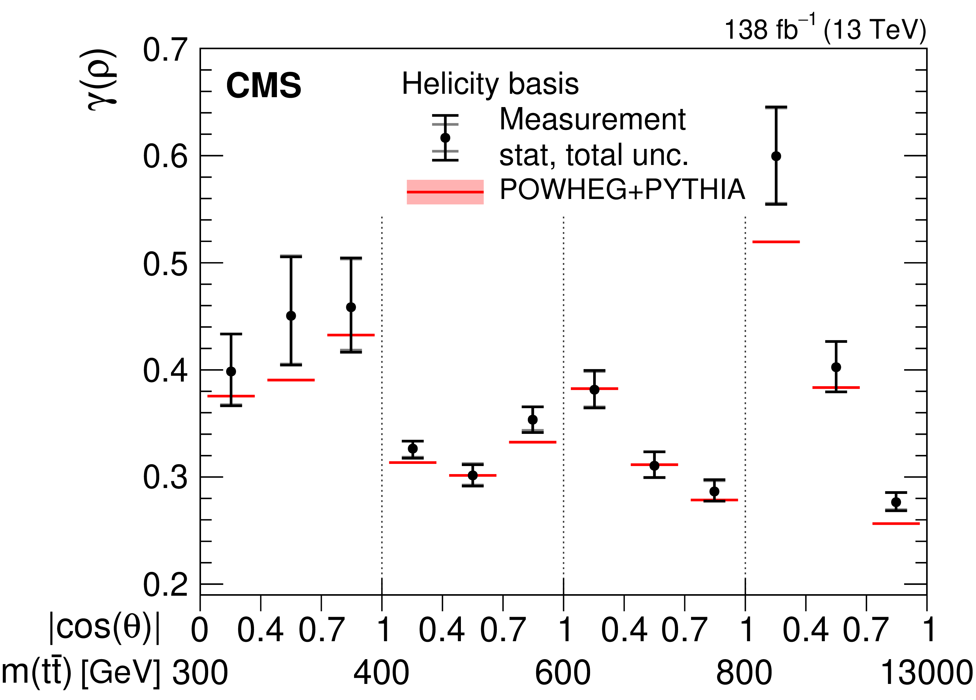 Results of the purity $ \gamma(\rho) $ (upper) and entropy $ S(\rho) $ (lower) measurements in bins of $ m({\mathrm{t}\overline{\mathrm{t}}} ) $ vs. $ |\cos(\theta)| $ in the helicity (left) and beam (right) basis. The measurements (markers) are shown with the statistical (inner error bars) and total (outer error bars) uncertainty and compared to the predictions from POWHEG + PYTHIA, shown with the ME scale and PDF uncertainties. |
