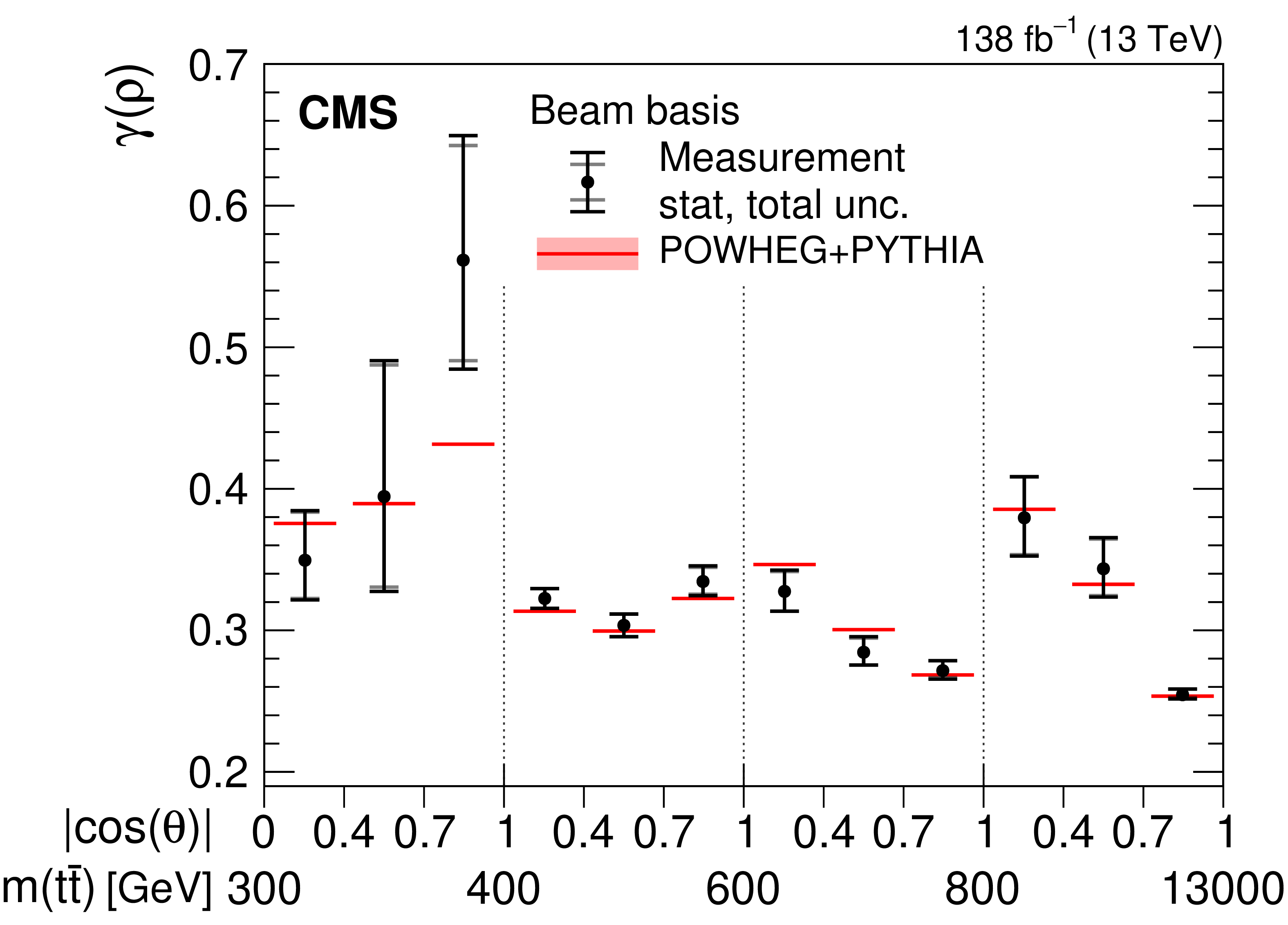 | In summary, the spin correlation measurements of the top quark-antiquark ($ \mathrm{t} \overline{\mathrm{t}} $) system from Ref. [8] are extended to include results in the beam basis for the first time. This is done with bins in two dimensions, comprising the top quark scattering angle and either the invariant mass of the $ \mathrm{t} \overline{\mathrm{t}} $ system or the transverse momentum of the top quark, using proton-proton collisions at $ \sqrt{s}= $ 13 TeV recorded by the CMS experiment at the LHC, corresponding to an integrated luminosity of 138 fb$ ^{-1} $. The density matrix is decomposed into eigenstates, which are identified as Bell states in the helicity basis and spin states in the beam basis. We also present the first experimental results for the purity, von Neumann entropy, and entanglement of the $ \mathrm{t} \overline{\mathrm{t}} $ system in both bases. All the measurements are consistent with standard model expectations. |