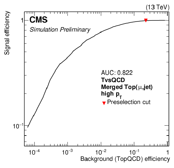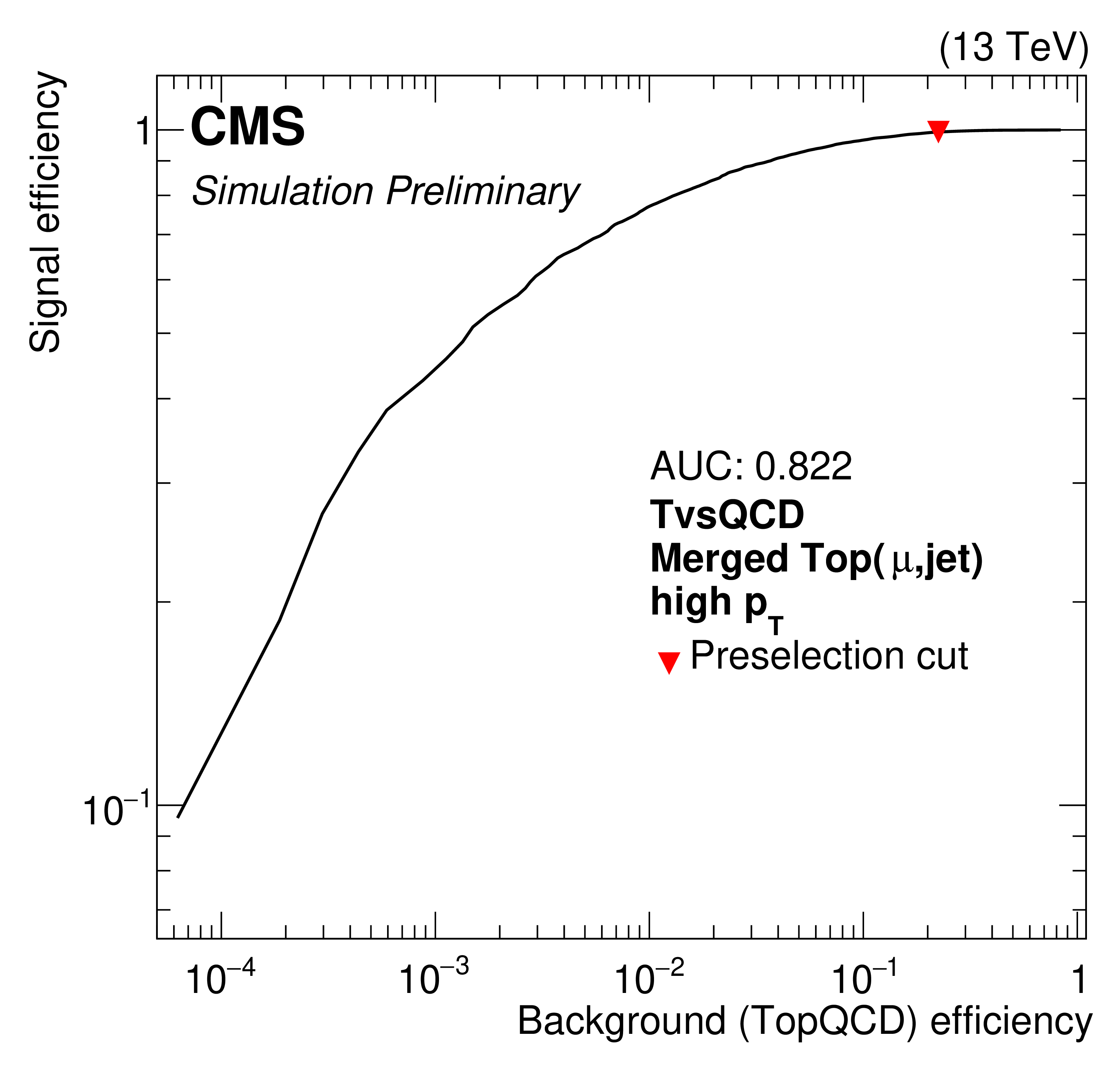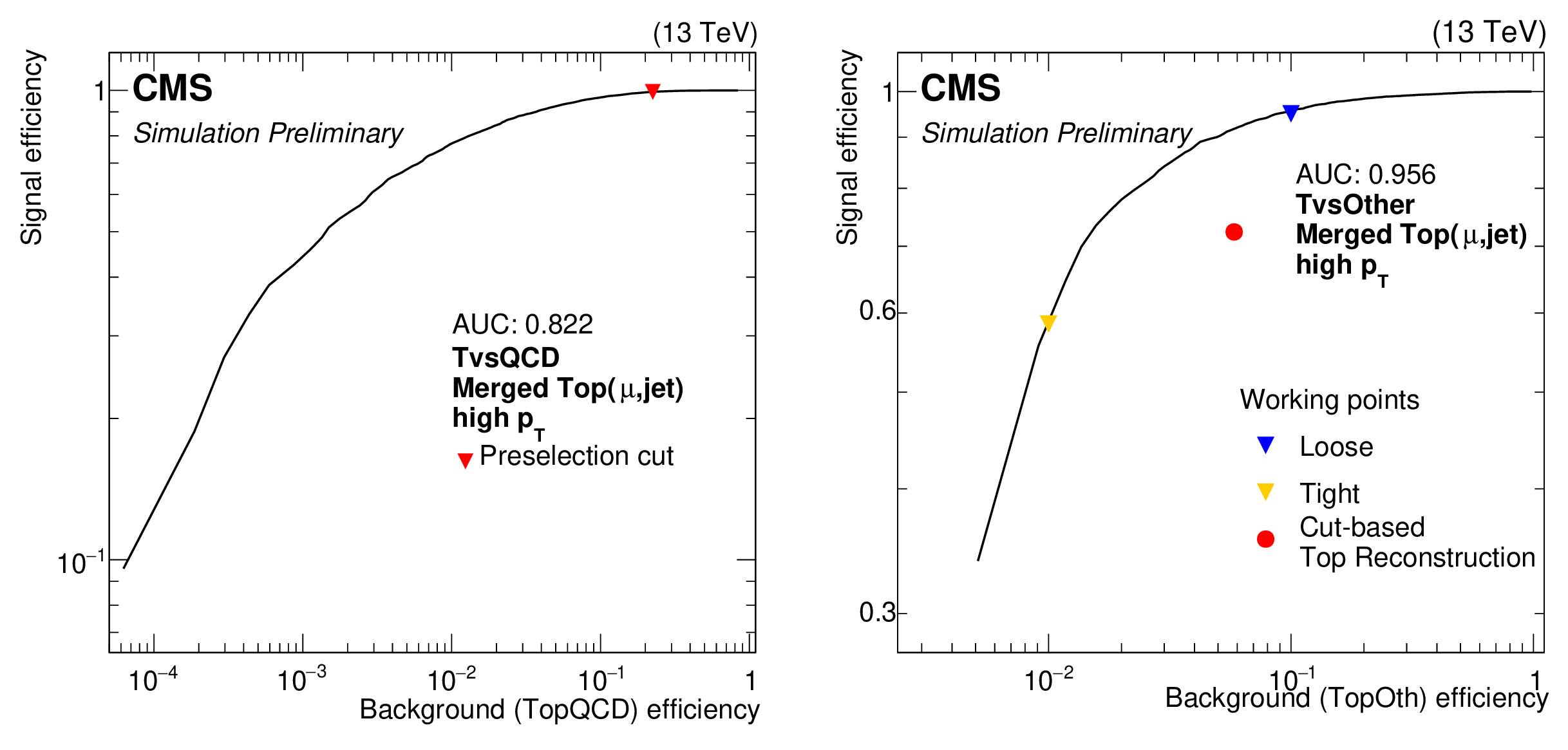 ROC curves for the TopVsQCD (left) and TopVsOther (right) top taggers. The signal efficiency and background fake rate are evaluated on top quark candidates with an associated muon, with $ p_{\mathrm{T}} > $ 500 GeV and in the merged configuration in simulated $ \mathrm{t} \overline{\mathrm{t}} $ events. The red triangle in the left plot corresponds to the requirement on the TopVsQCD variable providing a signal efficiency of 99%; the blue and the yellow triangles in the right plot correspond to the loose and tight WP cuts on the TopVsOther variable, respectively. A comparison with a cut-based selection (red point) is also shown in the TopVsOther case. The cut-based selection requires the lepton to be isolated and applies a b tagging score threshold with a background efficiency of 1%; the top quark candidate is then chosen as the one with the lowest difference in mass with respect to the nominal top quark mass value taken from Ref. [76]. |